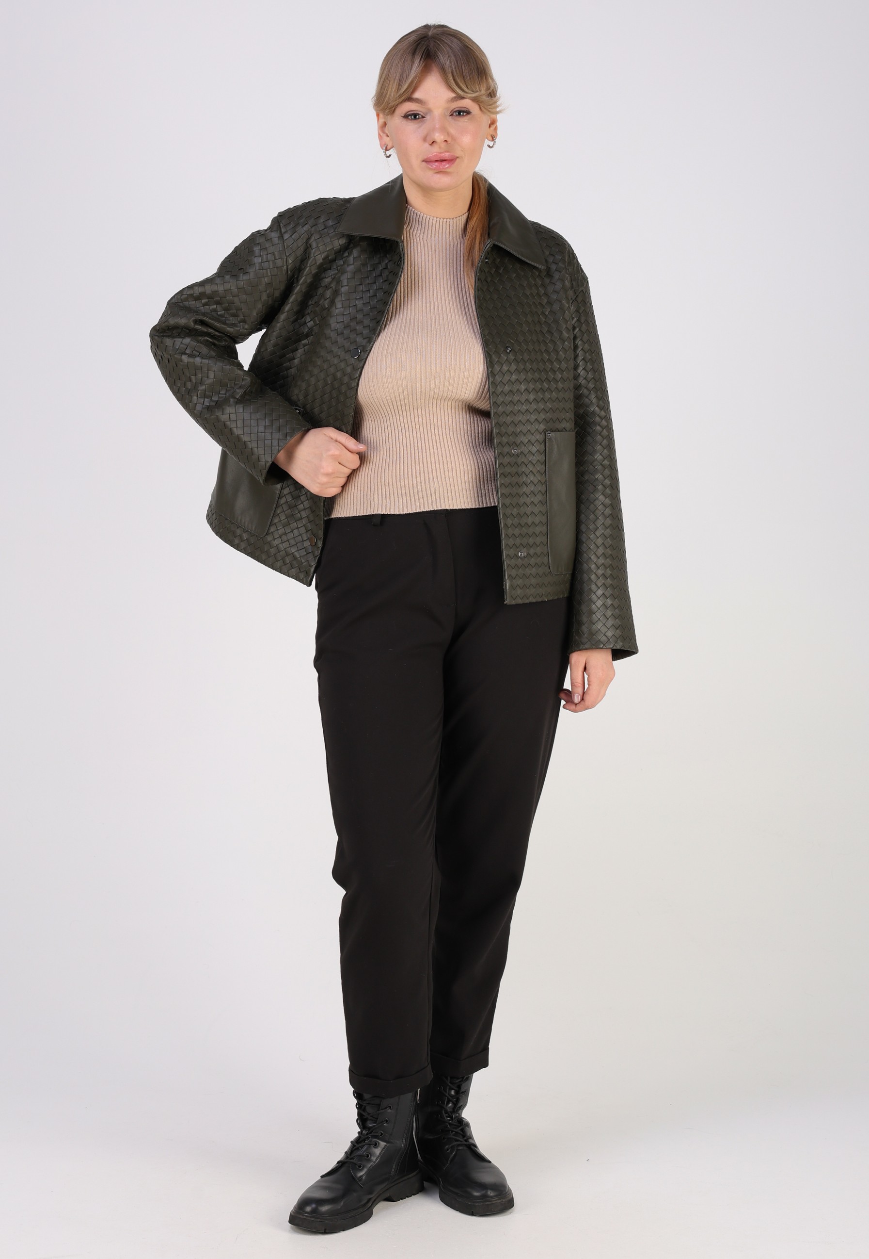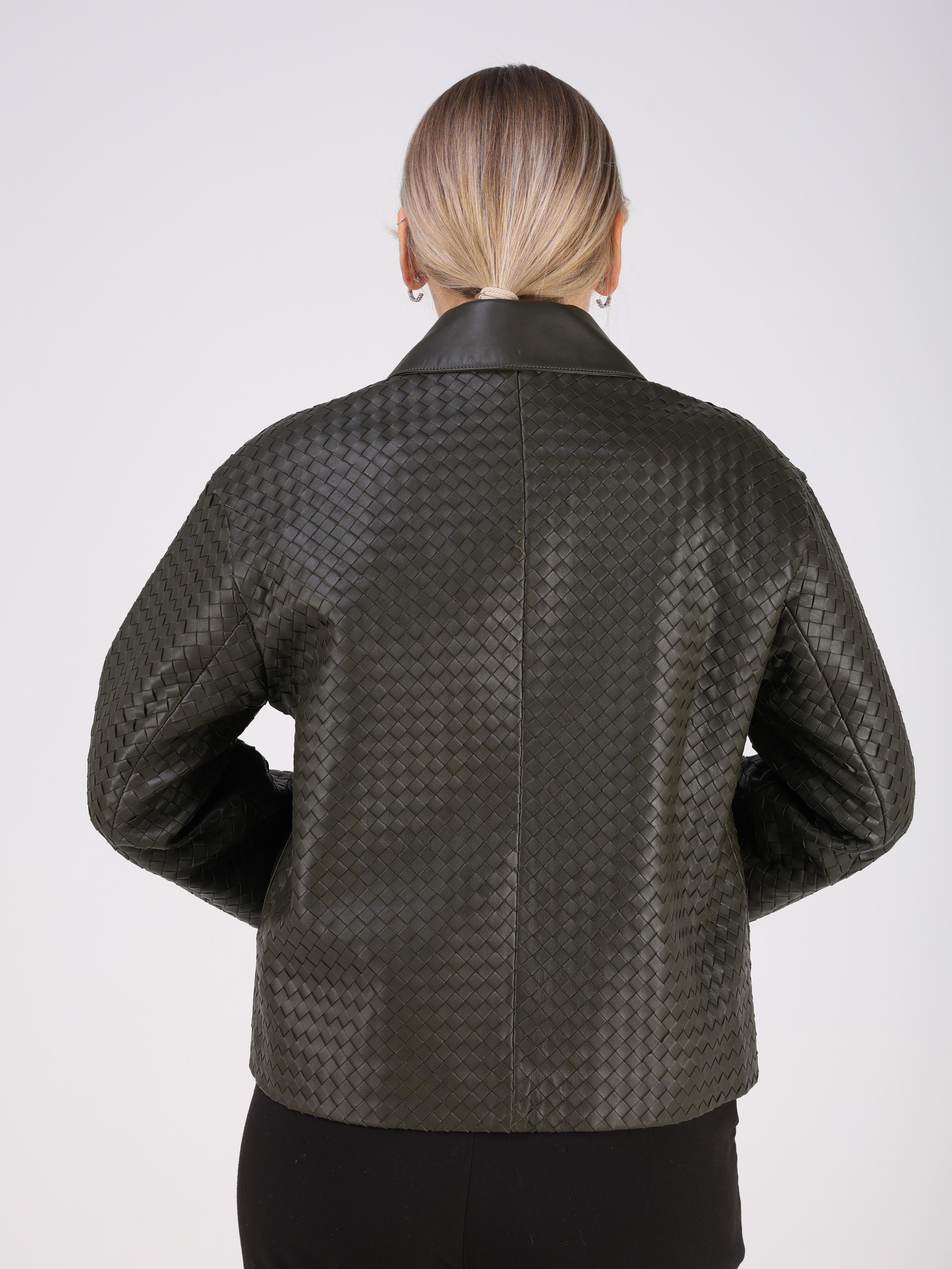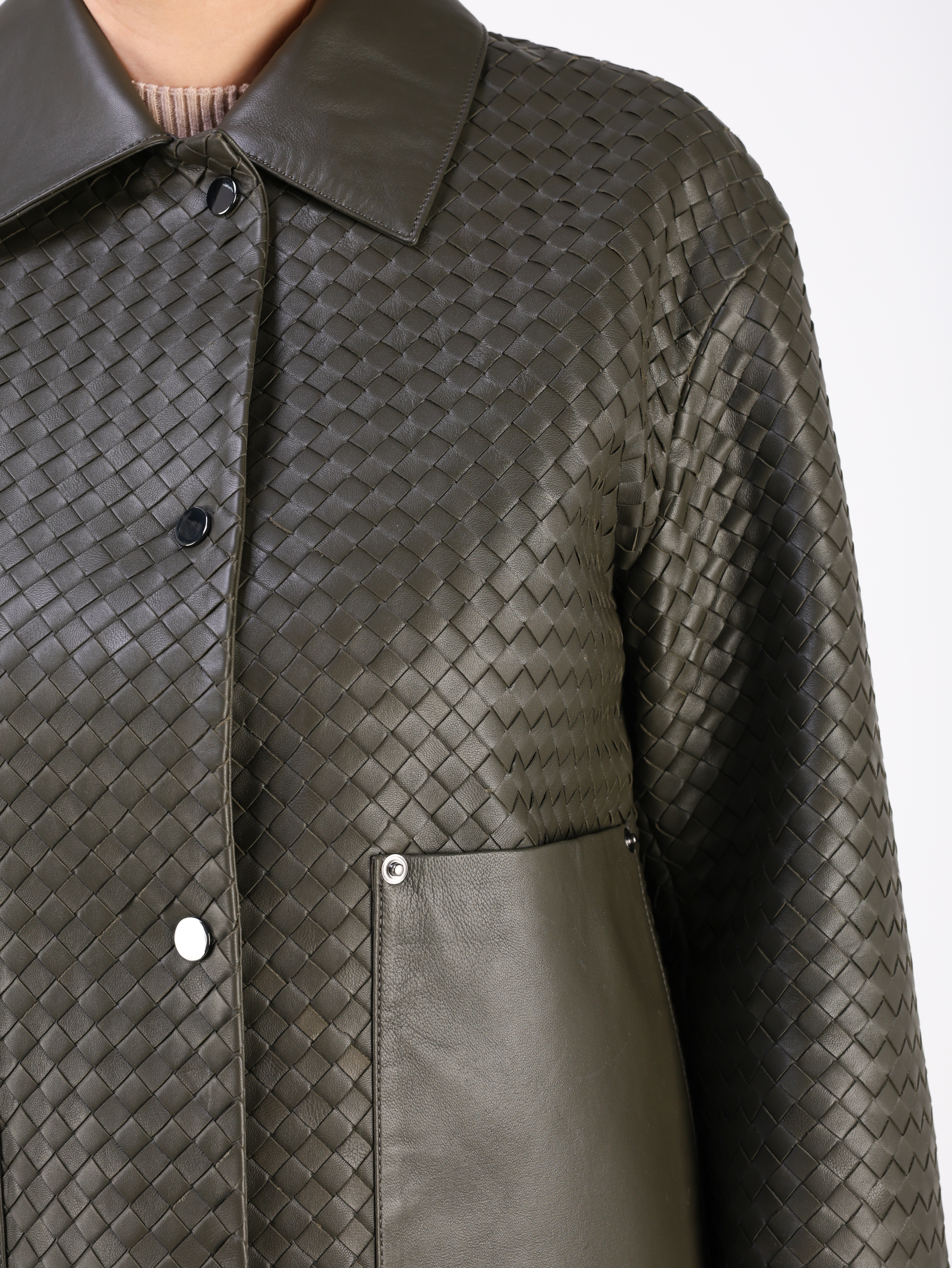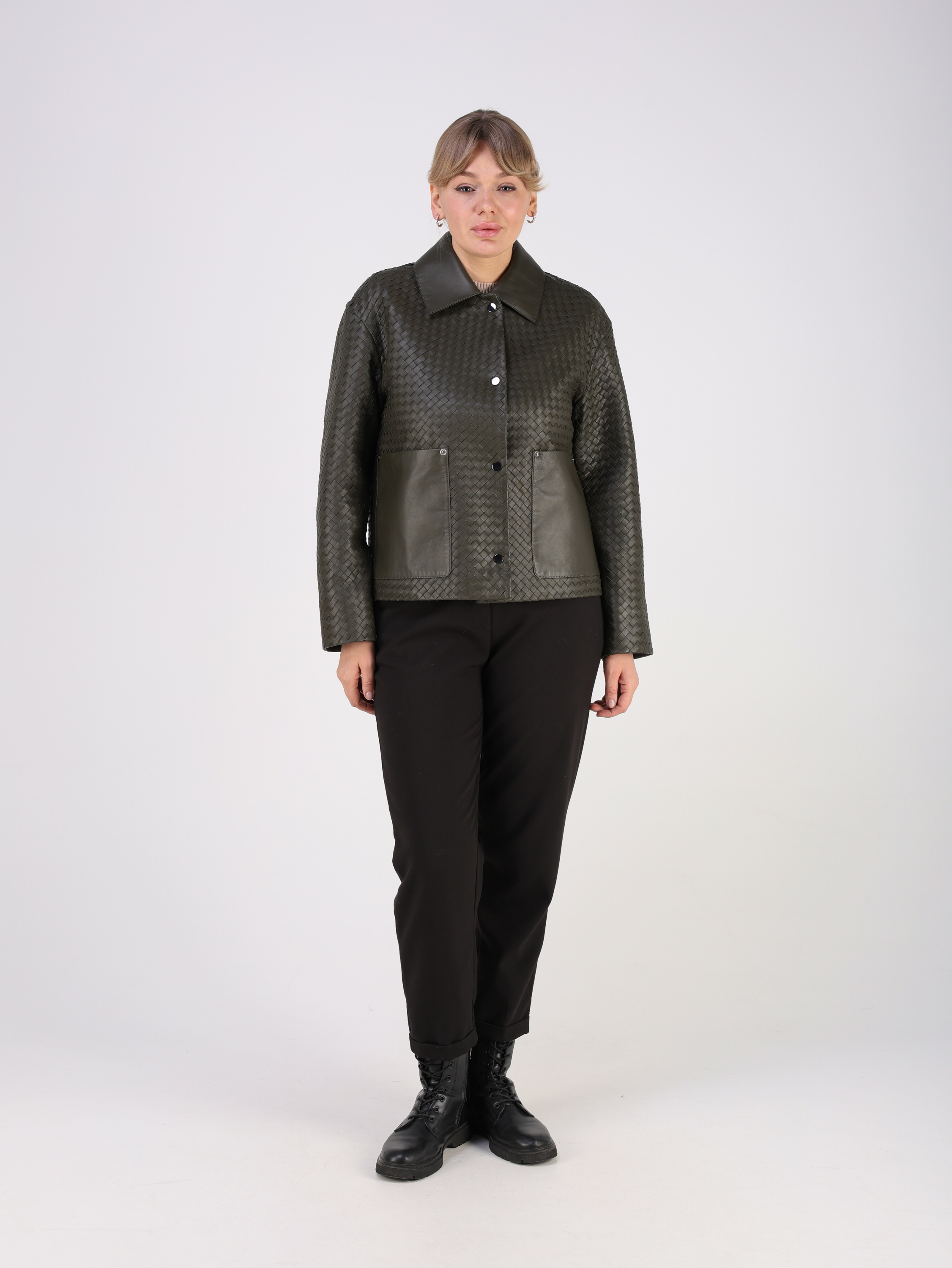 Куртка кожаная женская из натуральной кожи ягненка выделки "плонже". Модель прямого кроя выполнена в культовой технике плетения Intrecciato (интреччато) - техника плетения из тонких кожаных лент, создающая характерный ромбовый узор. Детали: застежка кнопки, две накладные карманы из гладкой кожи с декоративными вставками заклепками - хольнитены, отложной воротник.