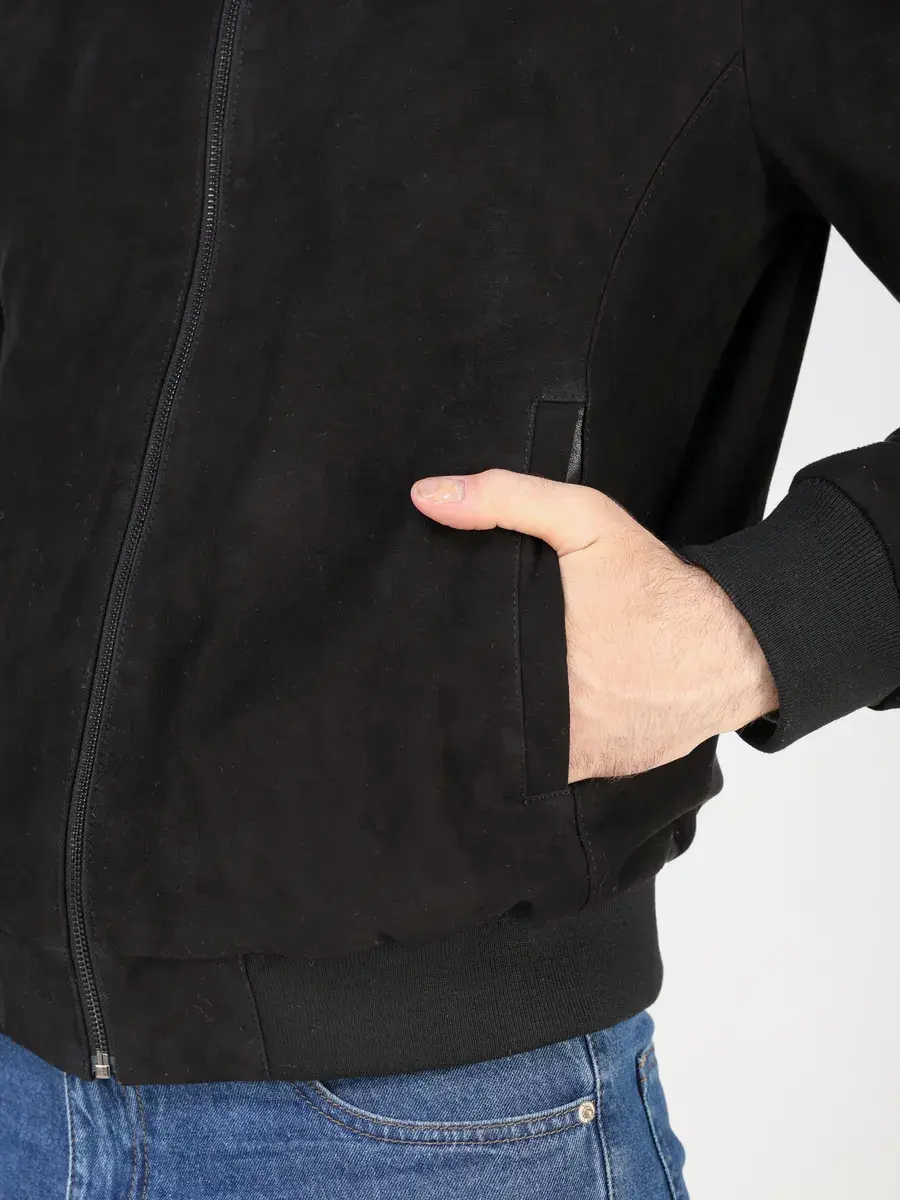 Куртка кожаная мужская из натуральной замши имеет длину по спинке 70 см, утягивающие трикотажные манжеты, что обеспечивает идеальное соотношение между длиной и защитой от холода, прекрасно подходить под классический и повседневный (casual) стиль одежды в прохлодное лето. Застежка на молнии и прорезные карманы добавляют функциональности и практичности в использовании данной куртки.