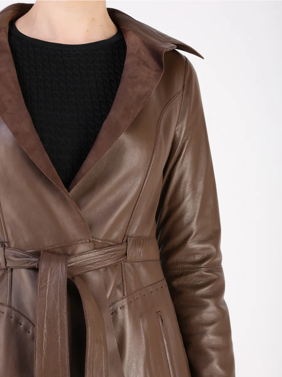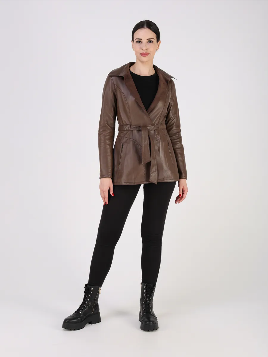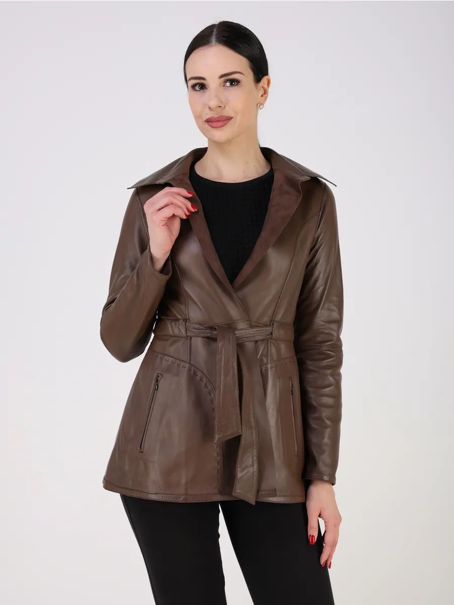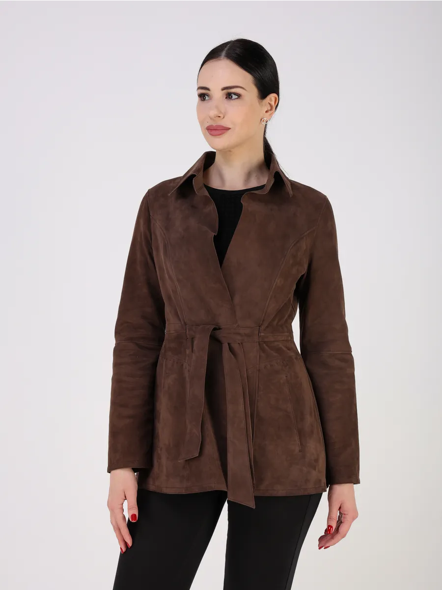 Куртка кожаная женская замша осенняя оснащена застежкой завязкой, удобными прорезными карманами и актуальным втачным рукавом, добавляющим трендовый акцент. Лёгкая кожаная куртка женская весна-осень приталенной посадки подчёркивает достоинства фигуры и подходит как под джинсы, так и под брюки, футболки, поло, рубашки или блузки. Универсальность фасона позволяет носить куртку весной, летом и осенью, а большой размерный ряд идеально садится даже на женщин с пышными формами. Замшевая куртка женская коричневая производство Турция гарантирует безупречное качество шитья.