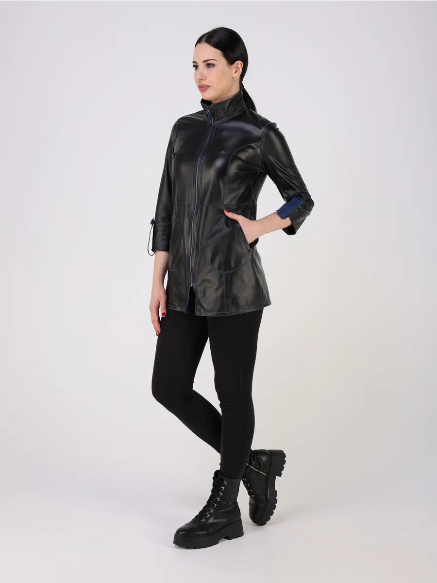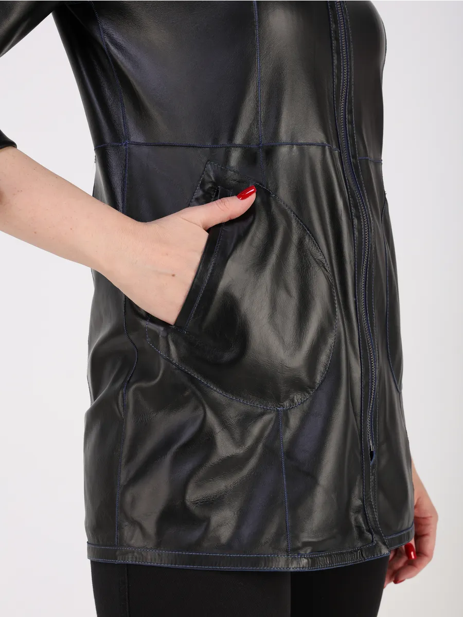 Куртка демисезонная женская с воротником стойка с кулисками оснащена застежкой на молнии, удобными прорезными карманами и с регулируемым по длине рукавом, добавляющим трендовый акцент. Лёгкая кожаная куртка женская весна-осень приталенной посадки подчёркивает достоинства фигуры и подходит как под джинсы, так и под брюки, футболки, поло, рубашки или блузки. Универсальность фасона позволяет носить куртку весной, летом и осенью, а большой размерный ряд идеально садится даже на женщин с пышными формами. Производство Турция гарантирует безупречное качество шитья.