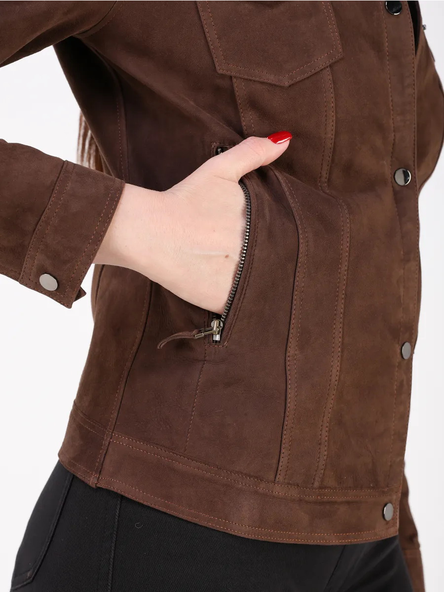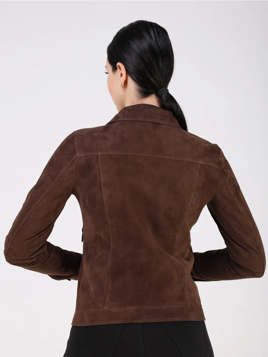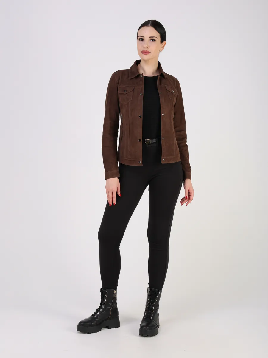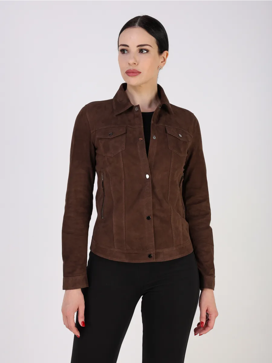 Джинсовая куртка женская весна - кожанка выполнена из натуральной замши испанского ягнёнка, что обеспечивает исключительную мягкость и износостойкость.