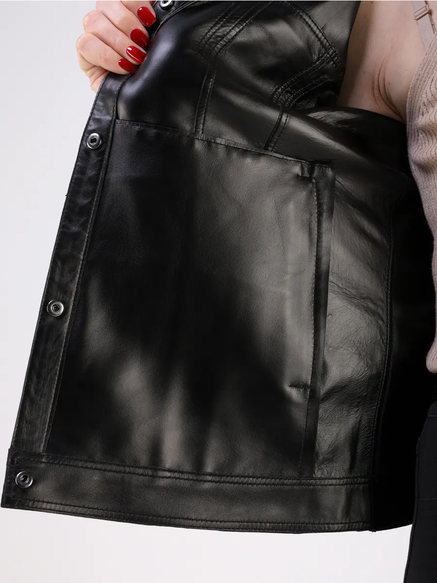 Кожаная куртка женская отличается приталенным кроем, застёжкой на надежных кнопках и прорезными карманами на молнии, а также двумя карманами на груди с кнопками. Манжеты на кнопках и аккуратный втачной рукав подчёркивают элегантность силуэта, делая изделие универсальным для разных случаев жизни.