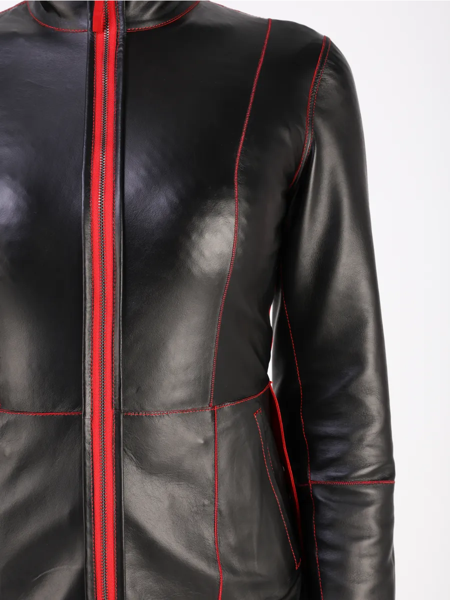 Куртка демисезонная женская кожаная натуральная оснащена застежкой на молнии, удобными прорезными карманами, добавляющим трендовый акцент. Лёгкая куртка кожаная женская весна-осень приталенной посадки с шилицей по бокан на кнопках подчёркивает достоинства фигуры и подходит как под джинсы, так и под брюки, футболки, поло, рубашки или блузки. Универсальность фасона позволяет носить куртку весной, летом и осенью, а большой размерный ряд идеально садится даже на женщин с пышными формами.