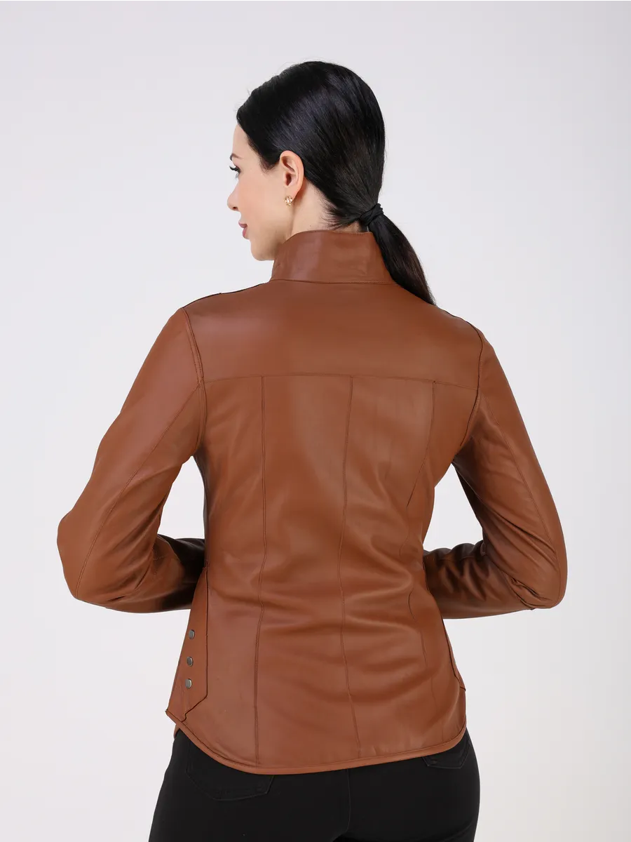 Куртка демисезонная женская кожаная натуральная оснащена застежкой на молнии, удобными прорезными карманами, добавляющим трендовый акцент. Лёгкая куртка кожаная женская весна-осень приталенной посадки с шилицей по бокан на кнопках подчёркивает достоинства фигуры и подходит как под джинсы, так и под брюки, футболки, поло, рубашки или блузки. Универсальность фасона позволяет носить куртку весной, летом и осенью, а большой размерный ряд идеально садится даже на женщин с пышными формами.