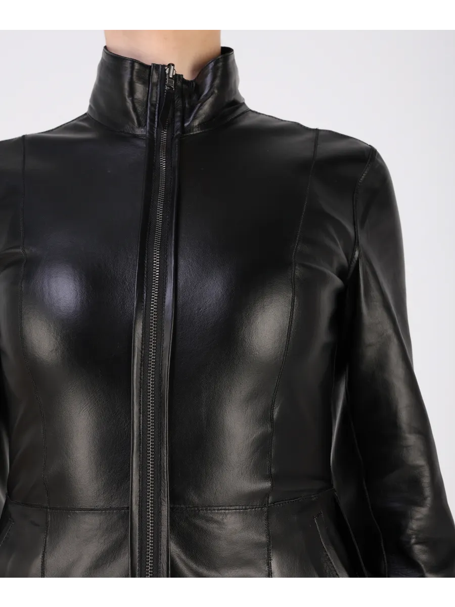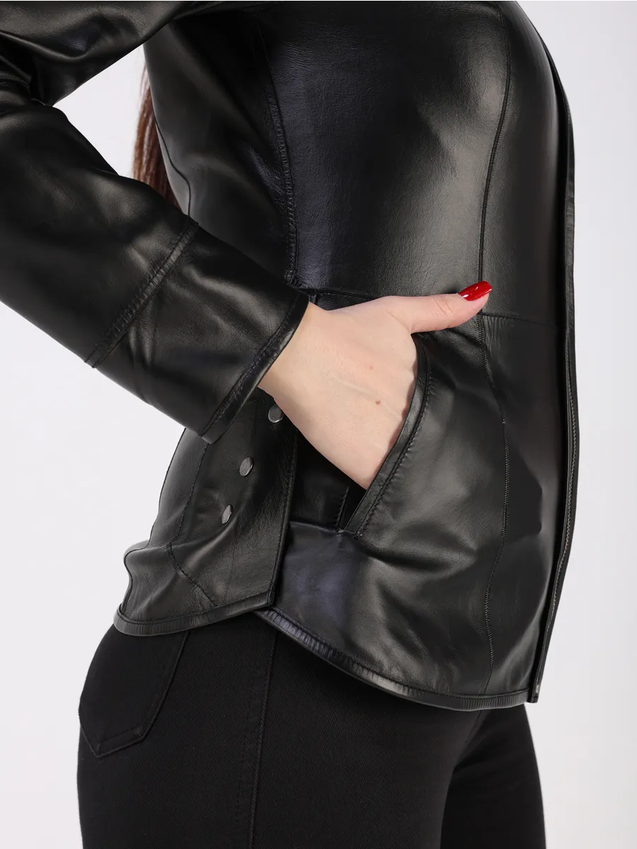 Куртка демисезонная женская кожаная натуральная оснащена застежкой на молнии, удобными прорезными карманами, добавляющим трендовый акцент. Лёгкая куртка кожаная женская весна-осень приталенной посадки с шилицей по бокан на кнопках подчёркивает достоинства фигуры и подходит как под джинсы, так и под брюки, футболки, поло, рубашки или блузки. Универсальность фасона позволяет носить куртку весной, летом и осенью, а большой размерный ряд идеально садится даже на женщин с пышными формами.