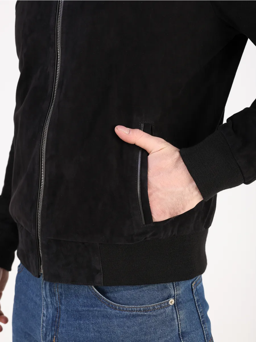 Куртка кожаная мужская из натуральной замши имеет длину по спинке 70 см, утягивающие трикотажные манжеты, что обеспечивает идеальное соотношение между длиной и защитой от холода, прекрасно подходить под классический и повседневный стиль одежды в прохлодное лето. Застежка на молнии и прорезные карманы добавляют функциональности и практичности в использовании данной куртки.