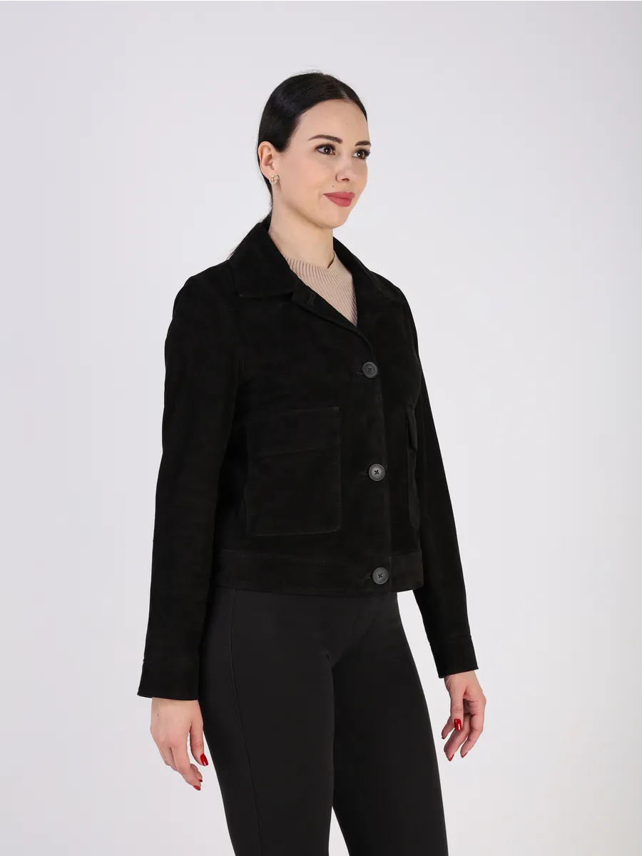 Женский пиджак замшевый, кожаная куртка женская укороченная изготовлена из элитной испанской замши ягненка, отличается особой мягкостью, лёгкостью и долговечностью. Куртка прекрасно сидит по фигуре благодаря прямому крою и аккуратным втачным рукавам с манжетами. Застёжка на пуговицах и элегантные накладные карманы с клапанами подчеркивают лаконичный и женственный дизайн.