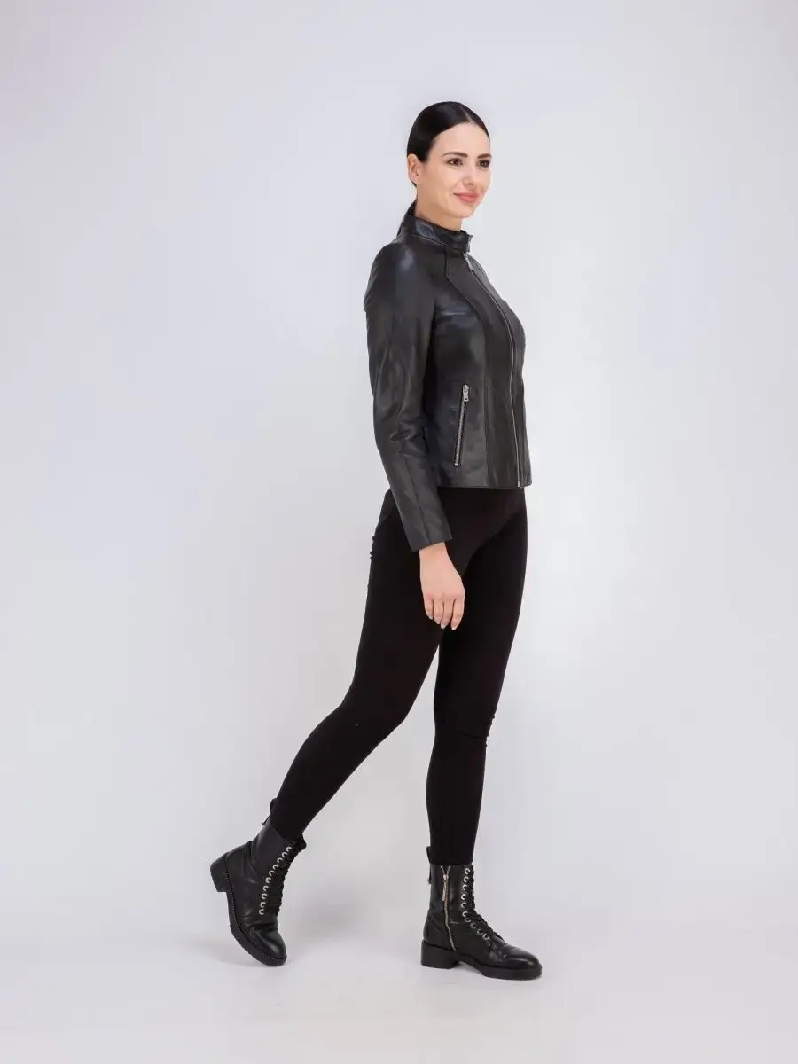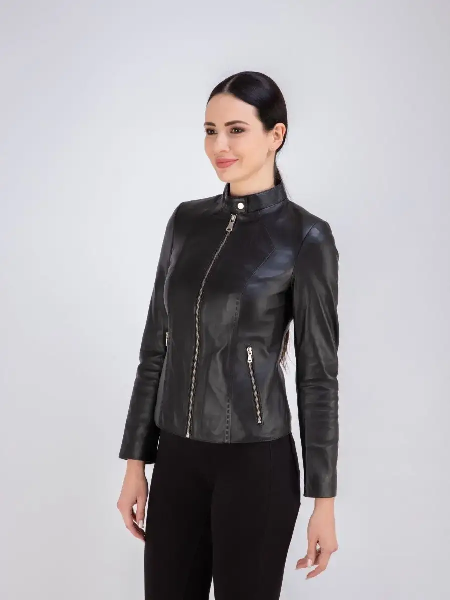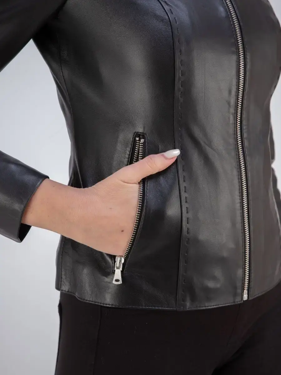 Каждая деталь этой кожаной куртки выполнена с особым вниманием к качеству материалов. Куртка женская весна - осень имеет длину по спинке 55см. Классический воротник стойка с кнопкой, гладкая кожа, фурнитура придают куртке уникальность и изысканность, идеально впишется в любой стиль и дополнит образ женщины или девочки, независимо от возраста.