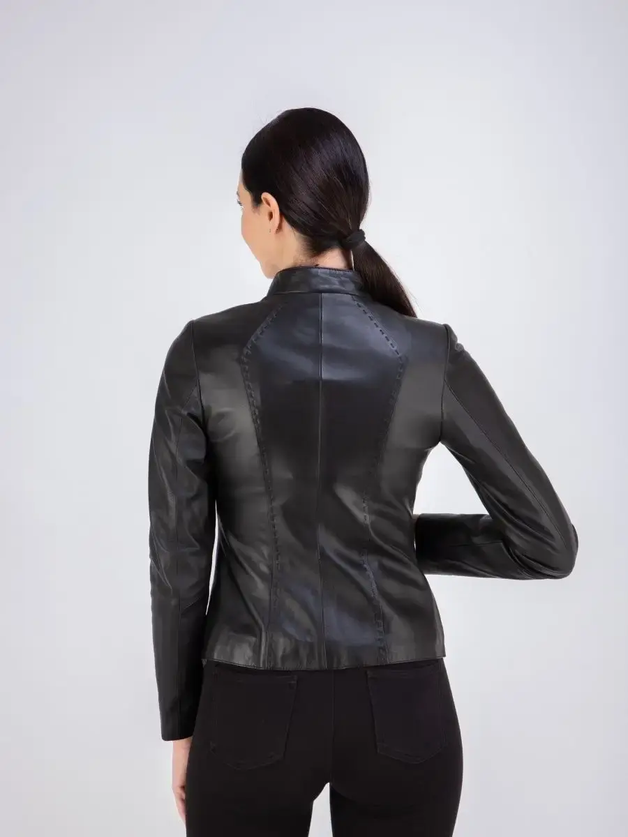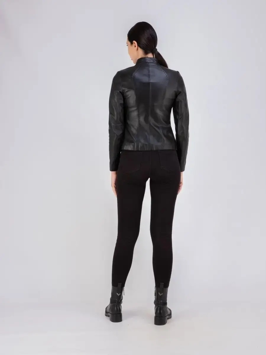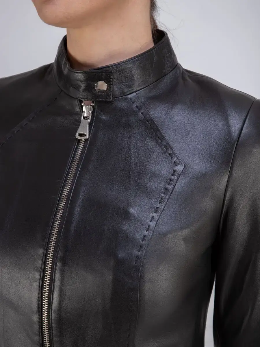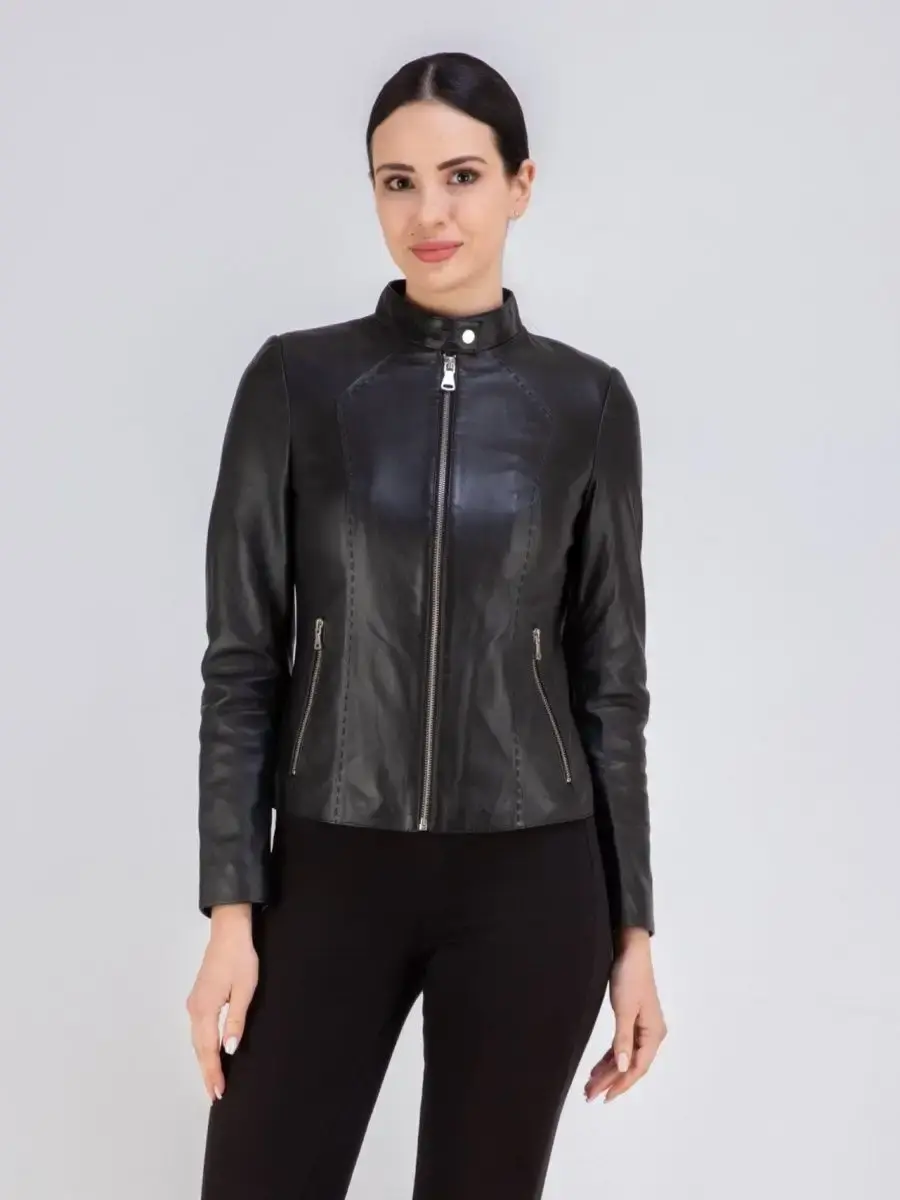 Каждая деталь этой кожаной куртки выполнена с особым вниманием к качеству материалов. Куртка женская весна - осень имеет длину по спинке 55см. Классический воротник стойка с кнопкой, гладкая кожа, фурнитура придают куртке уникальность и изысканность, идеально впишется в любой стиль и дополнит образ женщины или девочки, независимо от возраста.