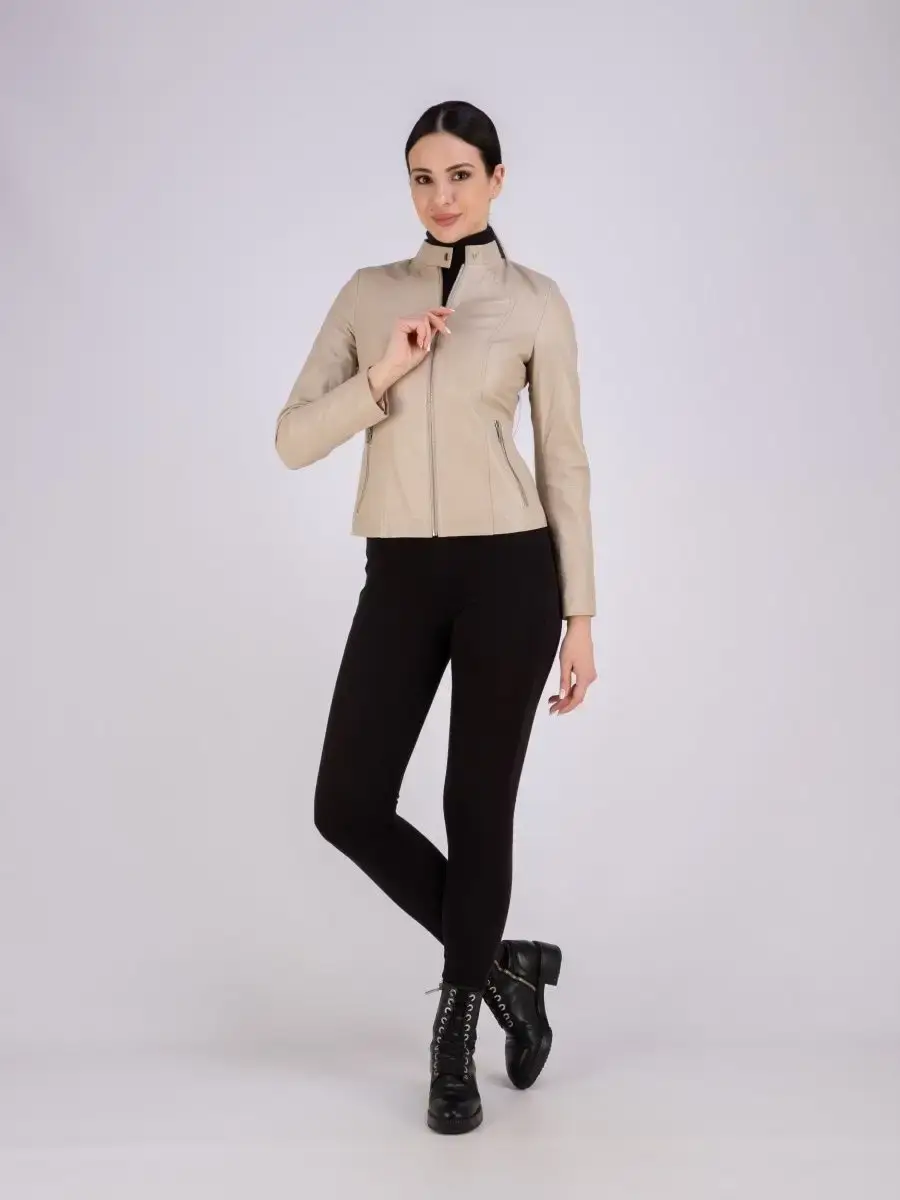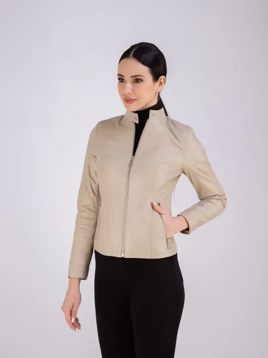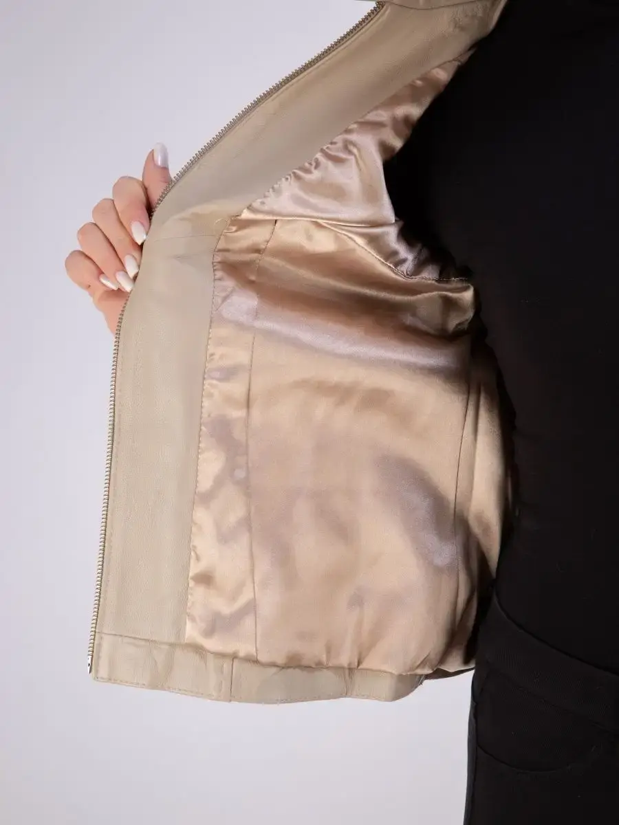 Каждая деталь этой кожаной куртки выполнена с особым вниманием к качеству материалов. Куртка женская весна - осень имеет длину по спинке 55см. Классический воротник стойка с кнопкой, гладкая кожа, фурнитура придают куртке уникальность и изысканность, идеально впишется в любой стиль и дополнит образ женщины или девочки, независимо от возраста.