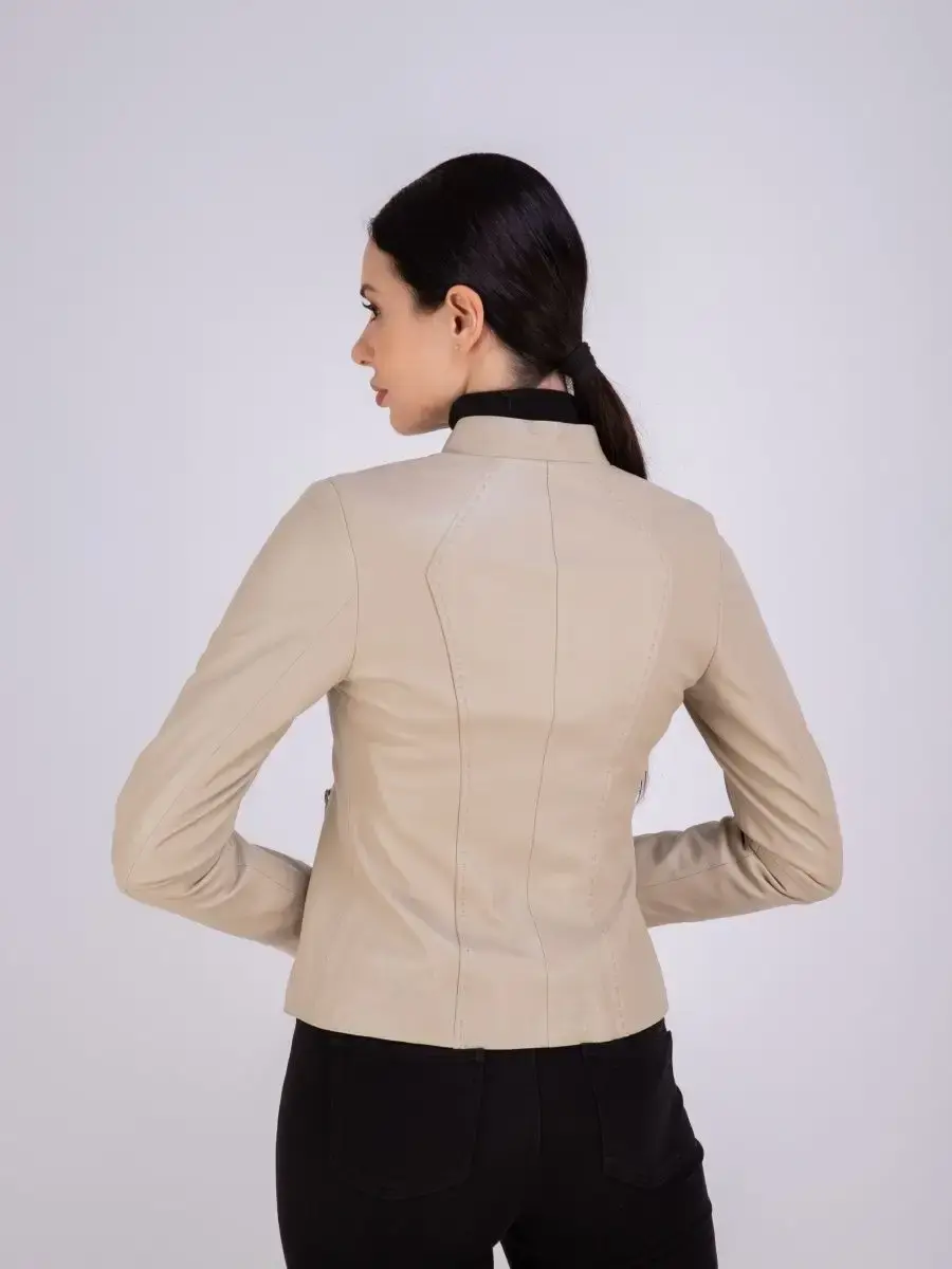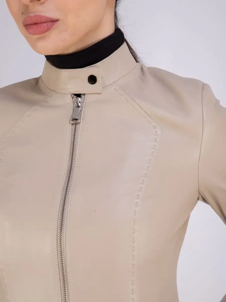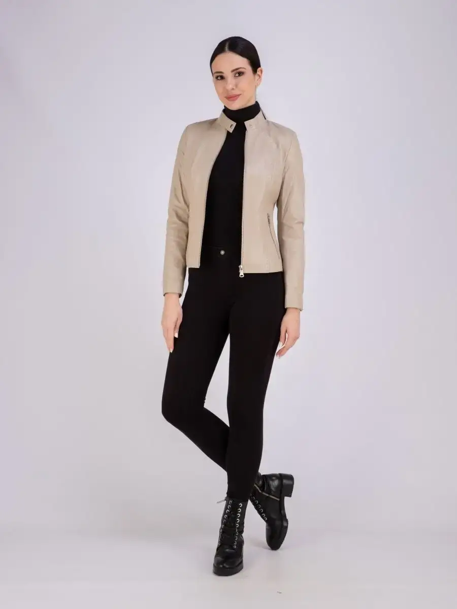 Каждая деталь этой кожаной куртки выполнена с особым вниманием к качеству материалов. Куртка женская весна - осень имеет длину по спинке 55см. Классический воротник стойка с кнопкой, гладкая кожа, фурнитура придают куртке уникальность и изысканность, идеально впишется в любой стиль и дополнит образ женщины или девочки, независимо от возраста.