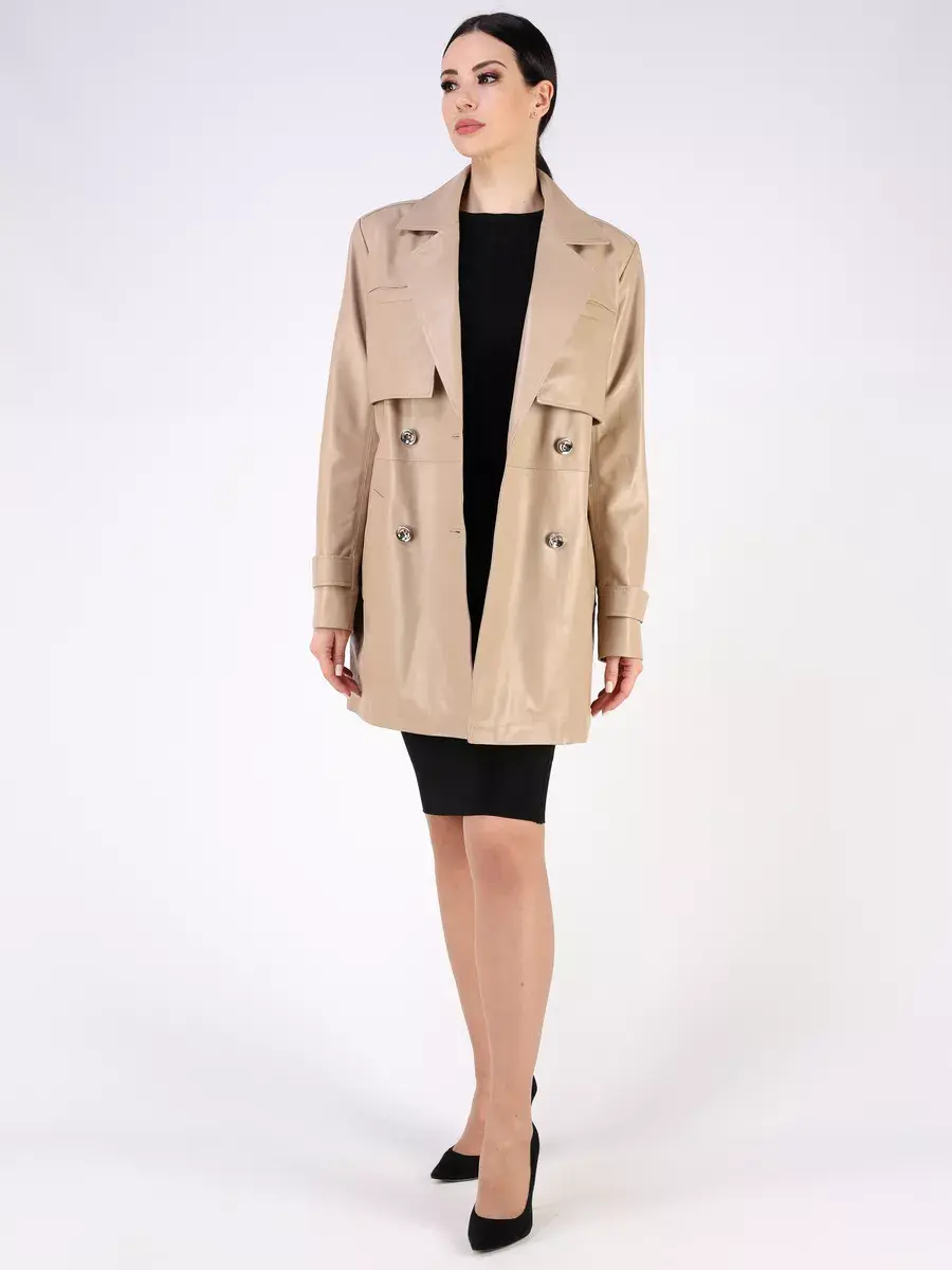 двубортный тренч женский короткий, хлястики, отлетная кокетка, шлица,