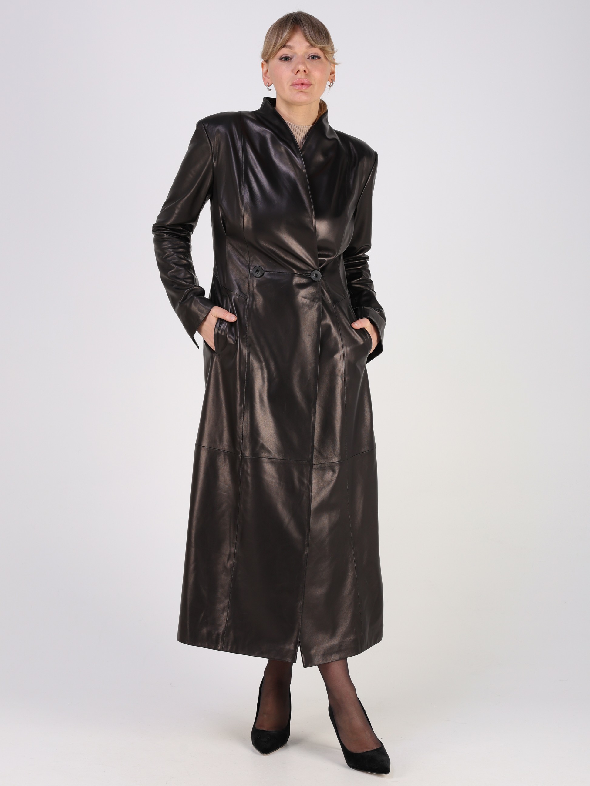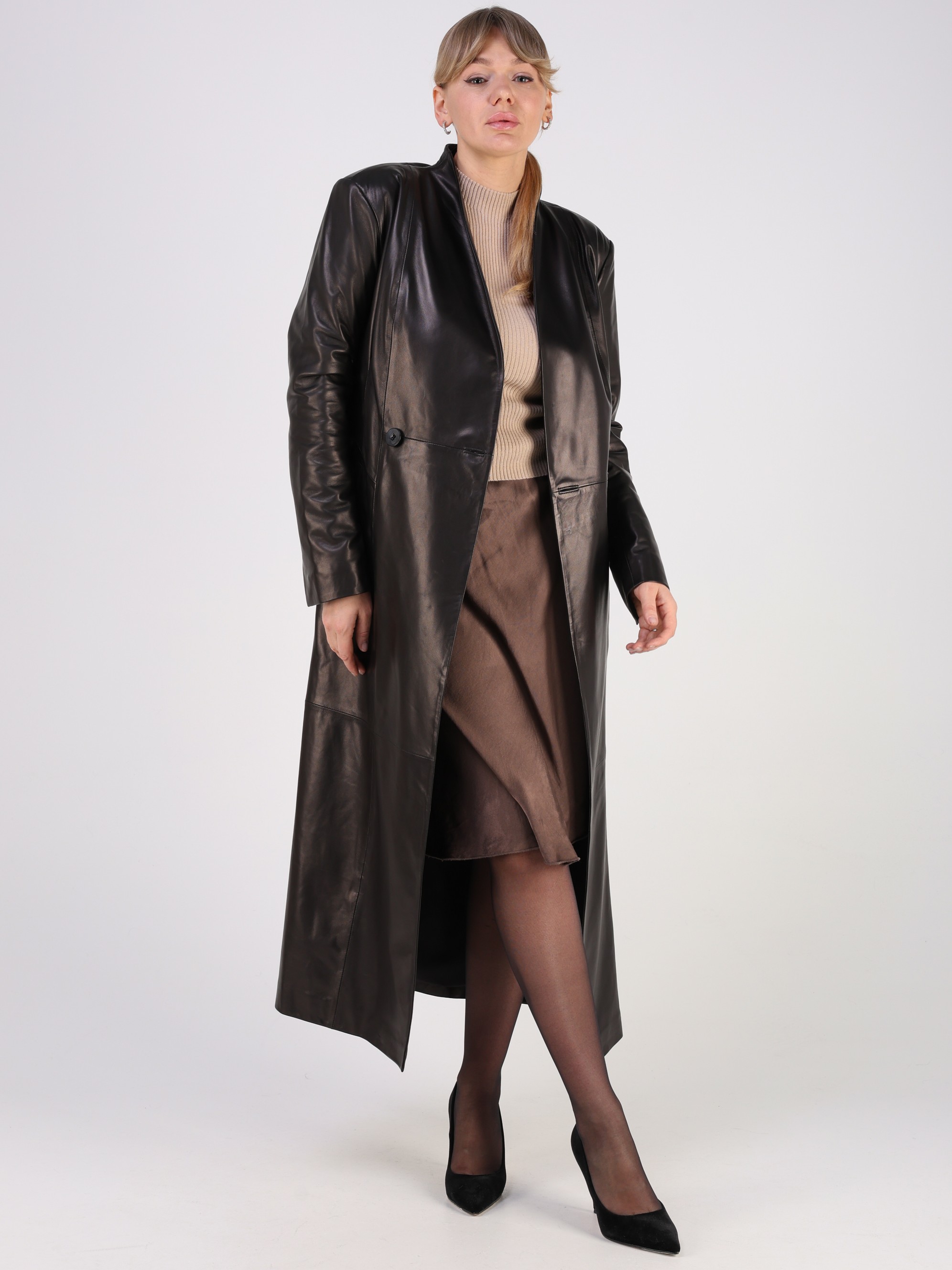 Плащ кожаный женский выполнен из натуральной кожи ягненка. Удлиненная модель плаща приталенного кроя, двубортная. Детали: застежка на пуговицу, 2 кармана, воротник апаш, шлица, лаконичный дизайн.