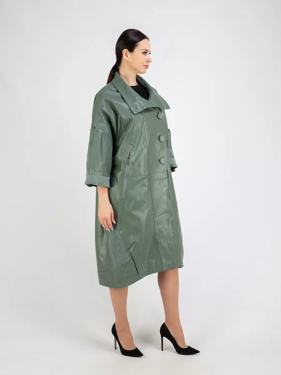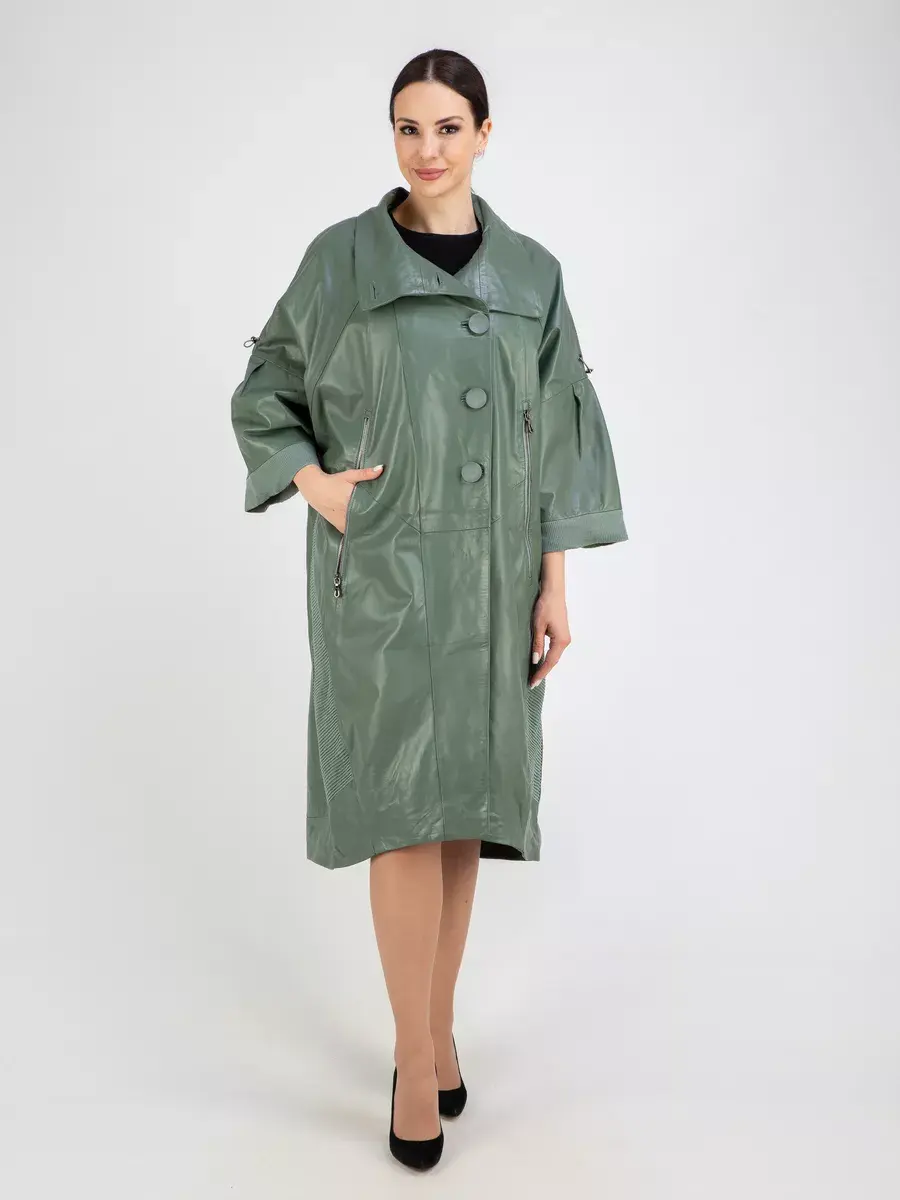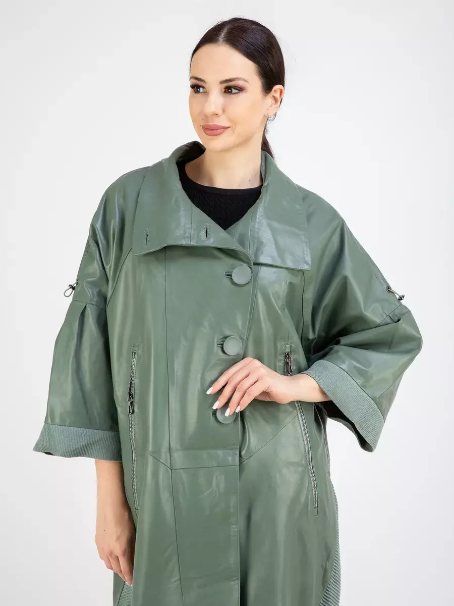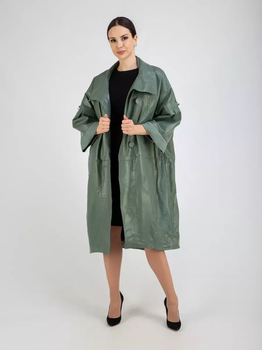 Длинный плащ женский на весну и на осень без утеплителя застегивается на красивые пуговицы. Демисезонная модель, женский кожаный плащ имеет свободный прямой крой, длину ниже колена и трикотажные вставки на коротких рукавах и по бокам. Модный короткий рукав реглан с трикотажными манжетами и кулисками, прорезные карманы на молнии, декоративные вставки, асимметричный подол и фурнитура добавляют акценты стиля и функциональности, делают это пальто женское красивым элементом гардероба, который подходит практически под любой стиль, деловой или повседневный.