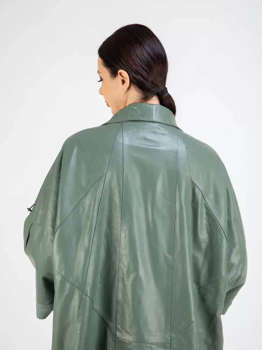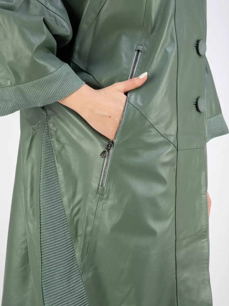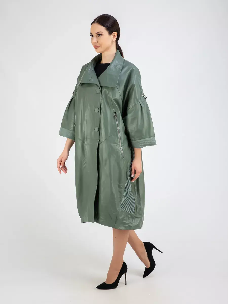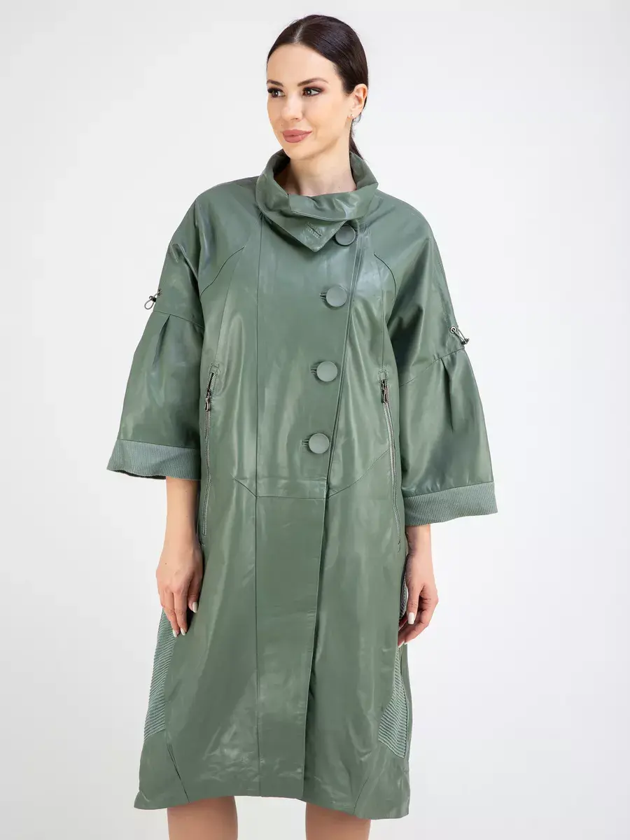 Длинный плащ женский на весну и на осень без утеплителя застегивается на красивые пуговицы. Демисезонная модель, женский кожаный плащ имеет свободный прямой крой, длину ниже колена и трикотажные вставки на коротких рукавах и по бокам. Модный короткий рукав реглан с трикотажными манжетами и кулисками, прорезные карманы на молнии, декоративные вставки, асимметричный подол и фурнитура добавляют акценты стиля и функциональности, делают это пальто женское красивым элементом гардероба, который подходит практически под любой стиль, деловой или повседневный.