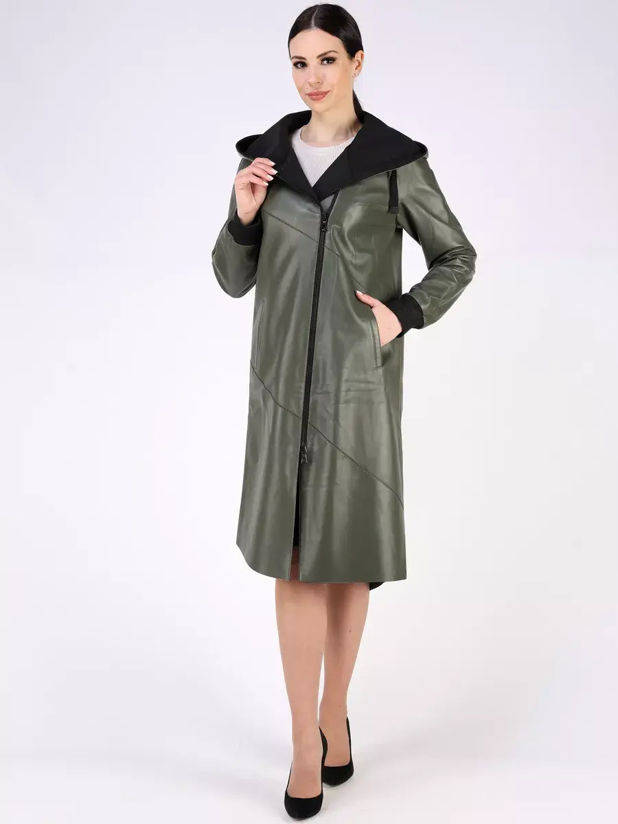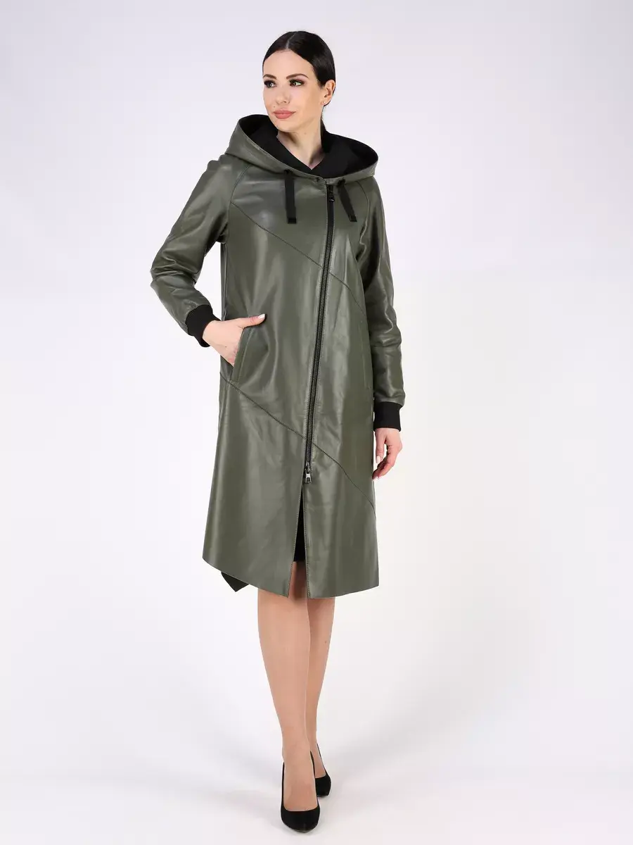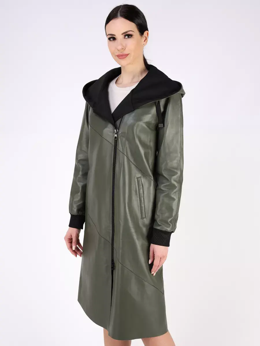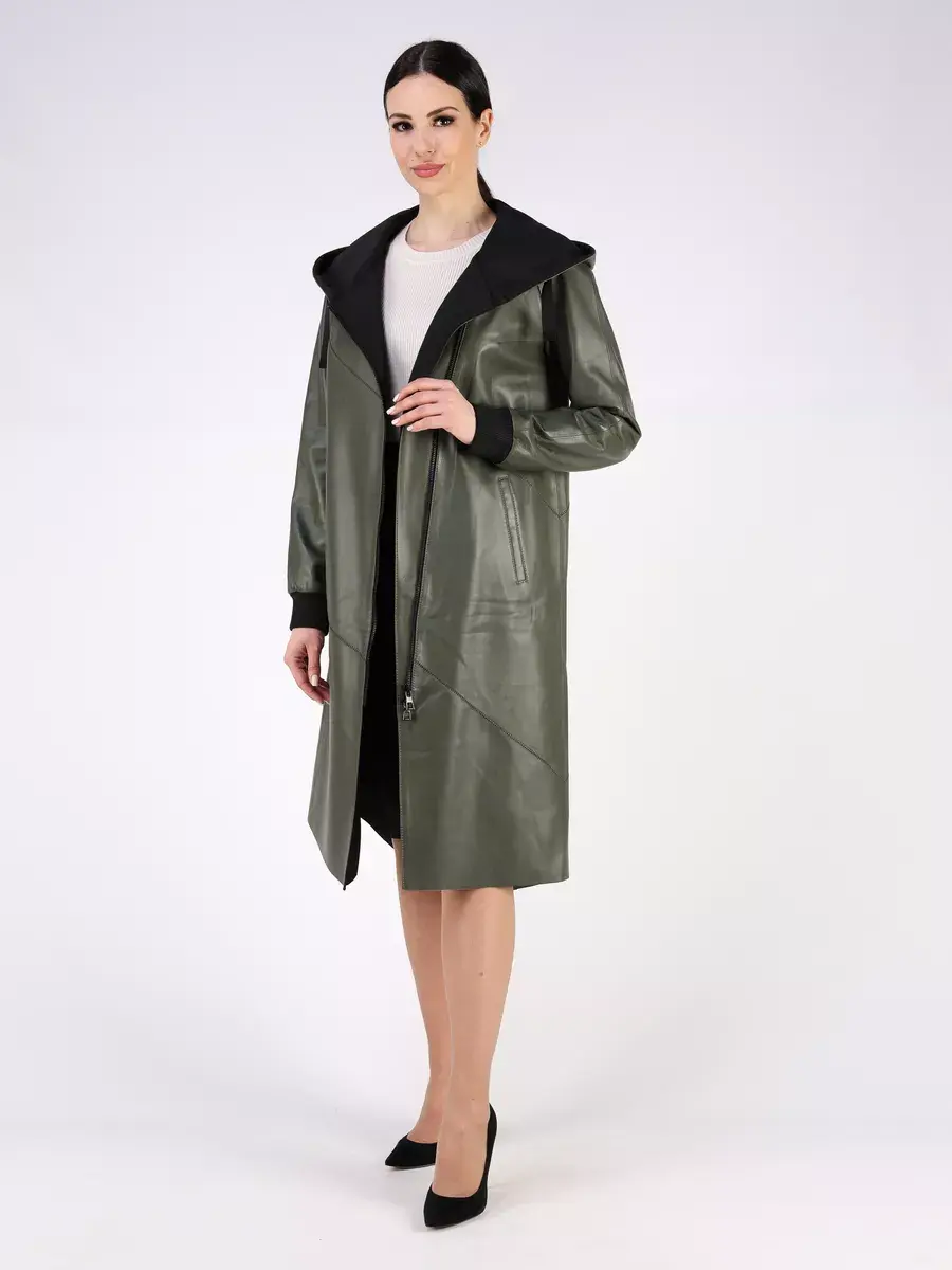 Длинный плащ женский на весну и на осень без утеплителя застегивается на молнию. Демисезонная модель, женский кожаный плащ имеет свободный прямой крой, длину ниже колена и шлицу. С боку она дополнена разрезом на молнии, которую можно расстегнуть. Рукав реглан с трикотажными манжетами, прорезные карманы, декоративная строчка, асимметричный подол и фурнитура добавляют акценты стиля и функциональности, делают это пальто женское красивым элементом гардероба, который подходит практически под любой стиль, деловой или повседневный. Капюшон не съемный с кулисками позволяет регулировать его объем.