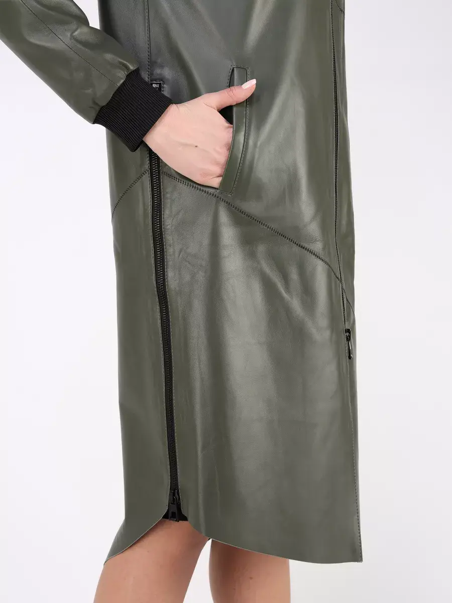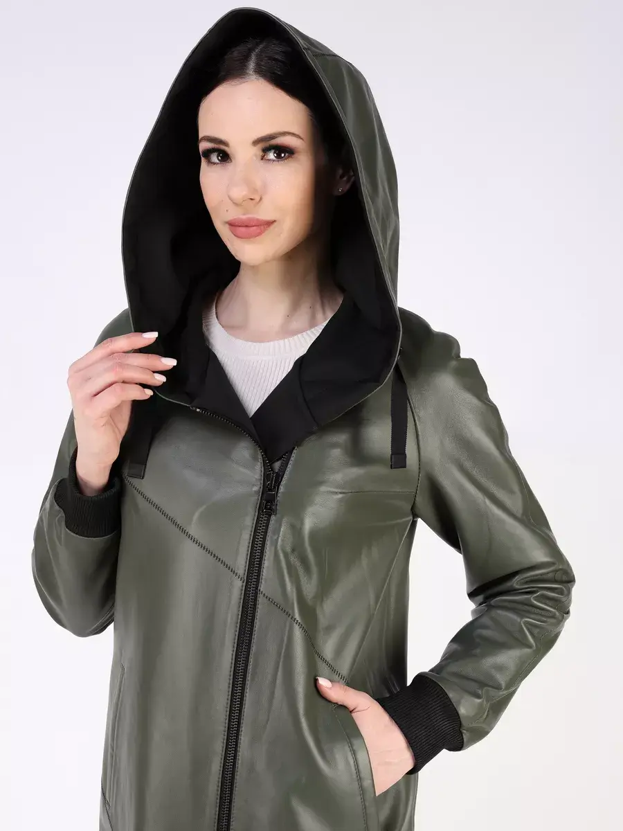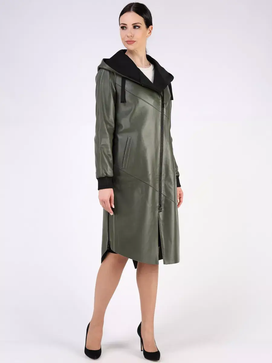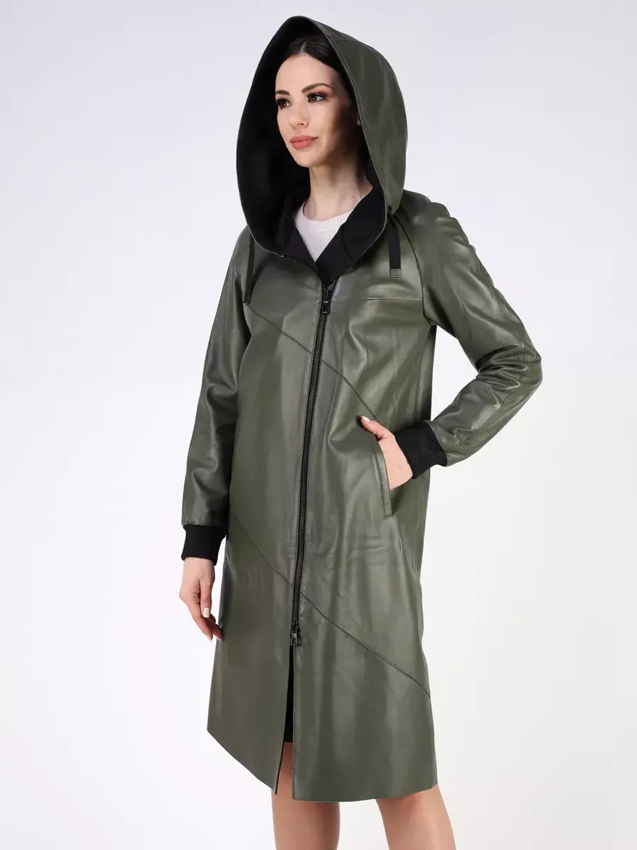 Длинный плащ женский на весну и на осень без утеплителя застегивается на молнию. Демисезонная модель, женский кожаный плащ имеет свободный прямой крой, длину ниже колена и шлицу. С боку она дополнена разрезом на молнии, которую можно расстегнуть. Рукав реглан с трикотажными манжетами, прорезные карманы, декоративная строчка, асимметричный подол и фурнитура добавляют акценты стиля и функциональности, делают это пальто женское красивым элементом гардероба, который подходит практически под любой стиль, деловой или повседневный. Капюшон не съемный с кулисками позволяет регулировать его объем.