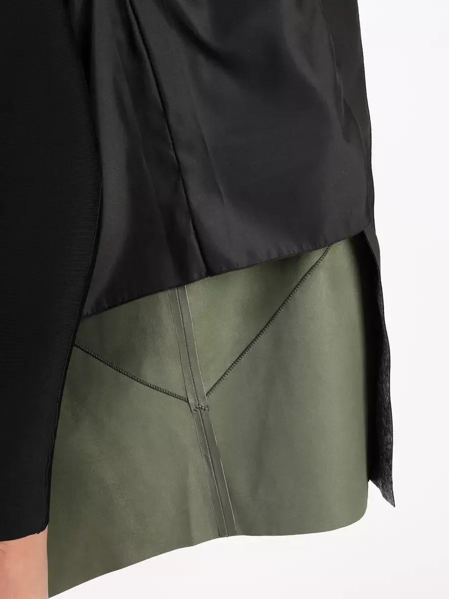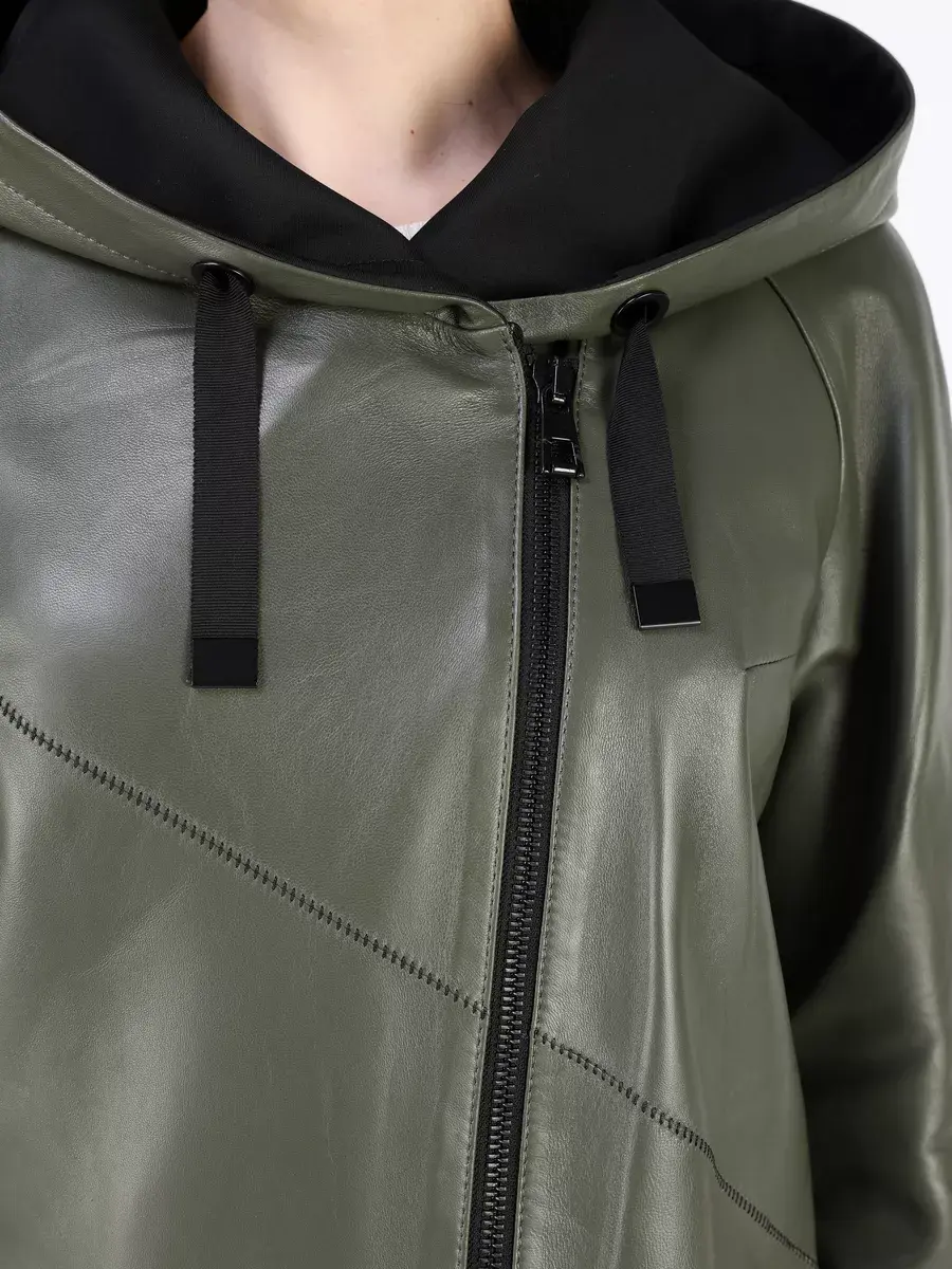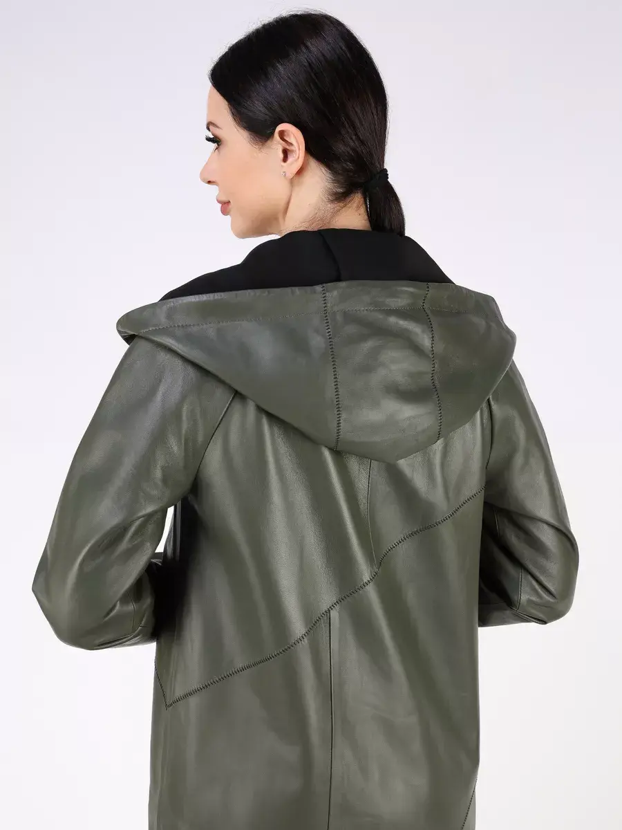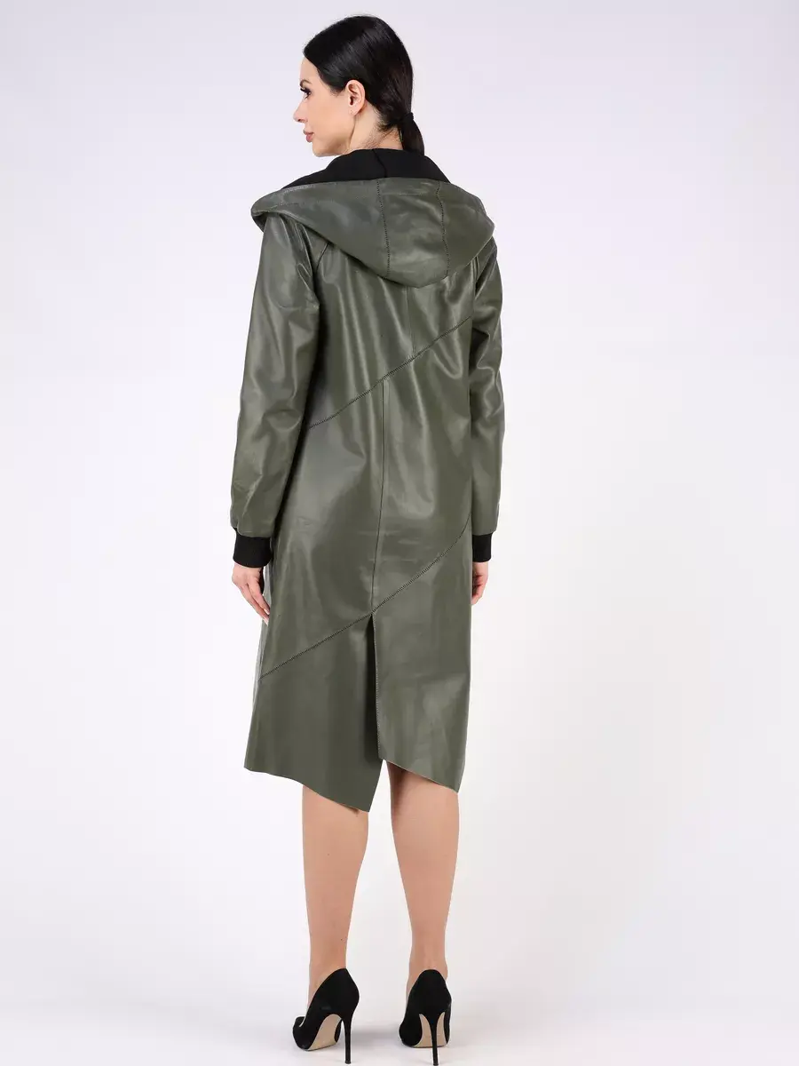 Длинный плащ женский на весну и на осень без утеплителя застегивается на молнию. Демисезонная модель, женский кожаный плащ имеет свободный прямой крой, длину ниже колена и шлицу. С боку она дополнена разрезом на молнии, которую можно расстегнуть. Рукав реглан с трикотажными манжетами, прорезные карманы, декоративная строчка, асимметричный подол и фурнитура добавляют акценты стиля и функциональности, делают это пальто женское красивым элементом гардероба, который подходит практически под любой стиль, деловой или повседневный. Капюшон не съемный с кулисками позволяет регулировать его объем.