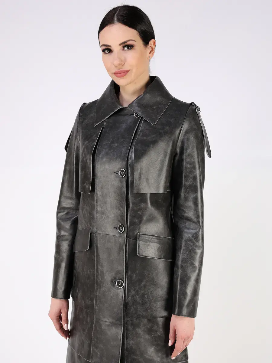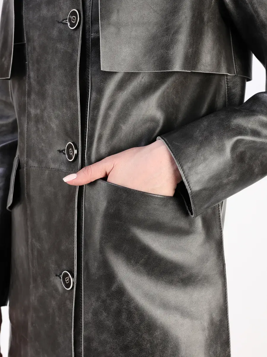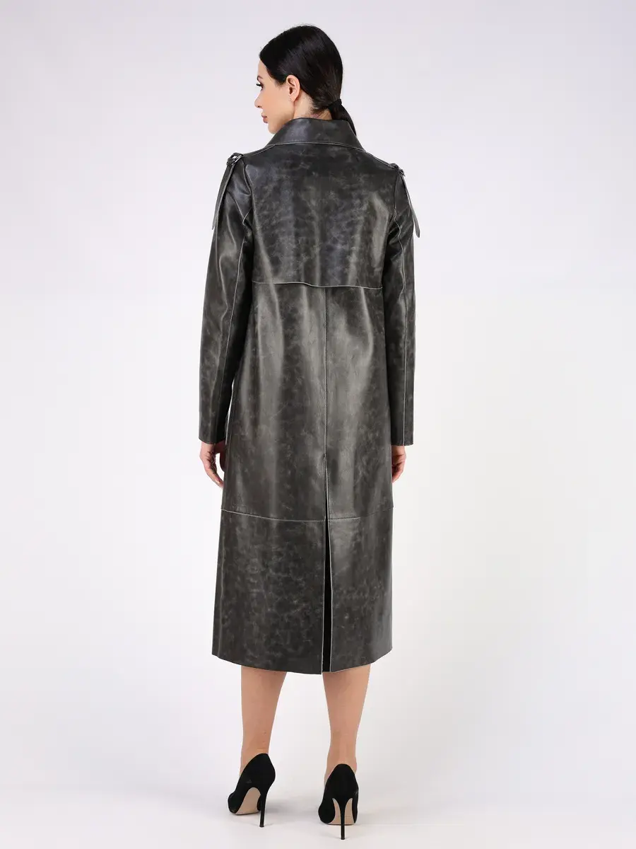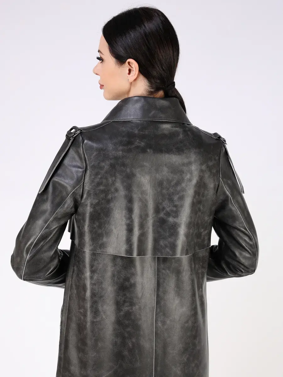 Длина по спинке 120см. Демисезонный плащ кожаный женский имеет два накладных кармана с клапанами, кокетка, втачной рукав с модными эполетами и шлицу сзади.