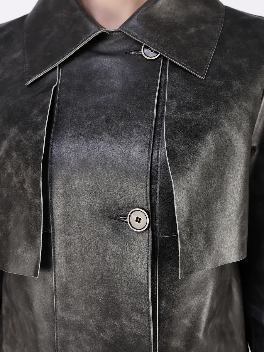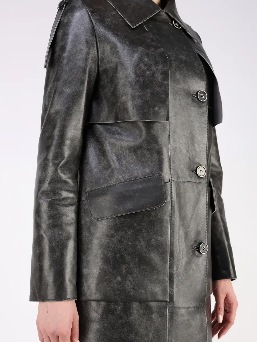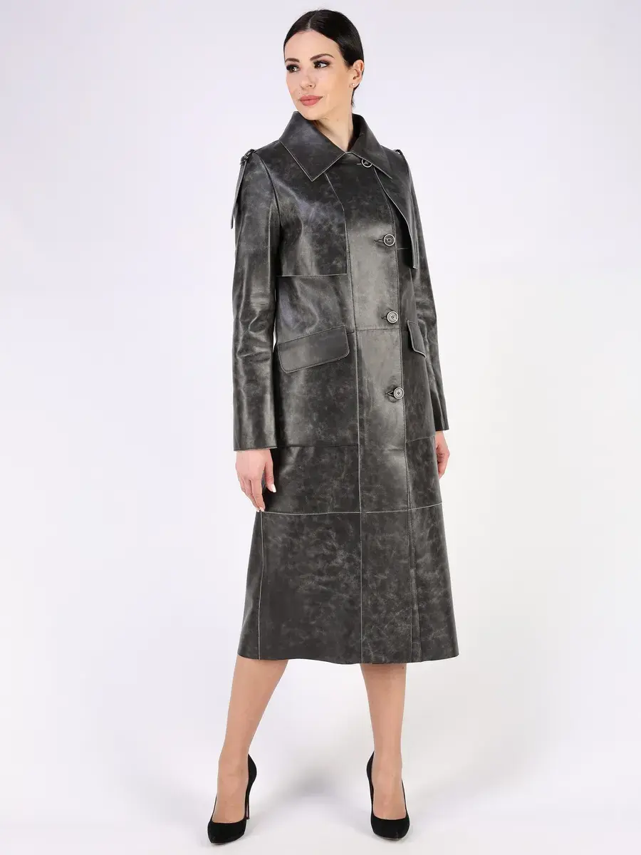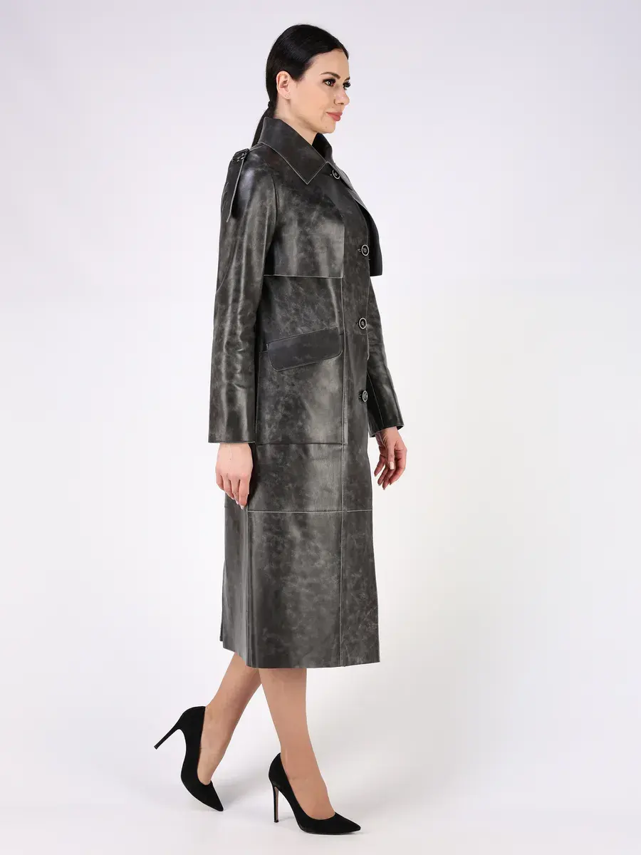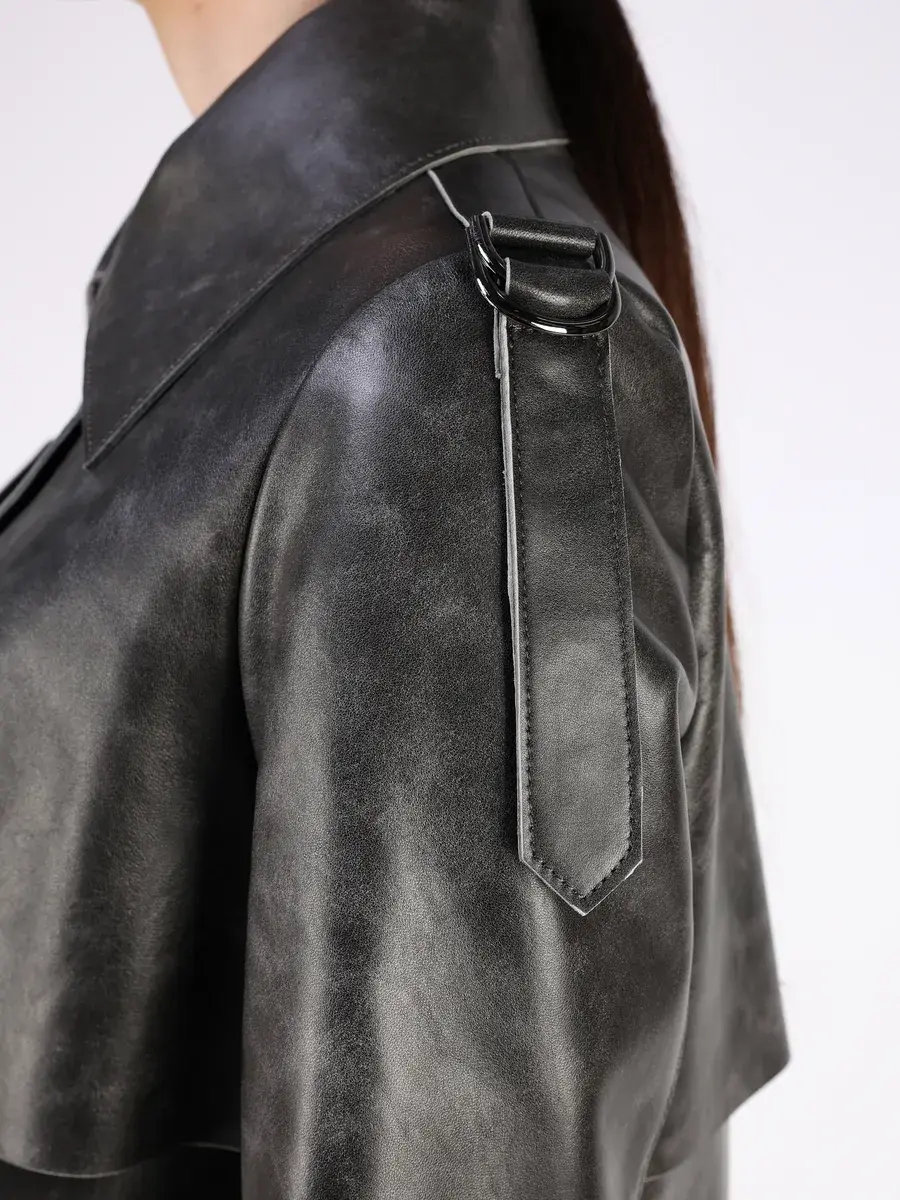 Длина по спинке 120см. Демисезонный плащ кожаный женский имеет два накладных кармана с клапанами, кокетка, втачной рукав с модными эполетами и шлицу сзади.