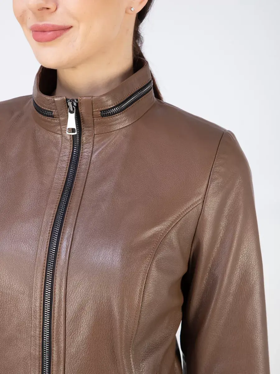 Эксклюзивная кожаная куртка женская весна - осень из нежной, натуральной кожи оленя - настоящая находка для стильных леди, стремящихся выглядеть безупречно в любое время года. Женская куртка весенняя и летняя изготовлена из высококачественной кожи, которая обеспечивает комфорт и долговечность в любое время. Четкий зернистый рисунок и более толстый слой волокон, которые придают этой весенней и летней куртке выдающуюся прочность и долговечность, отличают ее от других видов кожи. Она мягче, эластичнее и лучше пропускает воздух, чем другие виды кожи