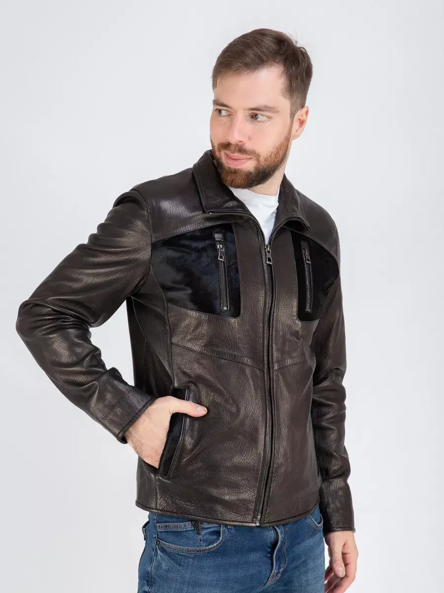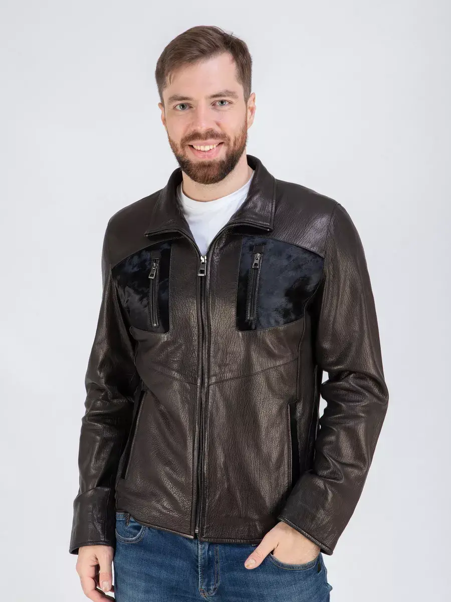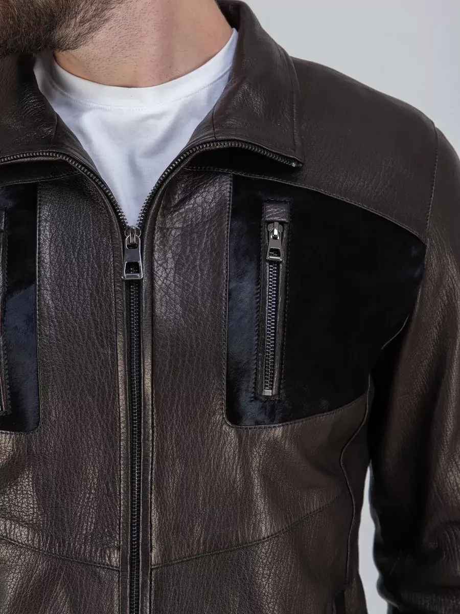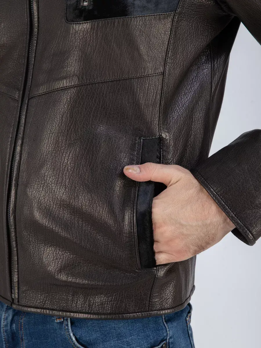 вставки меховые на груди, стойка воротник, куртка натуральная кожаная мужская