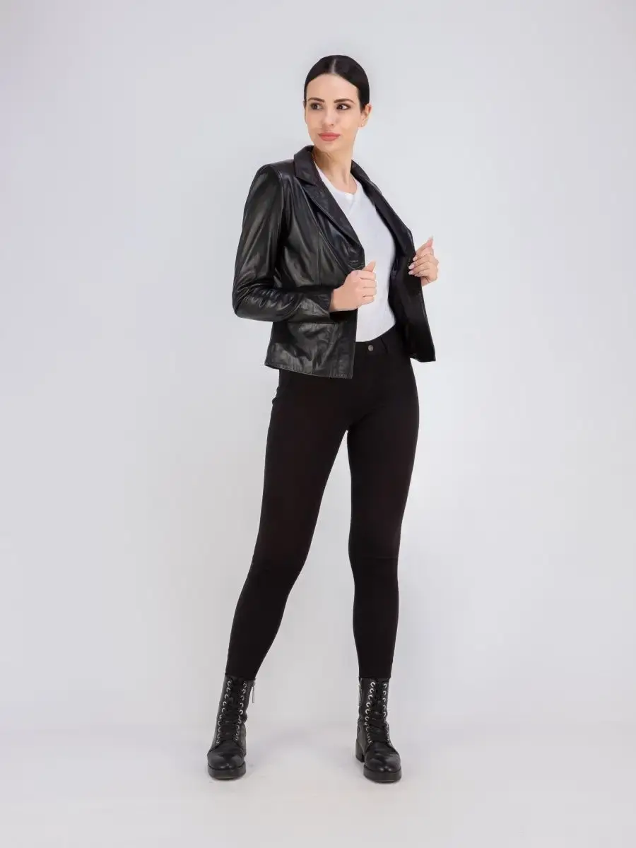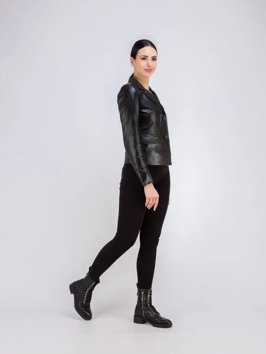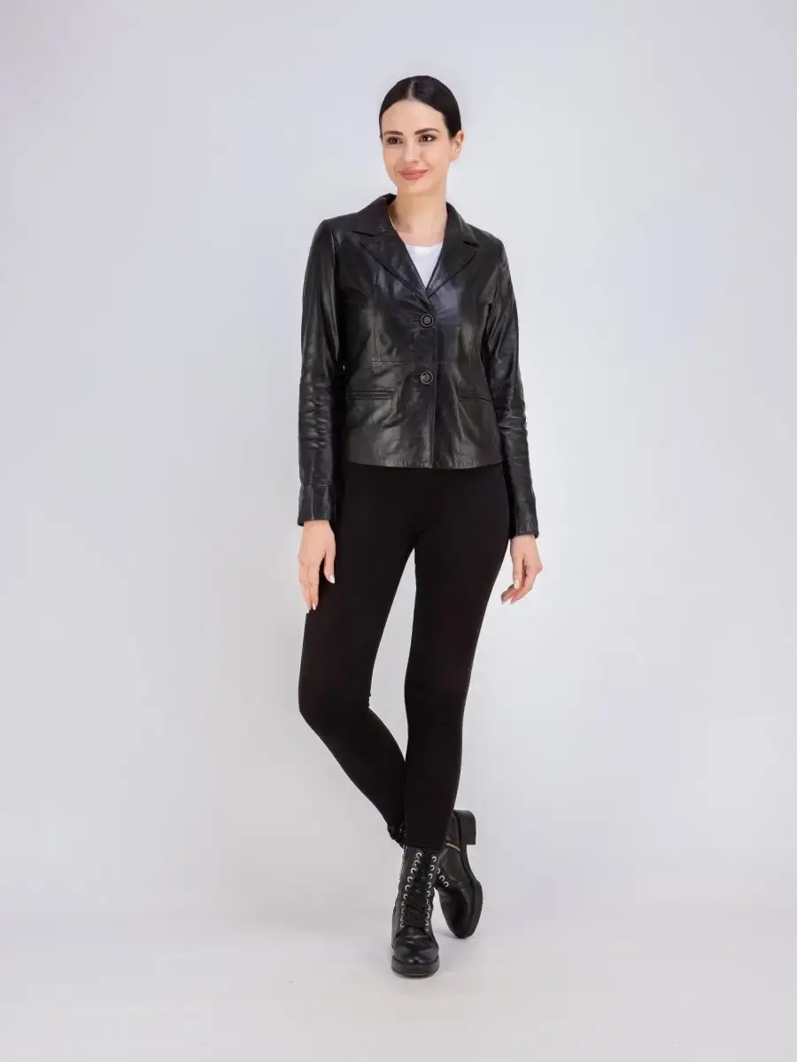 Кожаная куртка женская, кожаный пиджак женский из мягкой качественной натуральной кожи станет вашей любимой покупкой в новом сезоне. Стильный жакет прямого кроя с двумя пуговицами в качестве застежки. Короткая модель прямого кроя с классическими лацканами имеет удобный английский воротник и два передних кармана. Женский блейзер, куртка женская из натуральной кожи застёгивается спереди на две пуговицы. Прямой крой блейзера позволяет носить данную куртку девушкам и женщинам с любым типом фигуры. Пиджак женский, женскую куртку можно носить весной, летом и осенью, идеальное решение для создания универсального гардероба. Куртка пиджак женская прекрасно впишется практически в любой стиль - повседневный, городской, офисный и вечерний. Такую модель можно носить с брюками в деловом стиле, джинсами и зауженной юбкой карандаш.