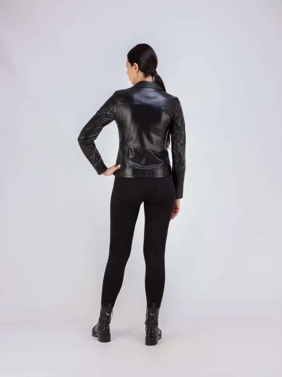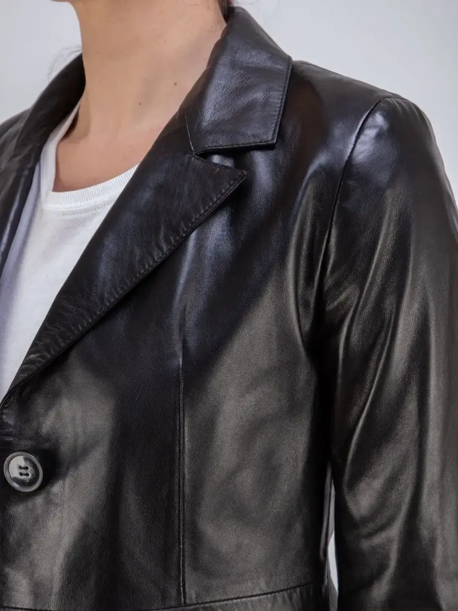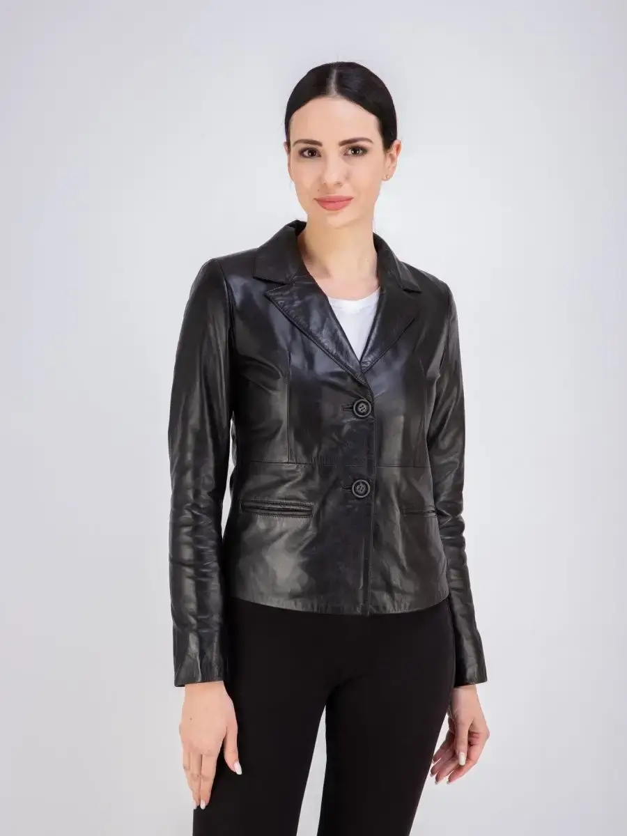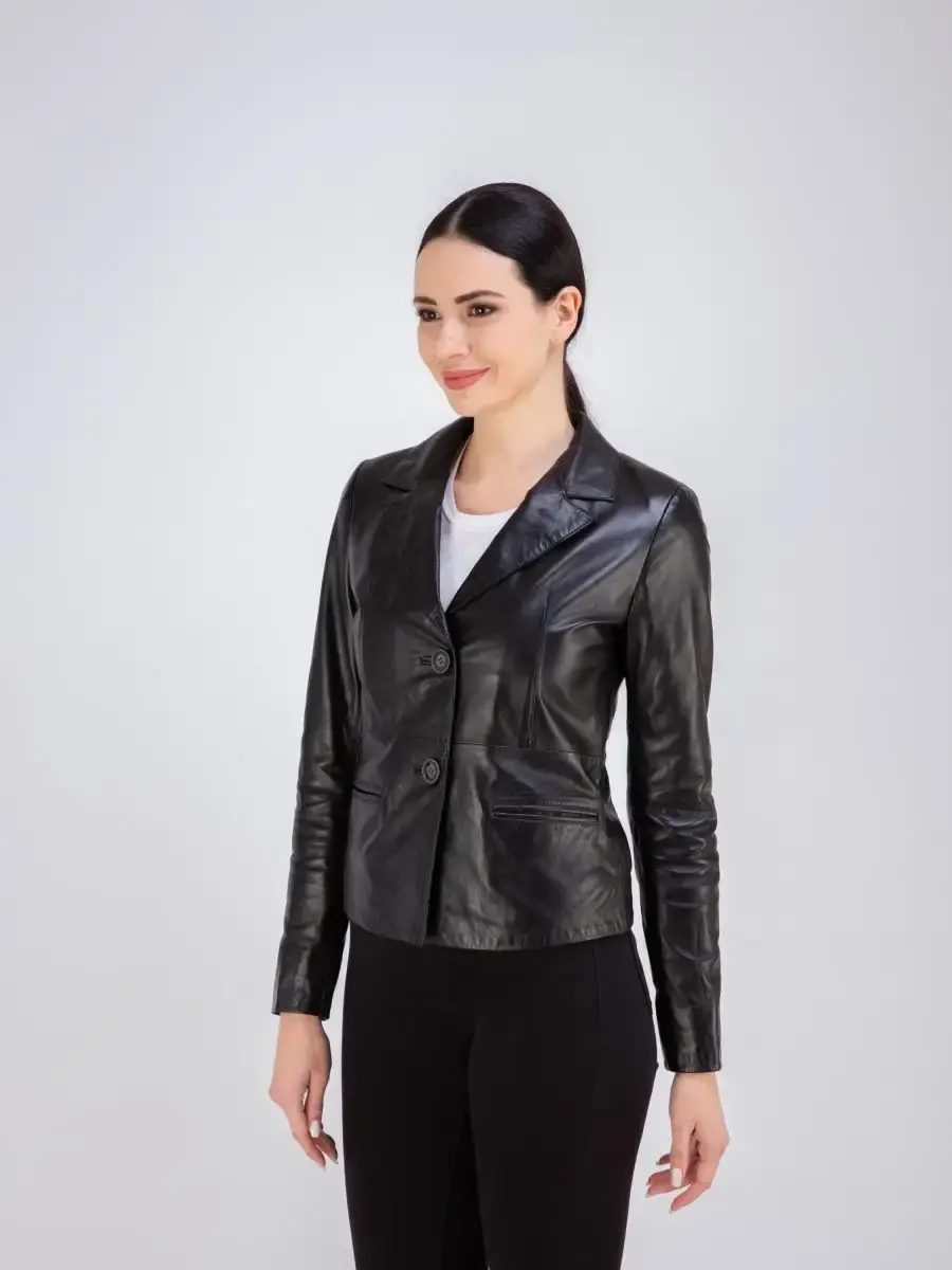 Кожаная куртка женская, кожаный пиджак женский из мягкой качественной натуральной кожи станет вашей любимой покупкой в новом сезоне. Стильный жакет прямого кроя с двумя пуговицами в качестве застежки. Короткая модель прямого кроя с классическими лацканами имеет удобный английский воротник и два передних кармана. Женский блейзер, куртка женская из натуральной кожи застёгивается спереди на две пуговицы. Прямой крой блейзера позволяет носить данную куртку девушкам и женщинам с любым типом фигуры. Пиджак женский, женскую куртку можно носить весной, летом и осенью, идеальное решение для создания универсального гардероба. Куртка пиджак женская прекрасно впишется практически в любой стиль - повседневный, городской, офисный и вечерний. Такую модель можно носить с брюками в деловом стиле, джинсами и зауженной юбкой карандаш.