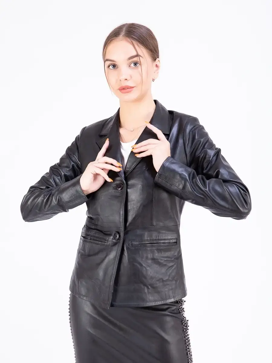 Кожаная куртка женская, кожаный пиджак женский из мягкой качественной натуральной кожи станет вашей любимой покупкой в новом сезоне. Стильный жакет прямого кроя с двумя пуговицами в качестве застежки. Короткая модель прямого кроя с классическими лацканами имеет удобный английский воротник и два передних кармана. Женский блейзер, куртка женская из натуральной кожи застёгивается спереди на две пуговицы. Прямой крой блейзера позволяет носить данную куртку девушкам и женщинам с любым типом фигуры. Пиджак женский, женскую куртку можно носить весной, летом и осенью, идеальное решение для создания универсального гардероба. Куртка пиджак женская прекрасно впишется практически в любой стиль - повседневный, городской, офисный и вечерний. Такую модель можно носить с брюками в деловом стиле, джинсами и зауженной юбкой карандаш.