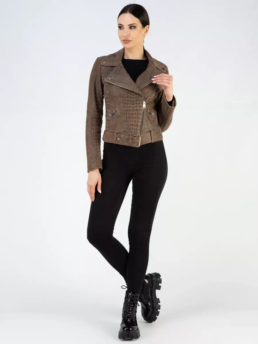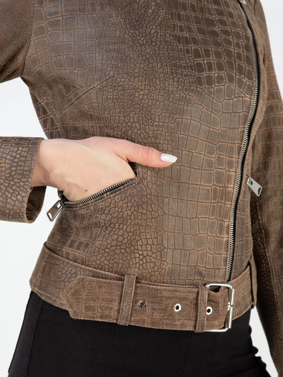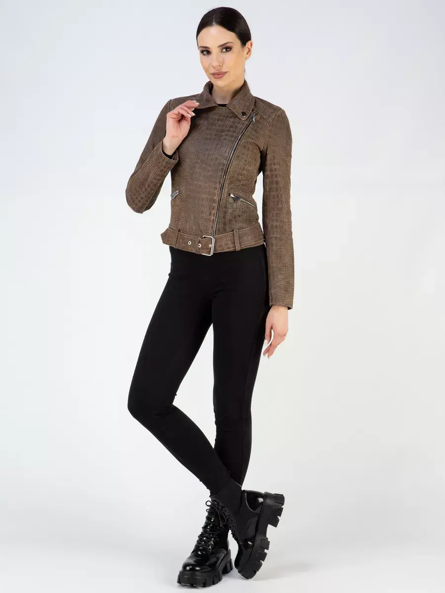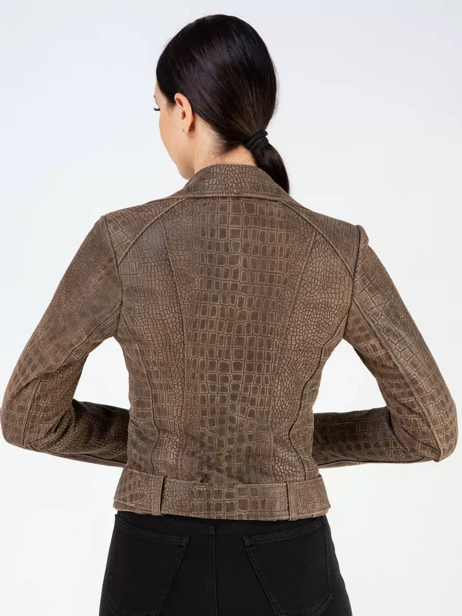 Эксклюзивная кожаная куртка женская, косуха женская кожаная из натуральной кожи с эффектным тиснением под кожу крокодила - это стильная и модная верхняя одежда, идеально подойдет для носки весной, летом и осенью. Кожаная куртка, косуха кожаная изготовлена из высококачественной натуральной кожи ягненка выделки нуплин, то же, что и крэк, но поверхность менее шероховатая (с винтаж-эффектом) - с эффектом старения и потертости. Кожа со специальной обработкой, благодаря которой изделие выглядит состаренным. Тиснение под кожу крокодила добавляет этой куртке загадочности и экзотичности, словно создавая магическую атмосферу вокруг её обладательницы.