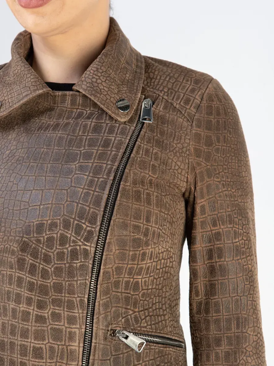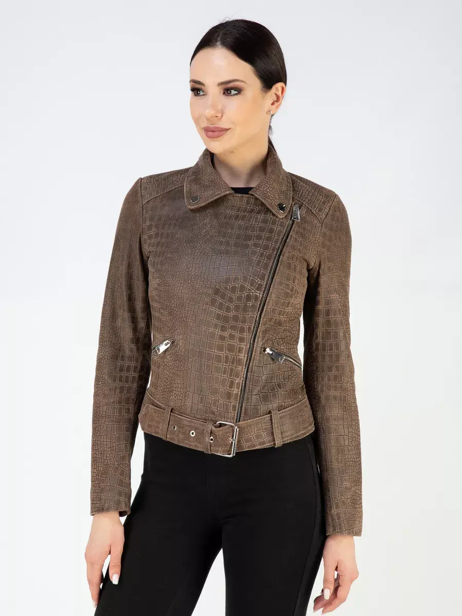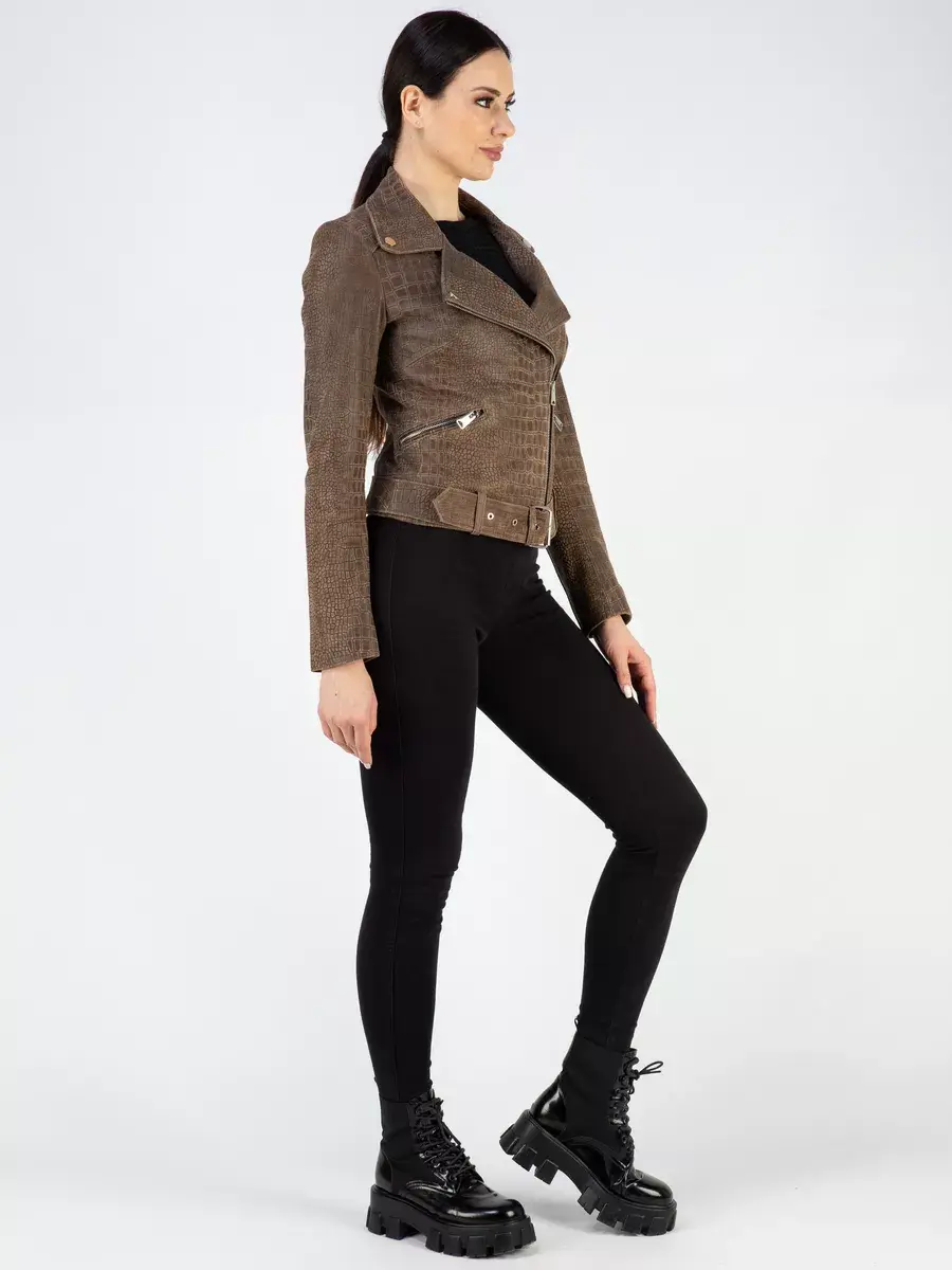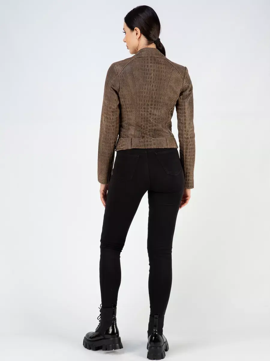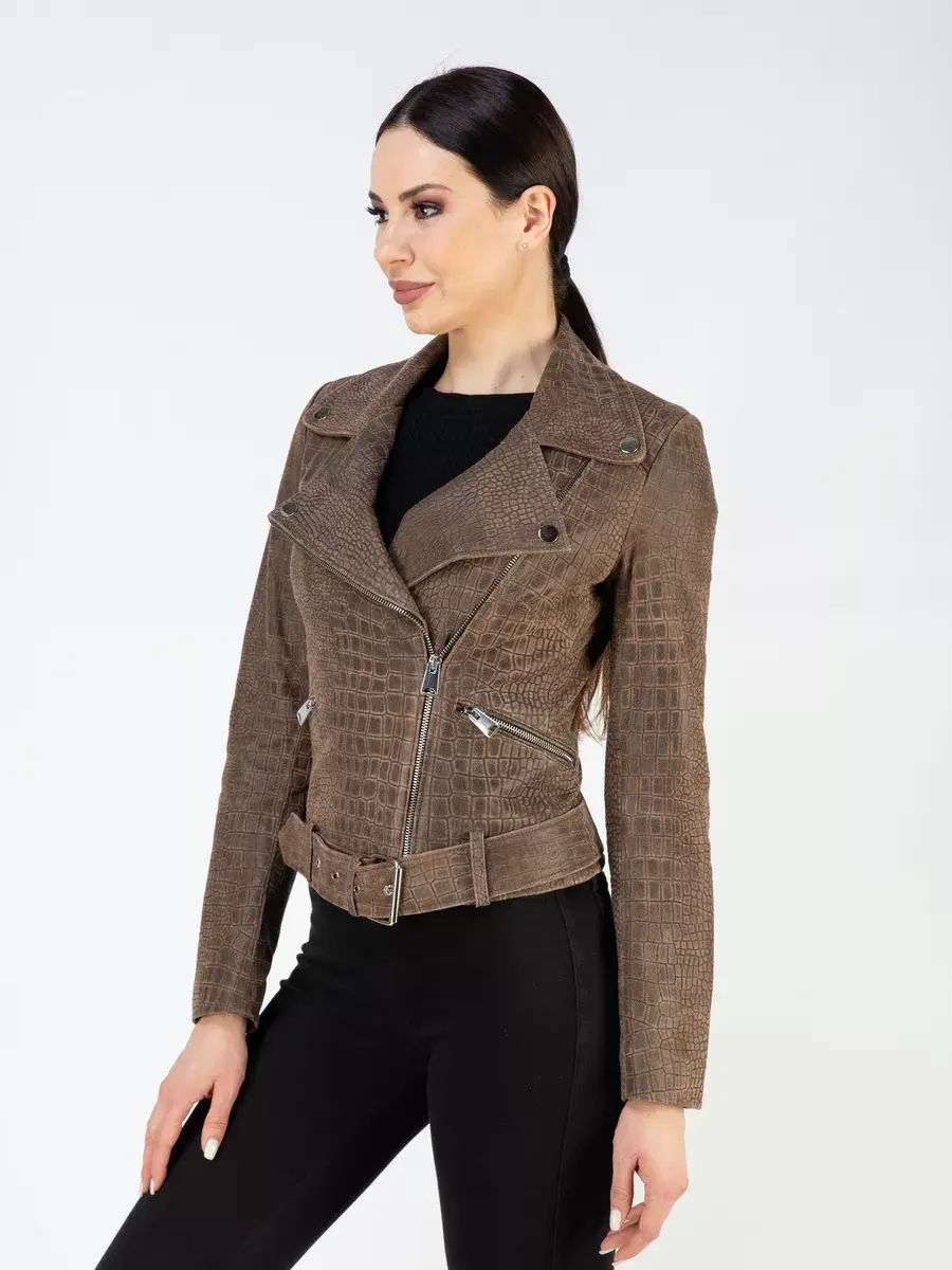 Эксклюзивная кожаная куртка женская, косуха женская кожаная из натуральной кожи с эффектным тиснением под кожу крокодила - это стильная и модная верхняя одежда, идеально подойдет для носки весной, летом и осенью. Кожаная куртка, косуха кожаная изготовлена из высококачественной натуральной кожи ягненка выделки нуплин, то же, что и крэк, но поверхность менее шероховатая (с винтаж-эффектом) - с эффектом старения и потертости. Кожа со специальной обработкой, благодаря которой изделие выглядит состаренным. Тиснение под кожу крокодила добавляет этой куртке загадочности и экзотичности, словно создавая магическую атмосферу вокруг её обладательницы.