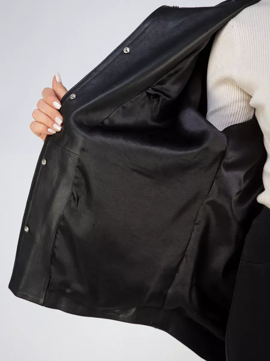 Каждая деталь этой кожаной куртки выполнена с особым вниманием к качеству материалов. Ровные швы, прорезные карманы с декоративными клапанами, манжеты с модными кнопками и ассиметричный подол добавляют акценты стиля и функциональности, делают эту женскую куртку универсальным элементом гардероба, который подходит практически под любой стиль, деловой или повседневный. Стильная застежка на декоративных кнопках придаёт образу особый шарм. Классический отложной воротник добавляет изюминку образу, делая его неповторимым.