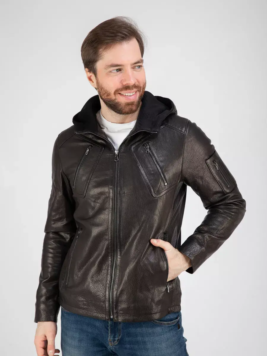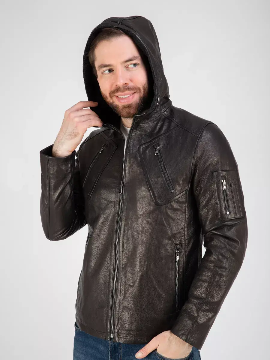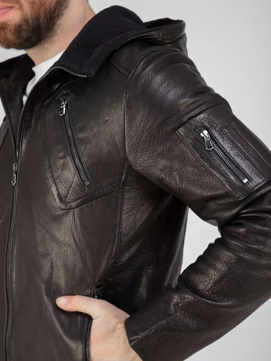 кулиска на капюшоне, карманы, куртка мужская кожаная,