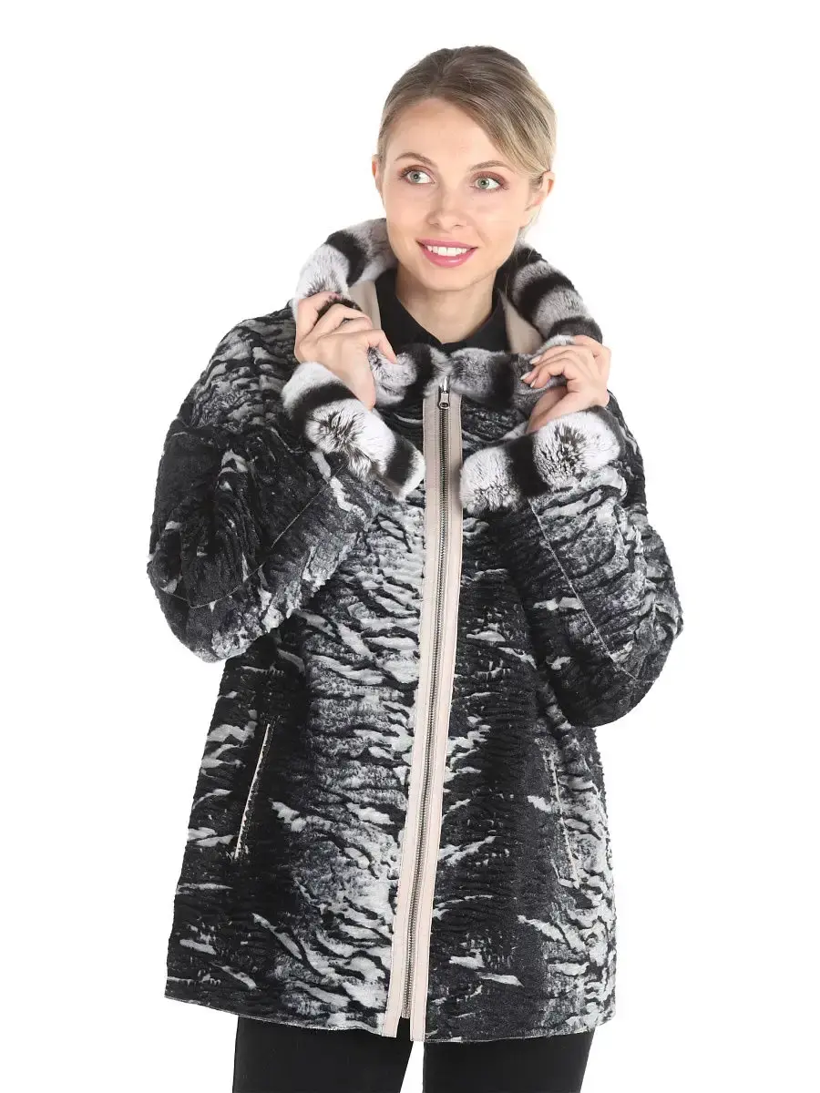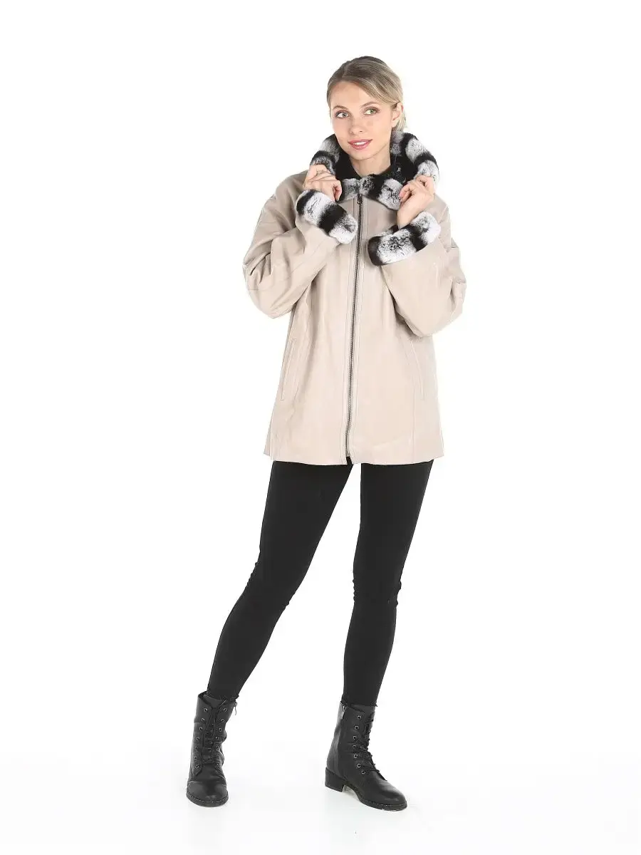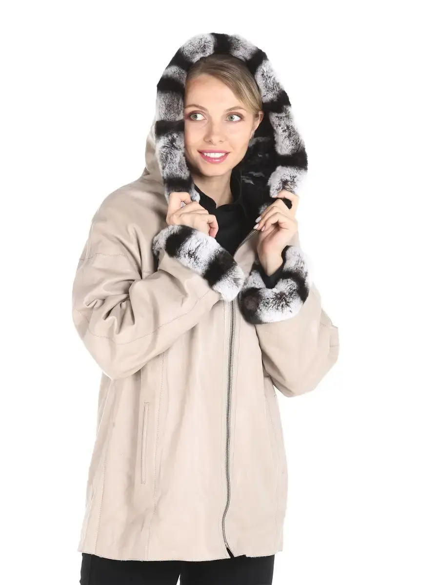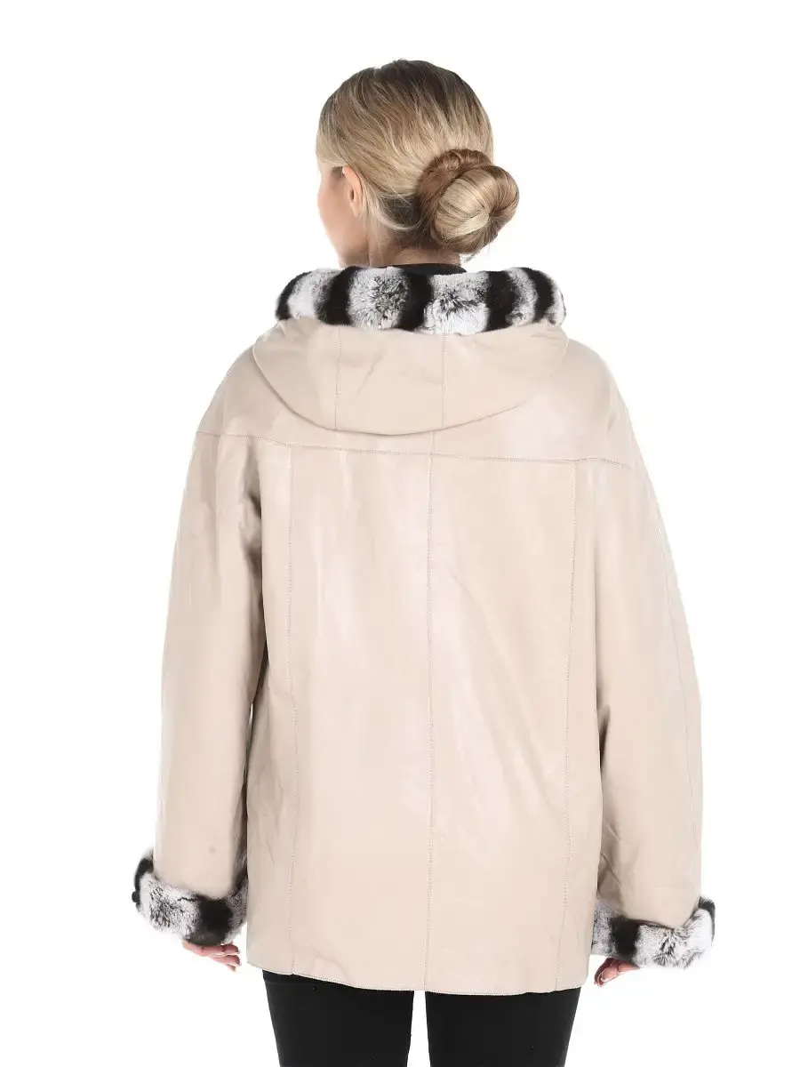 Женская двусторонняя куртка из 100% натуральной кожи ягненка. Капюшон - несъёмный. Опушка на капюшоне и рукавах несъемный, из натурального меха кролика - рекс. Подкладка - обратная сторона из искусственного меха. MONDIAL Производство Турция.