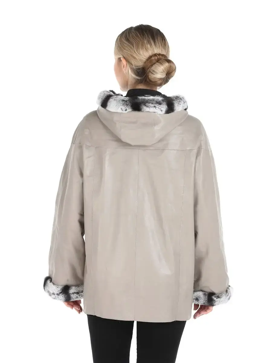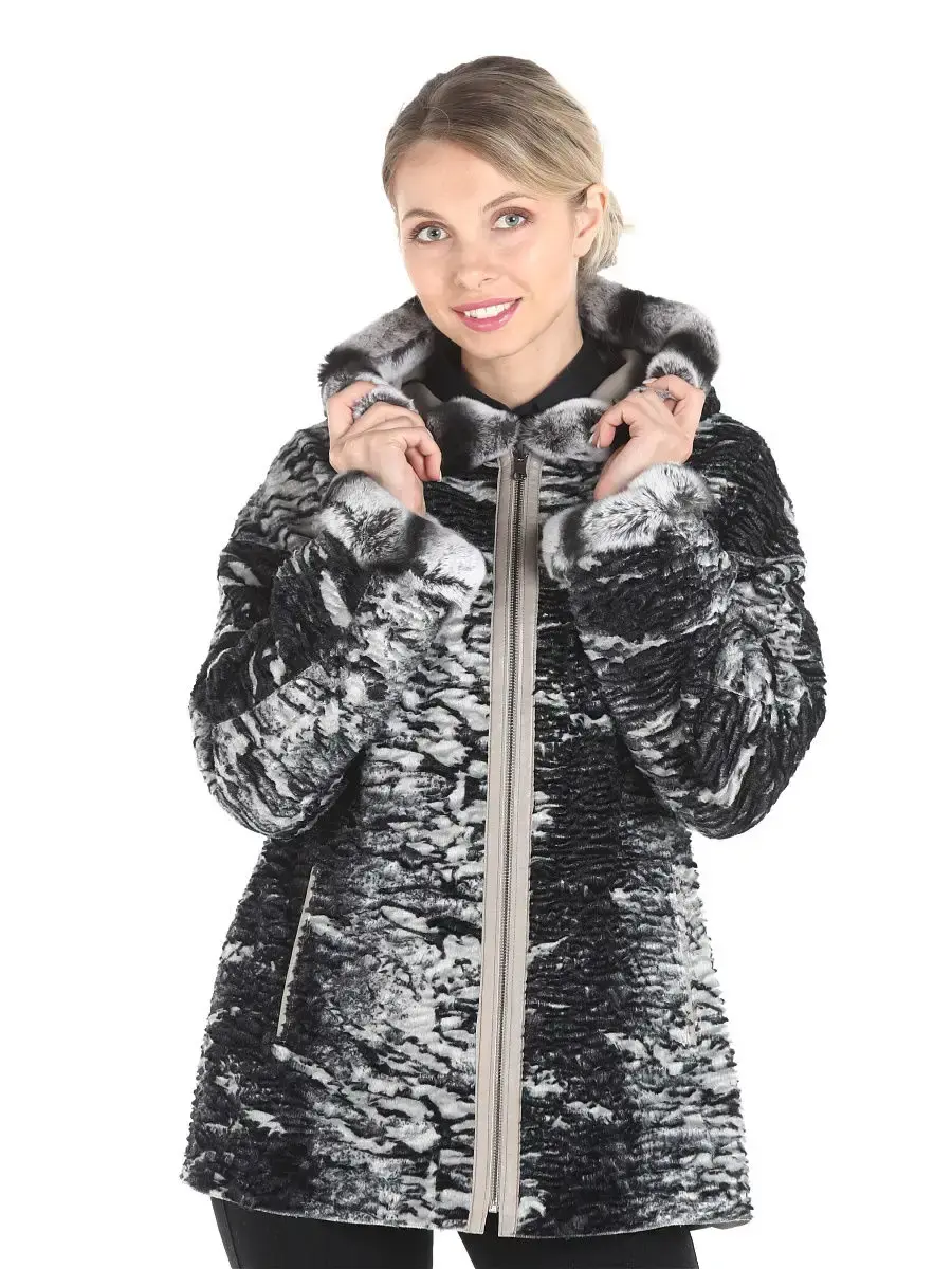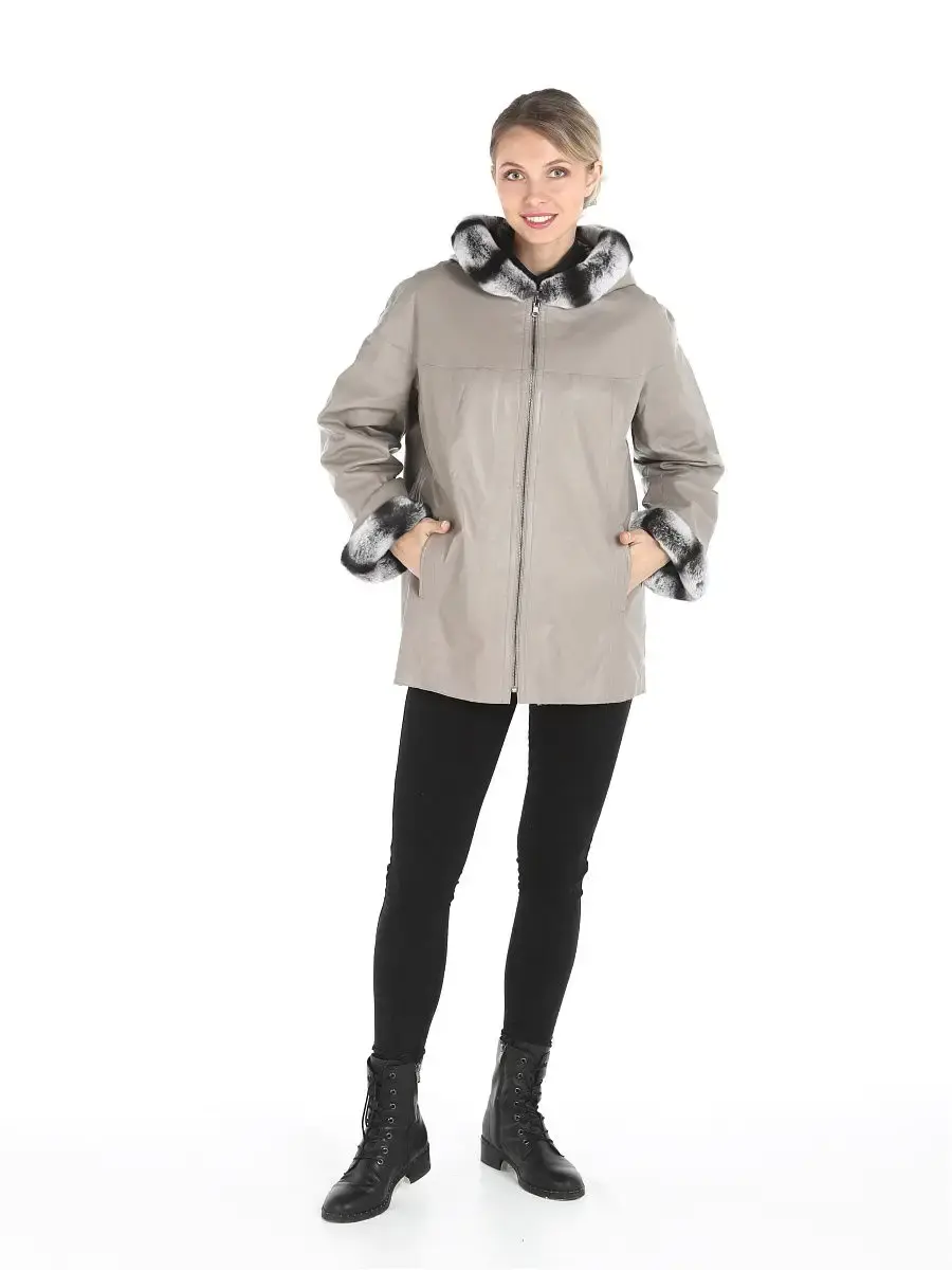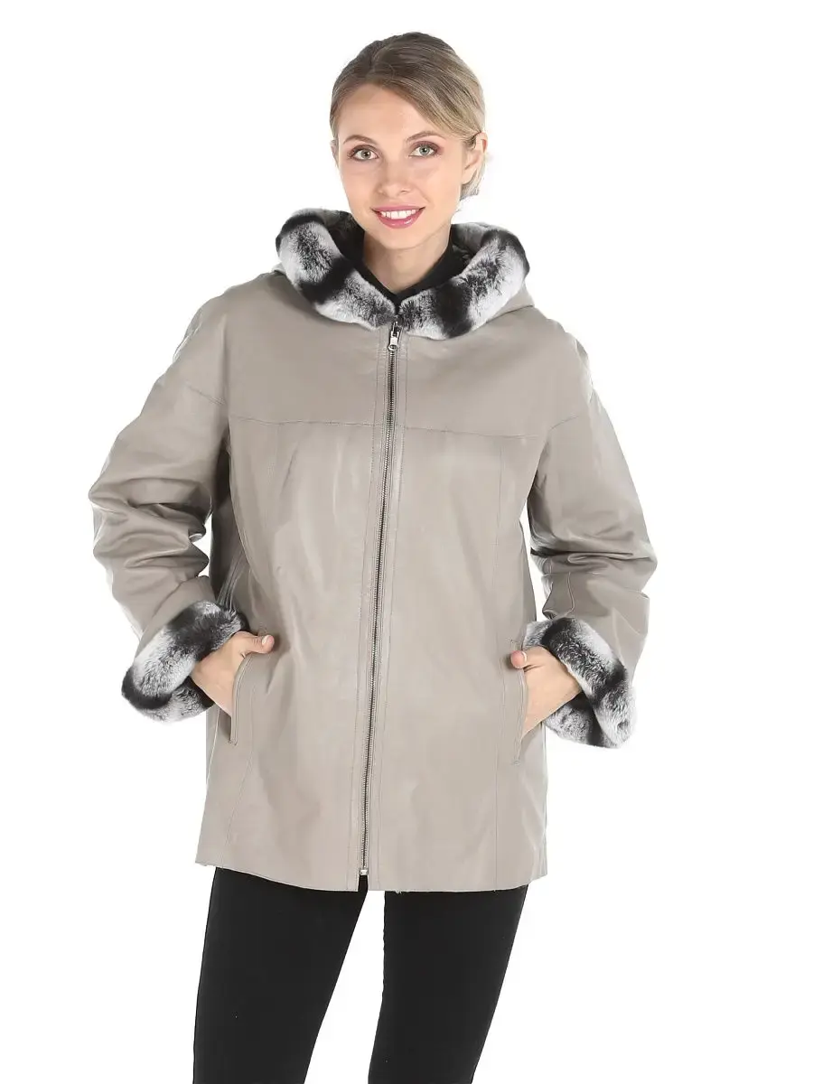 Женская двусторонняя куртка из 100% натуральной кожи ягненка. Капюшон - несъёмный. Опушка на капюшоне и рукавах несъемный, из натурального меха кролика - рекс. Подкладка - обратная сторона из искусственного меха. MONDIAL Производство Турция.