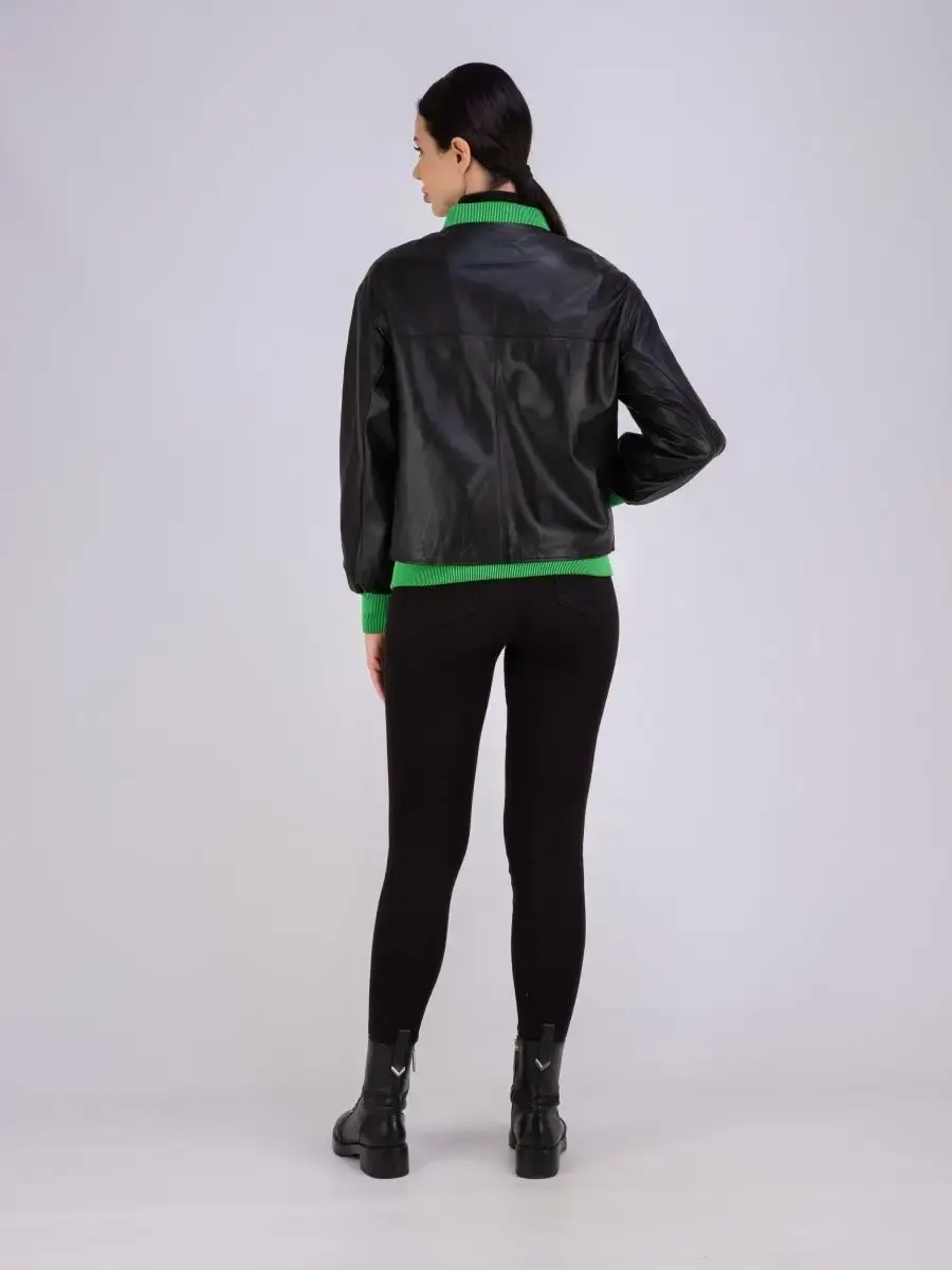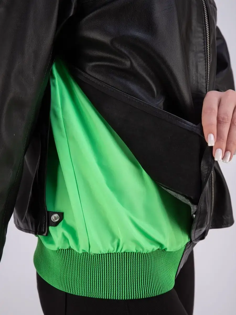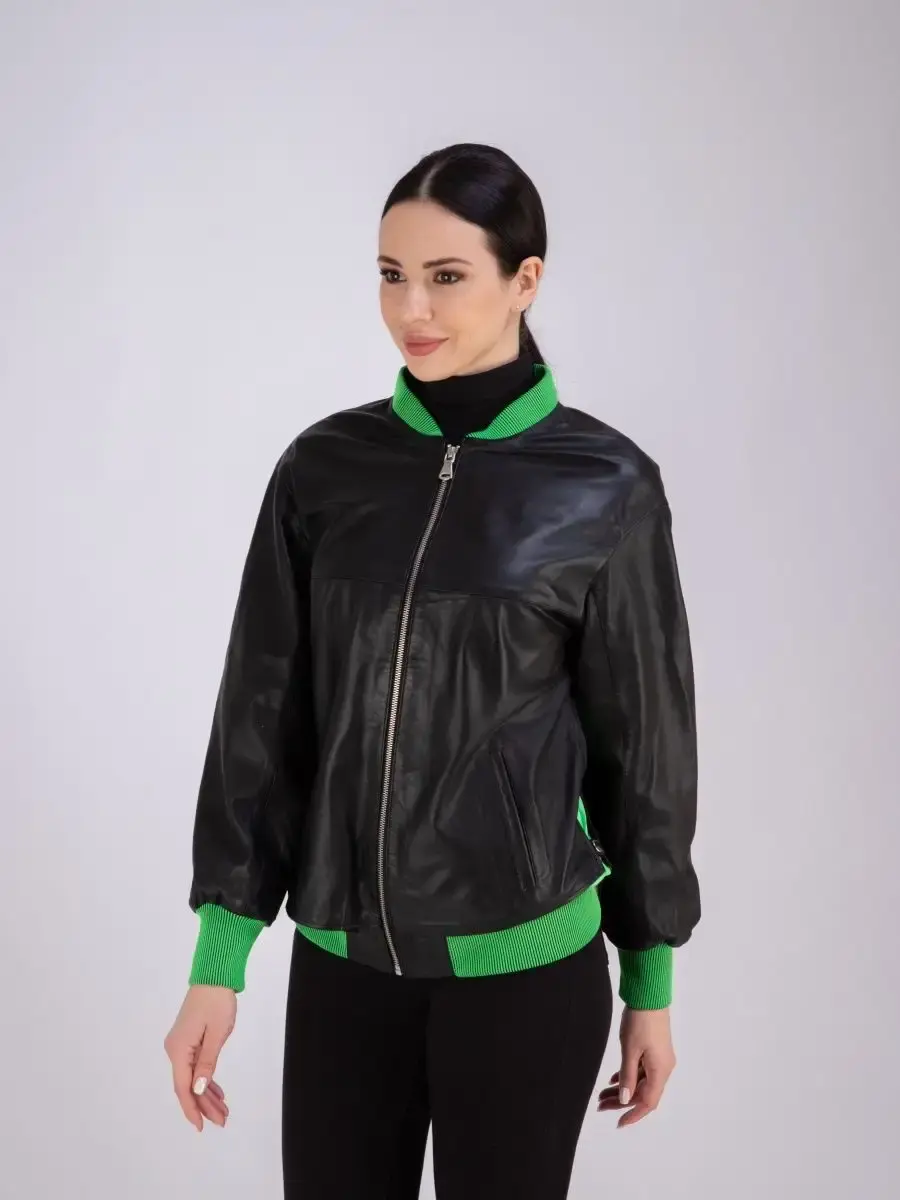 Модная кожаная куртка женская, бомбер из натуральной кожи прекрасно подходить для холодных дней весной, осенью и летом. Стильная куртка женская из натуральной кожи, куртка демисезонная женская выполнена из прочной и в то же время из мягкой и гладкой натуральной кожи ягненка. Женская куртка кожаная из натуральной кожи с застежкой на молнии с трикотажными вставками и манжетом зеленного цвета замечательный выбор, если вы намерены не только чувствовать себя комфортно, но и хотите выглядеть стильно и модно. Женская куртка бомбер с прорезными карманами отличный вариант на каждый день и сочетается с различными вещами. Кожаная куртка женская больших размеров, куртка кожаная женская с разрезом бо бокам на кнопке подчеркнет Вашу индивидуальность, как и в повседневном гардеробе так и в вечернем. Куртка женская кожаная оверсайз больших размеров свободного кроя. Вы можете купить куртки женские, куртки автоледи, короткие куртки, куртка женская весна в подарок со скидкой на странице бренда MONDIAL! Коллекция обновляется каждый сезон. Длина по спинке 65см. Производство Турция