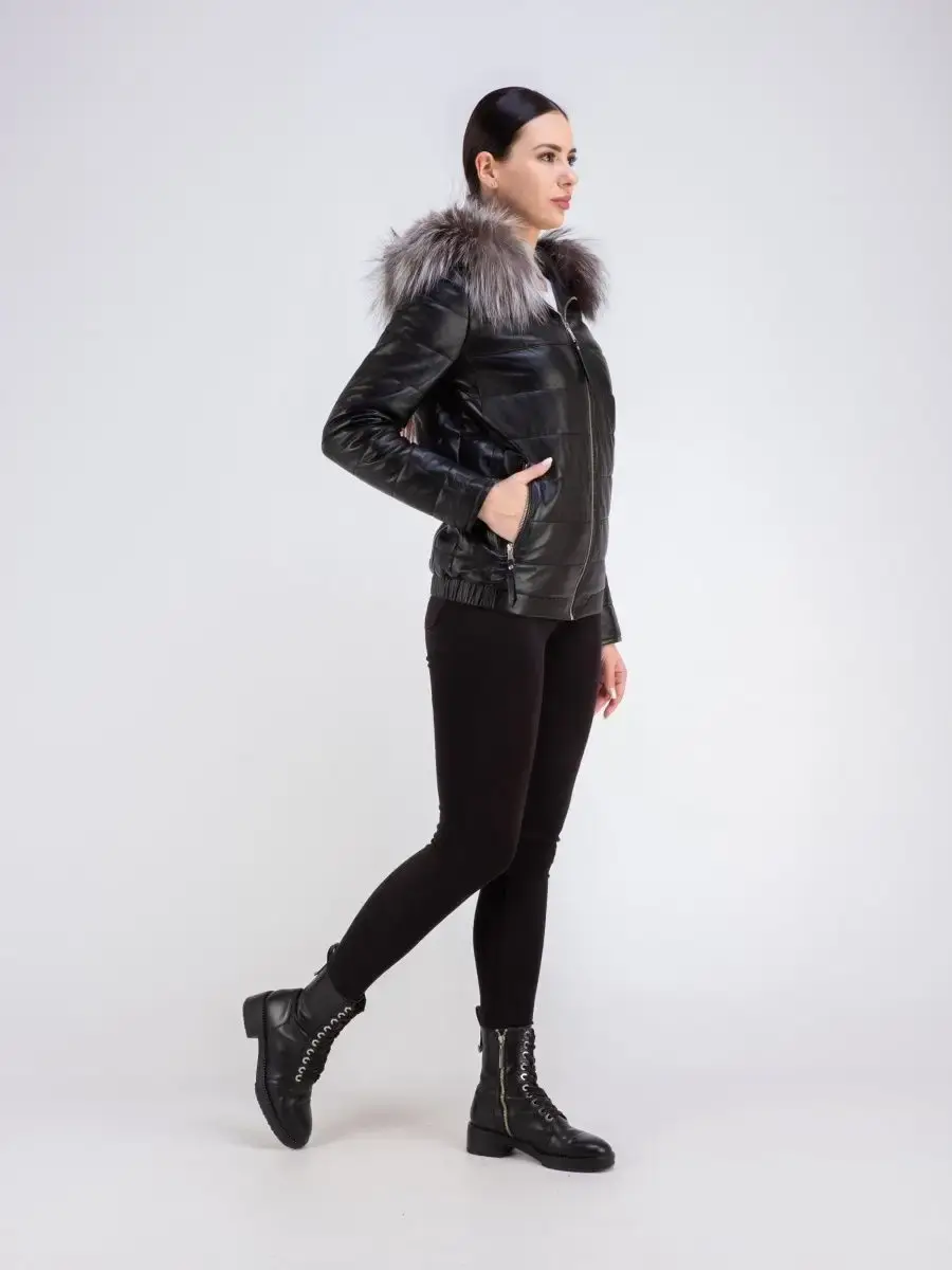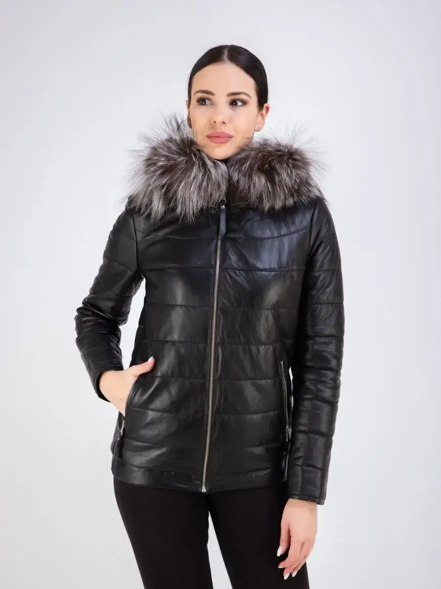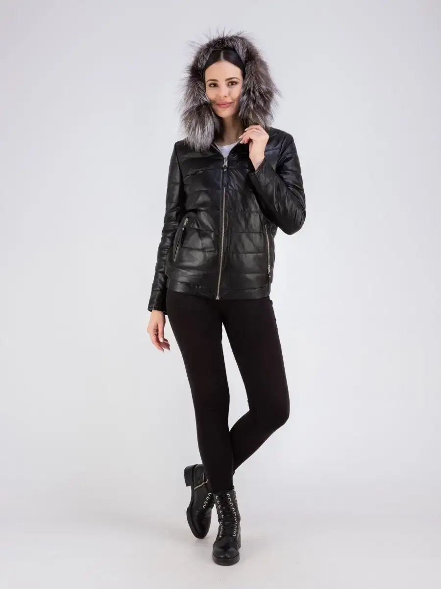 Куртка женская из натуральной кожи с мехом на капюшоне. Кожаная куртка с капюшоном с опушкой из меха лисы. Куртка демисезонная женская капюшон не отстегивается, меховая опушка на капюшоне съемная на кнопках. Классическая куртка женская весна - осень с капюшоном демисезонная с застежкой на молнии свободного кроя, подойдет под любой образ, отлично смотреться как на невысоких, так и на девушках с высоким ростом. Куртка женская демисезонная станет изюминкой вашего гардероба, подчеркнет Вашу индивидуальность, как и в повседневном гардеробе так и в вечернем! Такую модель можно носить с брюками в деловом стиле, джинсами и юбками. Кожаная куртка женская, куртка кожаная женская свободного кроя прекрасно впишется практически в любой стиль - повседневный, городской, офисный и вечерний. Водонепроницаемая утепленная куртка, куртка женская натуральная из гладкой кожи с утягивающей резинкой по бокам защитит от ветра и дождя весной, осенью, летом. Вы можете купить куртки женские, косуха женская кожаная, женская куртка, косуха женская укороченная, кожаная куртка женская, косуха для девочки, куртка кожаная женская в подарок со скидкой на странице бренда MONDIAL! Длина по спинке 60см. Производство Турция