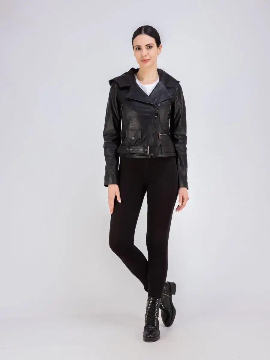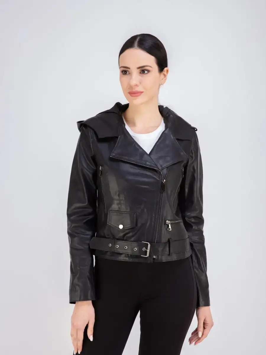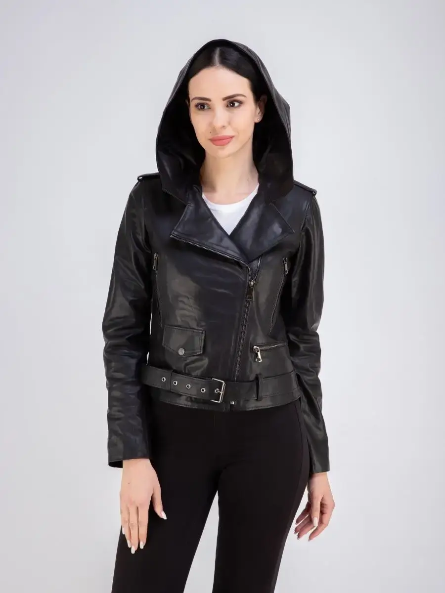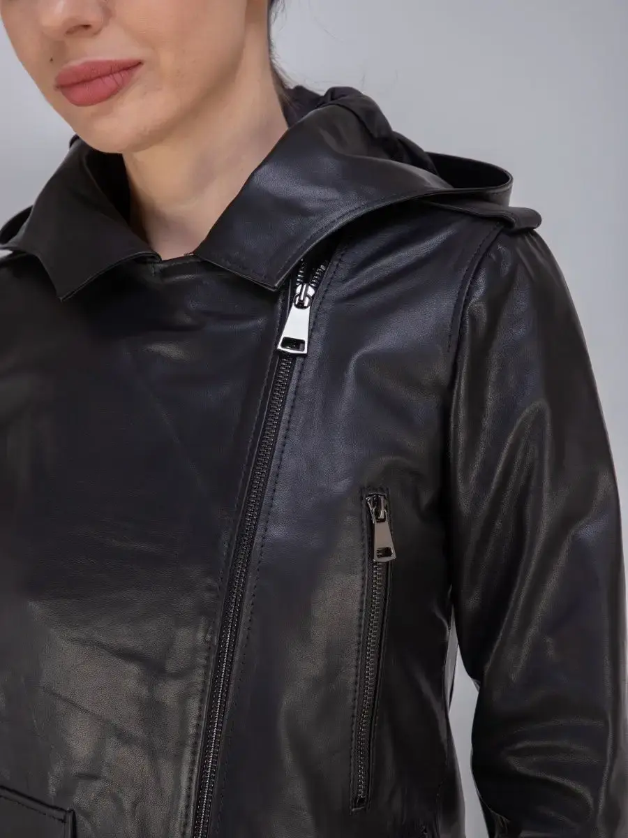 Куртка женская из натуральной кожи с капюшоном. Женская кожаная куртка выполнена из гладкой и мягкой кожи. Куртка кожаная женская - капюшон не съемный, застежка на молнии, прорезные карманы на молнии. Кожаная куртка женская натуральная универсальная, классическая модель с ассиметричной застежкой и молниями на рукавах идеально впишется в Ваш гардероб. Сочетание дизайна с долговечностью, драгоценностью и мягкостью натуральной кожи делает женские кожаные куртки идеальным предметом женской одежды. Куртка демисезонная женская, куртка женская весна приталенного кроя подчеркнет Вашу индивидуальность, куртка женская короткая станет изюминкой вашего гардероба. Такую модель куртки, косухи можно носить с брюками в деловом стиле, джинсами и юбками. Вы можете купить куртки женские, куртки автоледи, короткие куртки, куртка женская демисезонная в подарок со скидкой на странице бренда MONDIAL! Коллекция обновляется каждый сезон. Длина по спинке 55см. Производство Турция