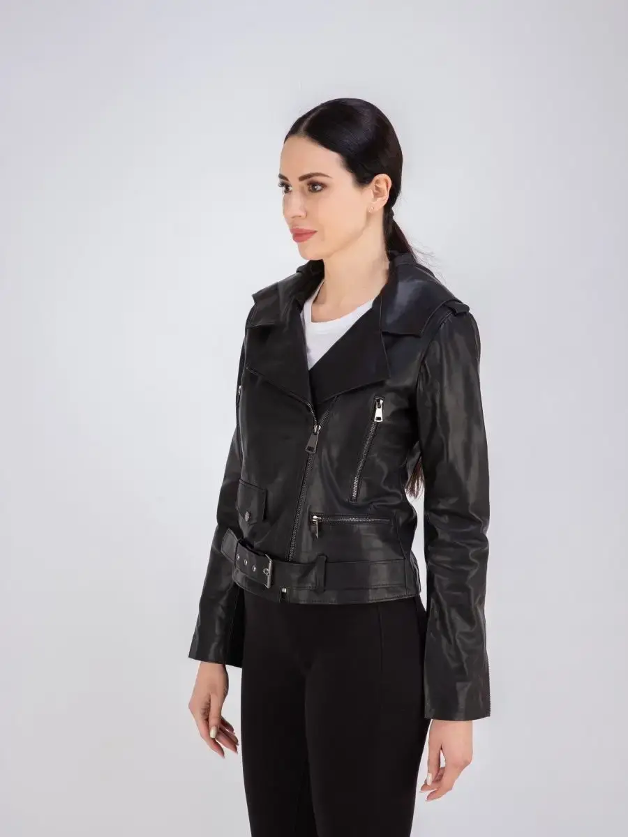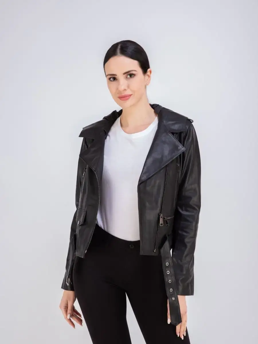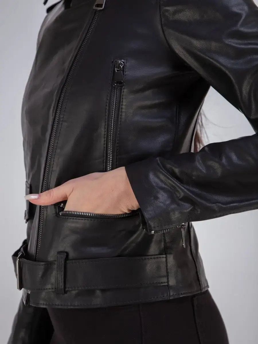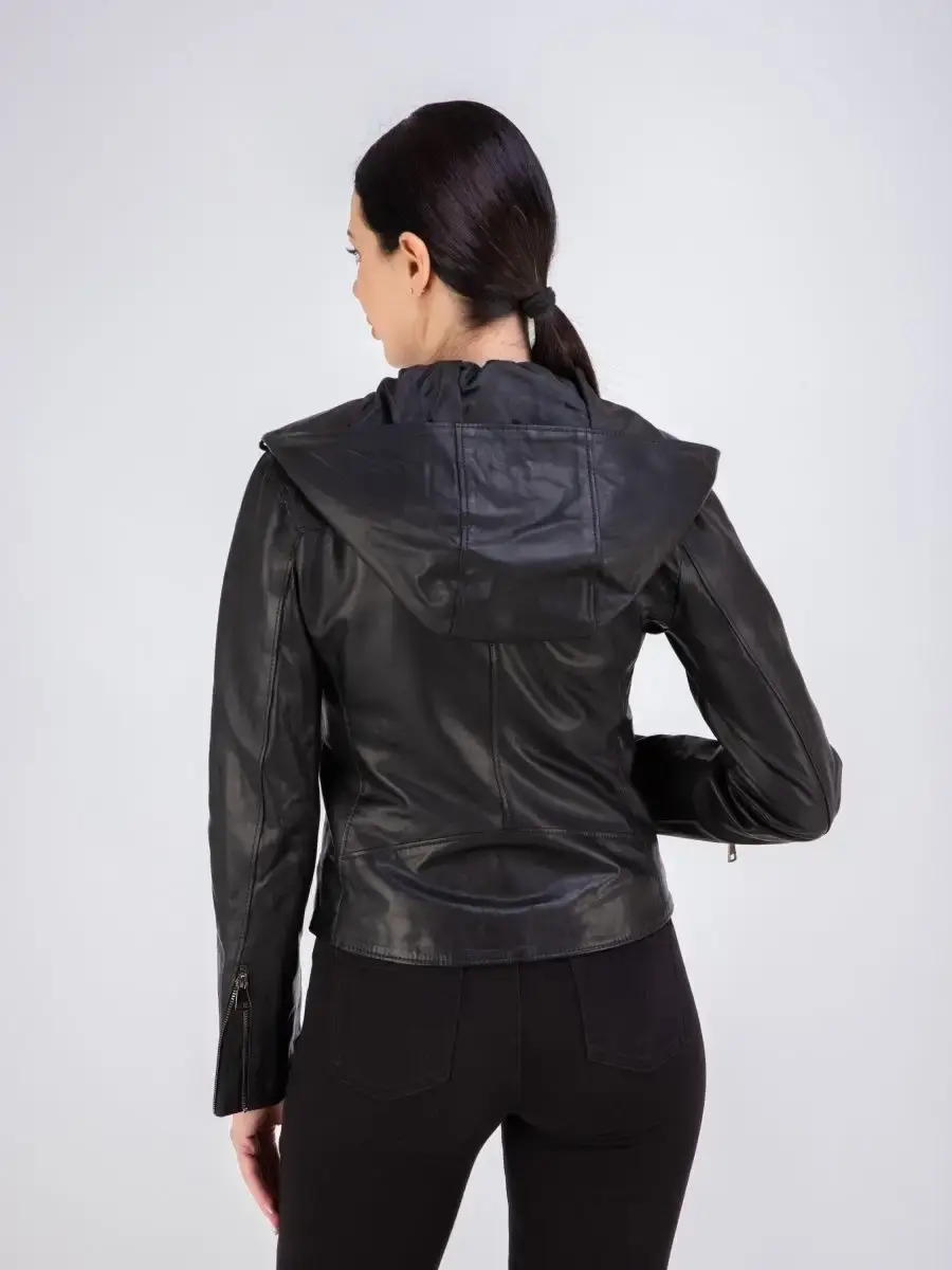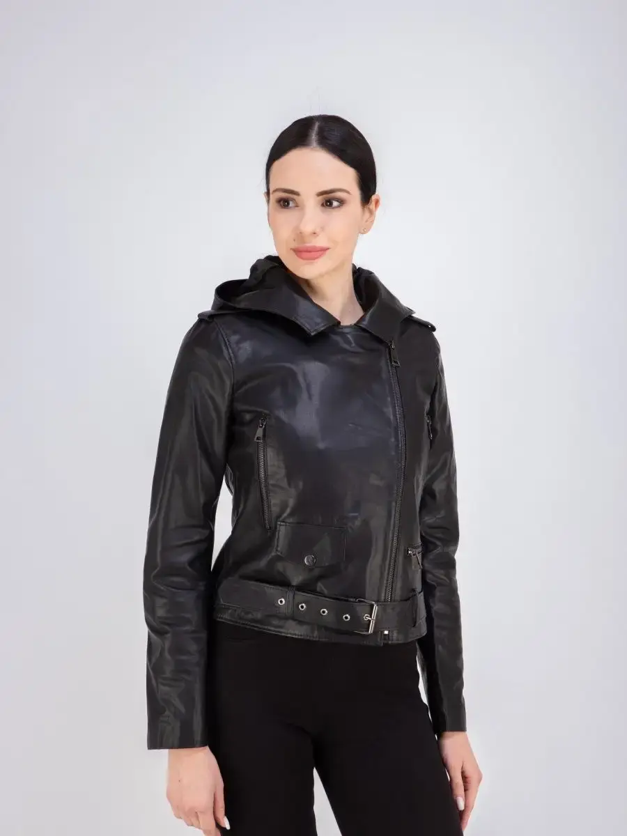 Куртка женская из натуральной кожи с капюшоном. Женская кожаная куртка выполнена из гладкой и мягкой кожи. Куртка кожаная женская - капюшон не съемный, застежка на молнии, прорезные карманы на молнии. Кожаная куртка женская натуральная универсальная, классическая модель с ассиметричной застежкой и молниями на рукавах идеально впишется в Ваш гардероб. Сочетание дизайна с долговечностью, драгоценностью и мягкостью натуральной кожи делает женские кожаные куртки идеальным предметом женской одежды. Куртка демисезонная женская, куртка женская весна приталенного кроя подчеркнет Вашу индивидуальность, куртка женская короткая станет изюминкой вашего гардероба. Такую модель куртки, косухи можно носить с брюками в деловом стиле, джинсами и юбками. Вы можете купить куртки женские, куртки автоледи, короткие куртки, куртка женская демисезонная в подарок со скидкой на странице бренда MONDIAL! Коллекция обновляется каждый сезон. Длина по спинке 55см. Производство Турция