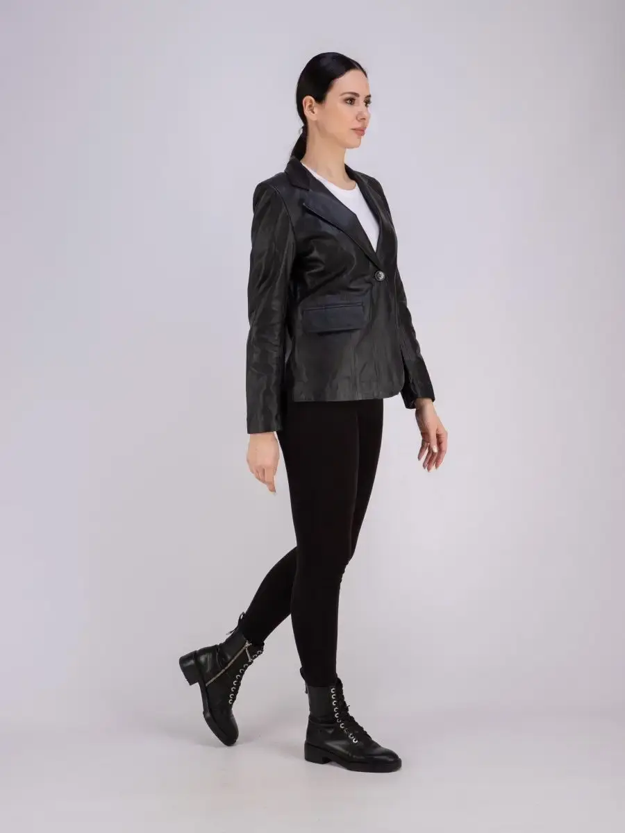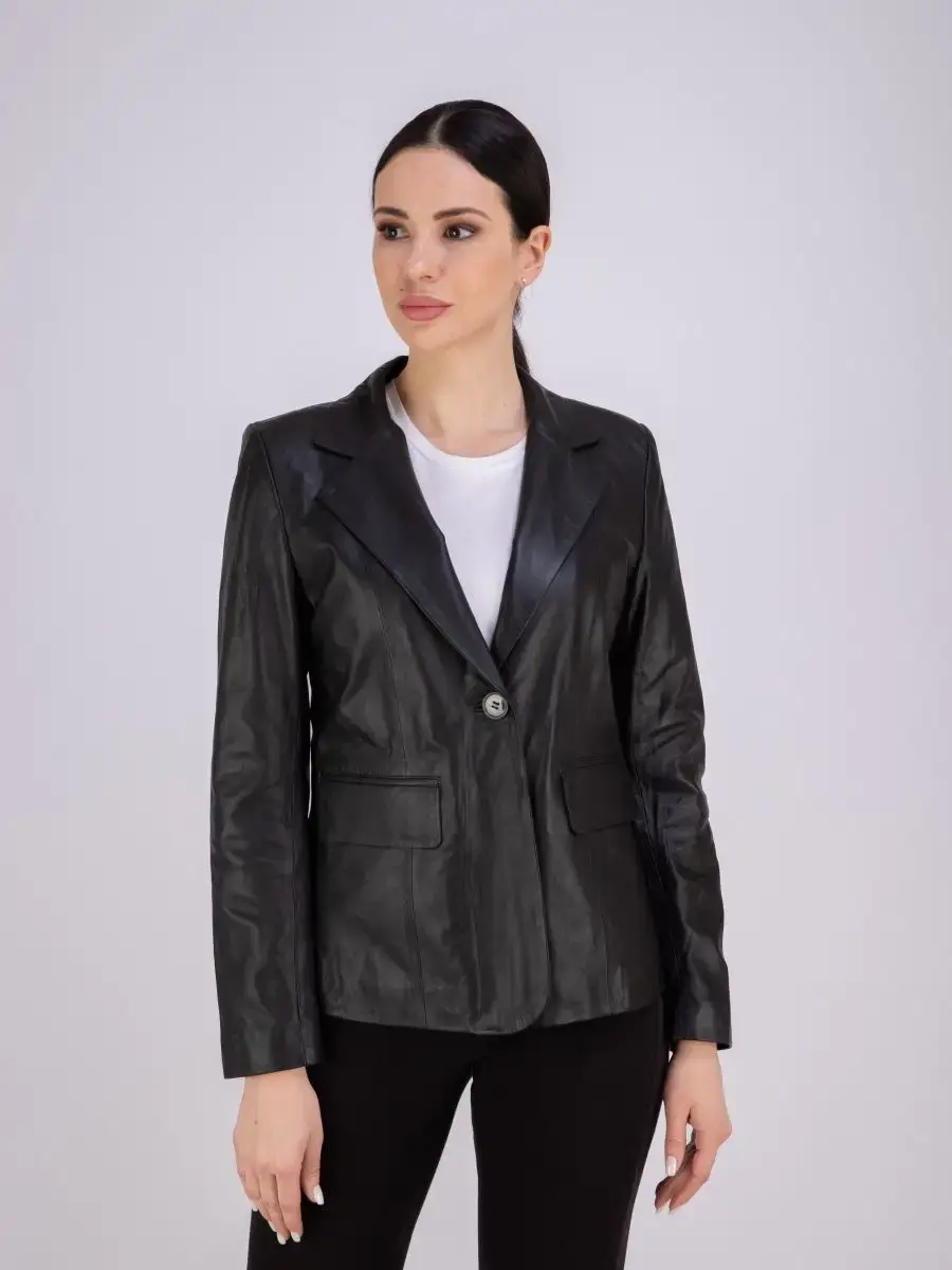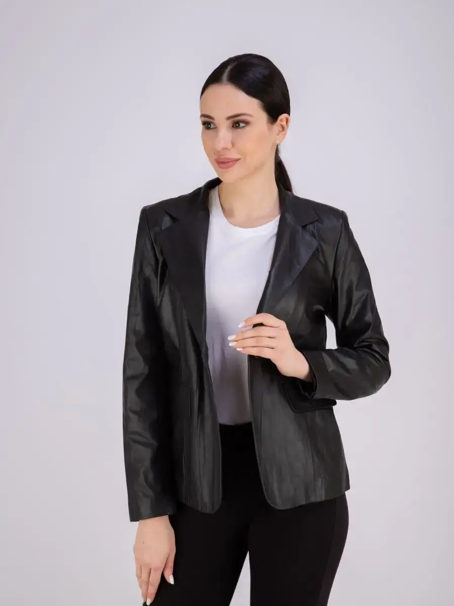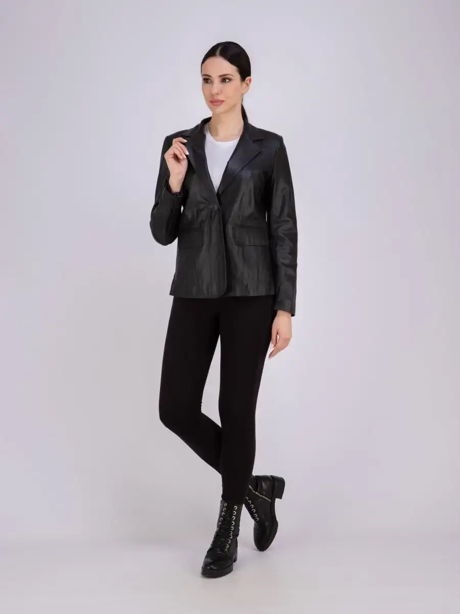 Кожаная куртка женская, кожаный пиджак женский из мягкой качественной натуральной кожи станет вашей любимой покупкой в новом сезоне. Стильный жакет прямого кроя с одной пуговицей в качестве застежки. Пиджак прямого кроя - большие размеры с классическими лацканами имеет удобный английский воротник и два передних кармана с клапанами. Женский блейзер, куртка женская из натуральной кожи застёгивается спереди на одну пуговицу. Прямой - свободный крой блейзера позволяет носить данную куртку девушкам и женщинам с любым типом фигуры, идеально подойдет для полных дам - оверсайз. Пиджак женский, женскую куртку можно носить весной, летом и осенью, идеальное решение для создания универсального гардероба. Куртка пиджак женская прекрасно впишется практически в любой стиль - повседневный, городской, офисный и вечерний. Такую модель можно носить с брюками в деловом стиле, джинсами и зауженной юбкой карандаш. Вы можете купить куртки женские, куртка женская демисезонная, пиджаки кожаные, куртка демисезонная женская куртка кожаная женская, куртка женская весна, короткие куртки в подарок для высоких, для невысоких, для женщин, для девочки со скидкой на странице бренда MONDIAL! Длина по спинке 75см. Производство Турция