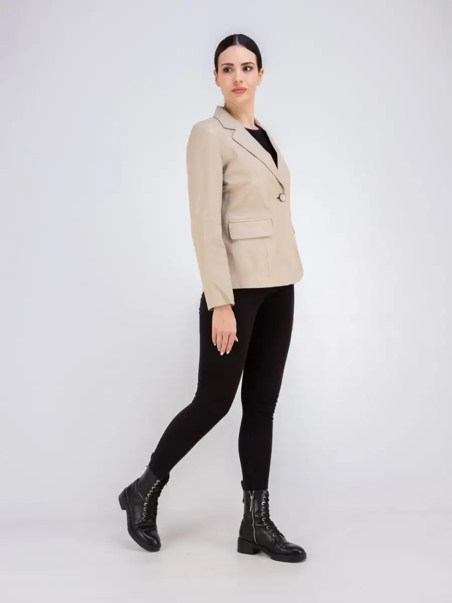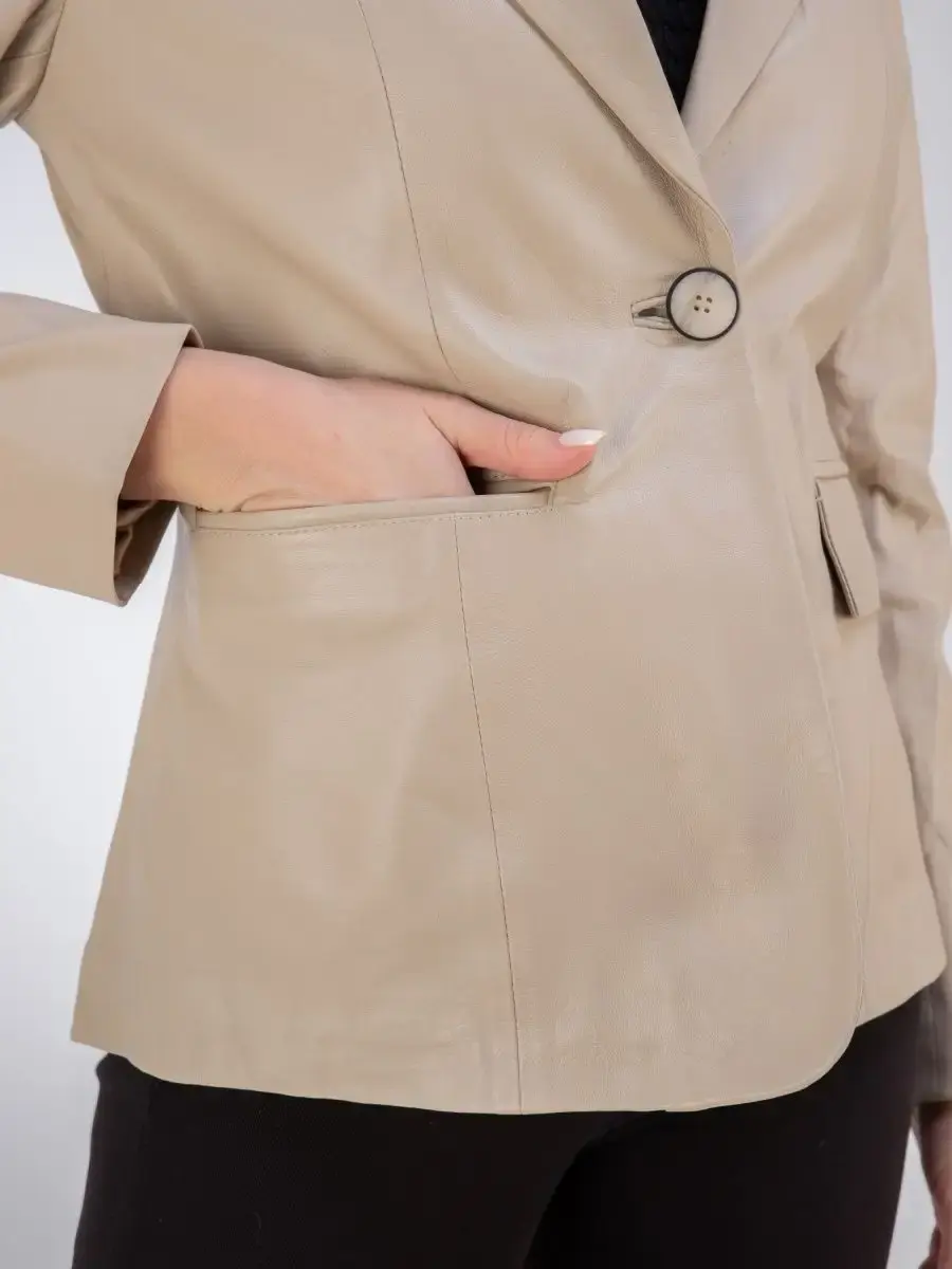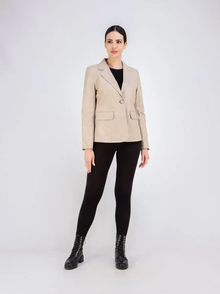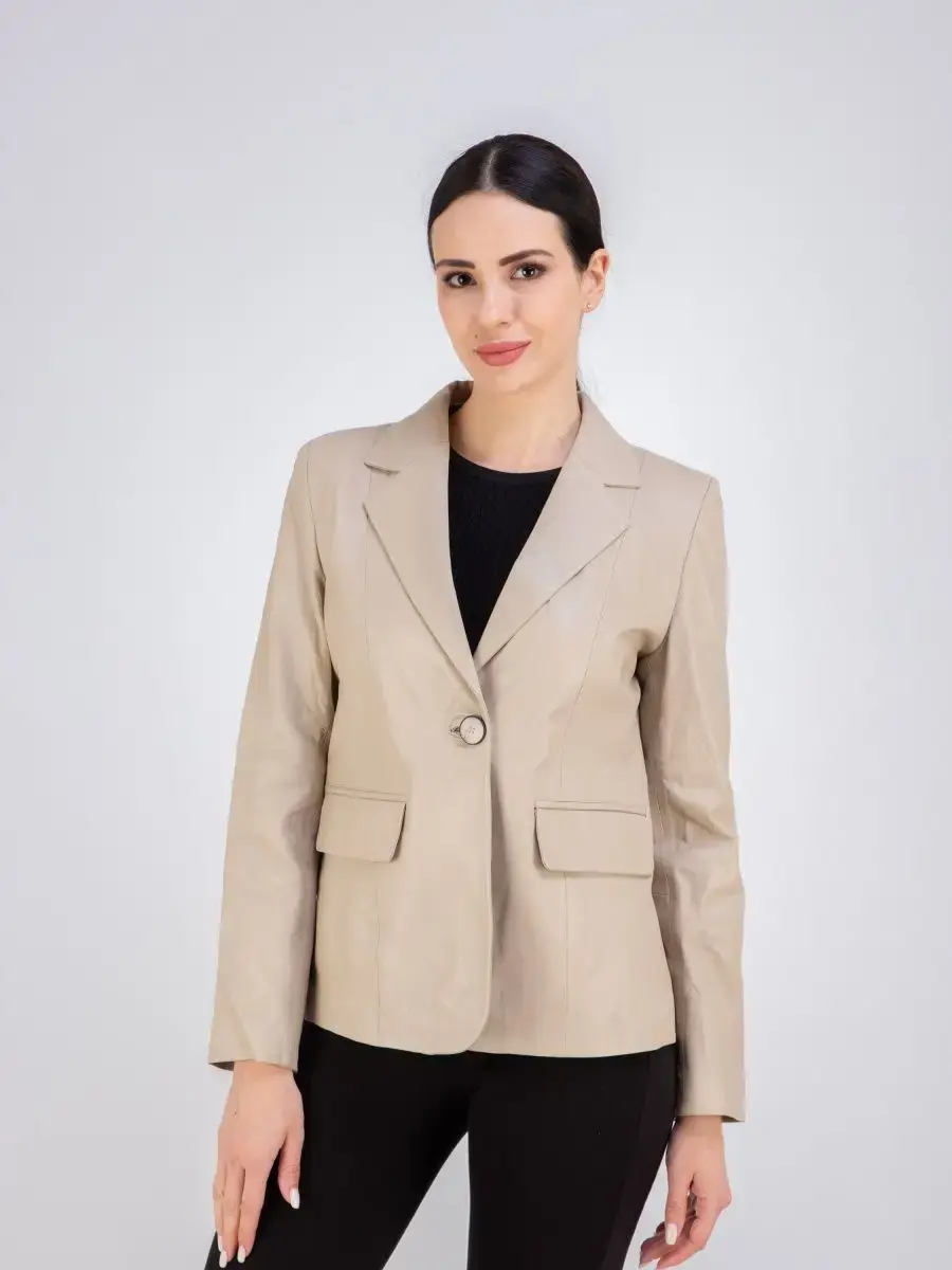 Кожаная куртка женская, кожаный пиджак женский из мягкой качественной натуральной кожи станет вашей любимой покупкой в новом сезоне. Стильный жакет прямого кроя с одной пуговицей в качестве застежки. Пиджак прямого кроя - большие размеры с классическими лацканами имеет удобный английский воротник и два передних кармана с клапанами. Женский блейзер, куртка женская из натуральной кожи застёгивается спереди на одну пуговицу. Прямой - свободный крой блейзера позволяет носить данную куртку девушкам и женщинам с любым типом фигуры, идеально подойдет для полных дам - оверсайз. Пиджак женский, женскую куртку можно носить весной, летом и осенью, идеальное решение для создания универсального гардероба. Куртка пиджак женская прекрасно впишется практически в любой стиль - повседневный, городской, офисный и вечерний. Такую модель можно носить с брюками в деловом стиле, джинсами и зауженной юбкой карандаш. Вы можете купить куртки женские, куртка женская демисезонная, пиджаки кожаные, куртка демисезонная женская куртка кожаная женская, куртка женская весна, короткие куртки в подарок для высоких, для невысоких, для женщин, для девочки со скидкой на странице бренда MONDIAL! Длина по спинке 75см. Производство Турция