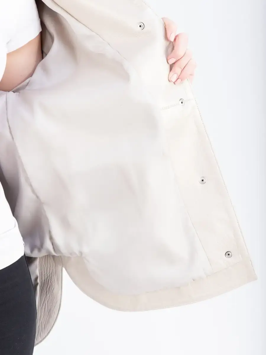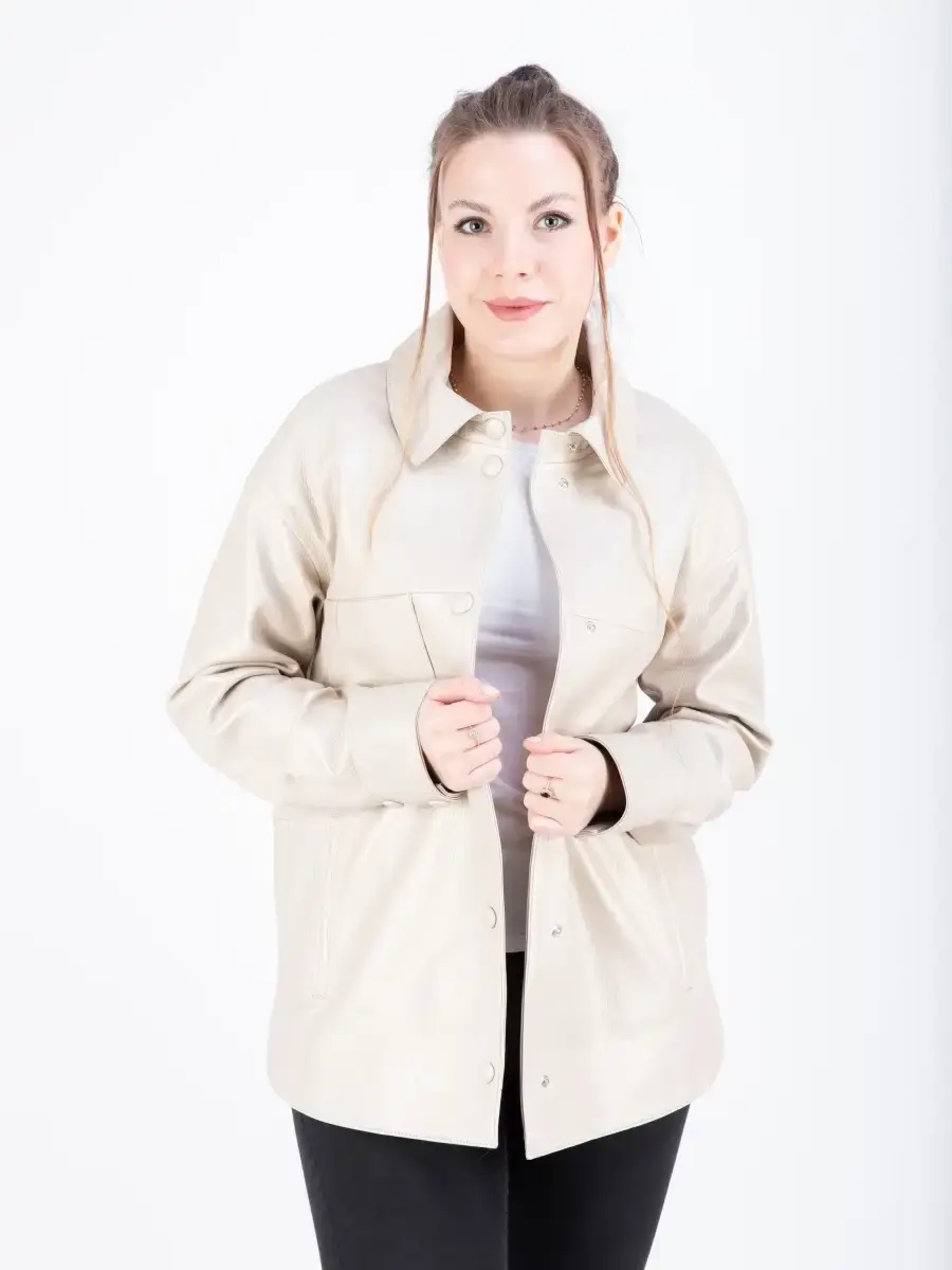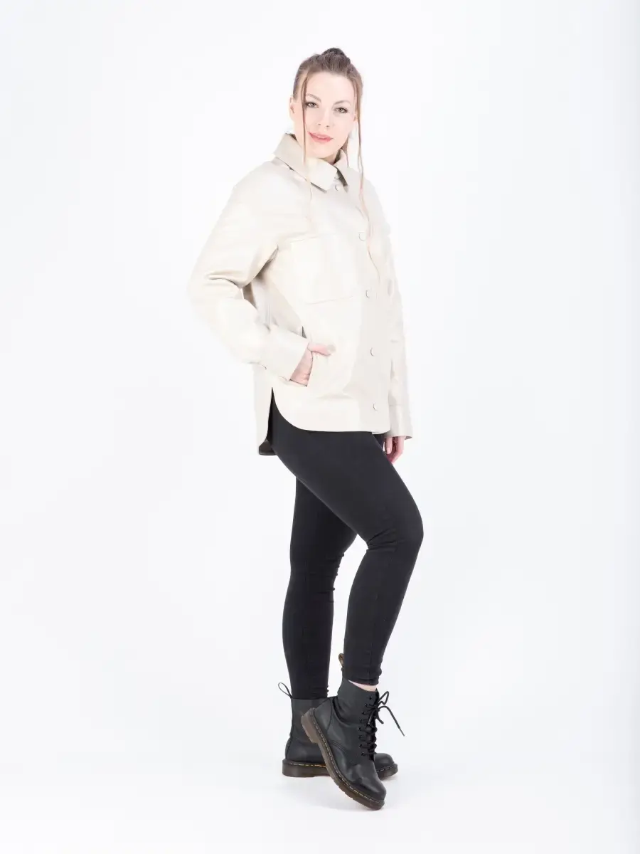 Куртка - рубашка женская из натуральной кожи ягненка. Женская куртка кожаная выполнена из прочной и в то же время из мягкой натуральной кожи. Выделка кожи фактурная - джумбо. Воротник рубашечный со стойкой. Стильная женская куртка - рубашка располагает удобным и декоративными элементами в виде разрезов по бокам и карманом на груди. Куртка женская свободного кроя не сковывает, особенно удобно при вождении автомобиля. В качестве застежки кнопки, карманы прорезные. Рукав имеет спущенную линию плеча - реглан с манжетом на кнопках. Такая стильная куртка будет радовать Вас своей универсальностью: осенью и весной ее можно носить как верхнюю одежду, а зимой под пуховик или шубу-чебурашку, что сделает Ваш образ многослойным, а значит интересным. Свободный крой рубашки позволит носить ее на теплый свитер без стеснения движений в качестве полноценной верхней одежды. Куртка женская демисезонная, короткая куртка женская, женская куртка на весну и на осень