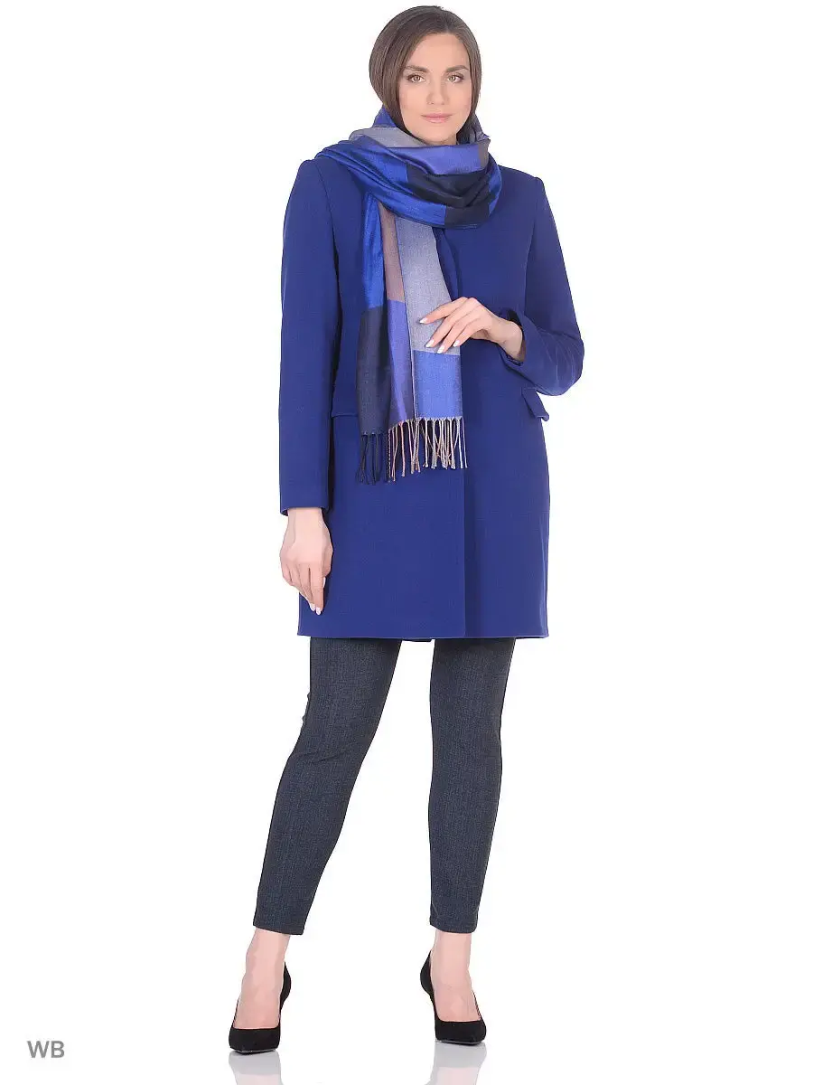 Однобортное пальто прилегающего силуэта длиной до середины бедра. Втачной рукав, воротник-стойка, накладные карманы с клапаном. Застежка на скрытые кнопки. Декорировано тамбурной строчкой и дополнено шарфом в тон.