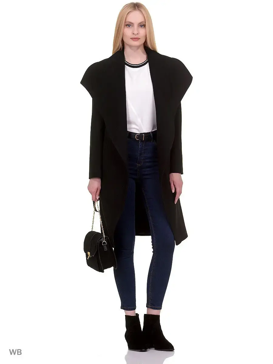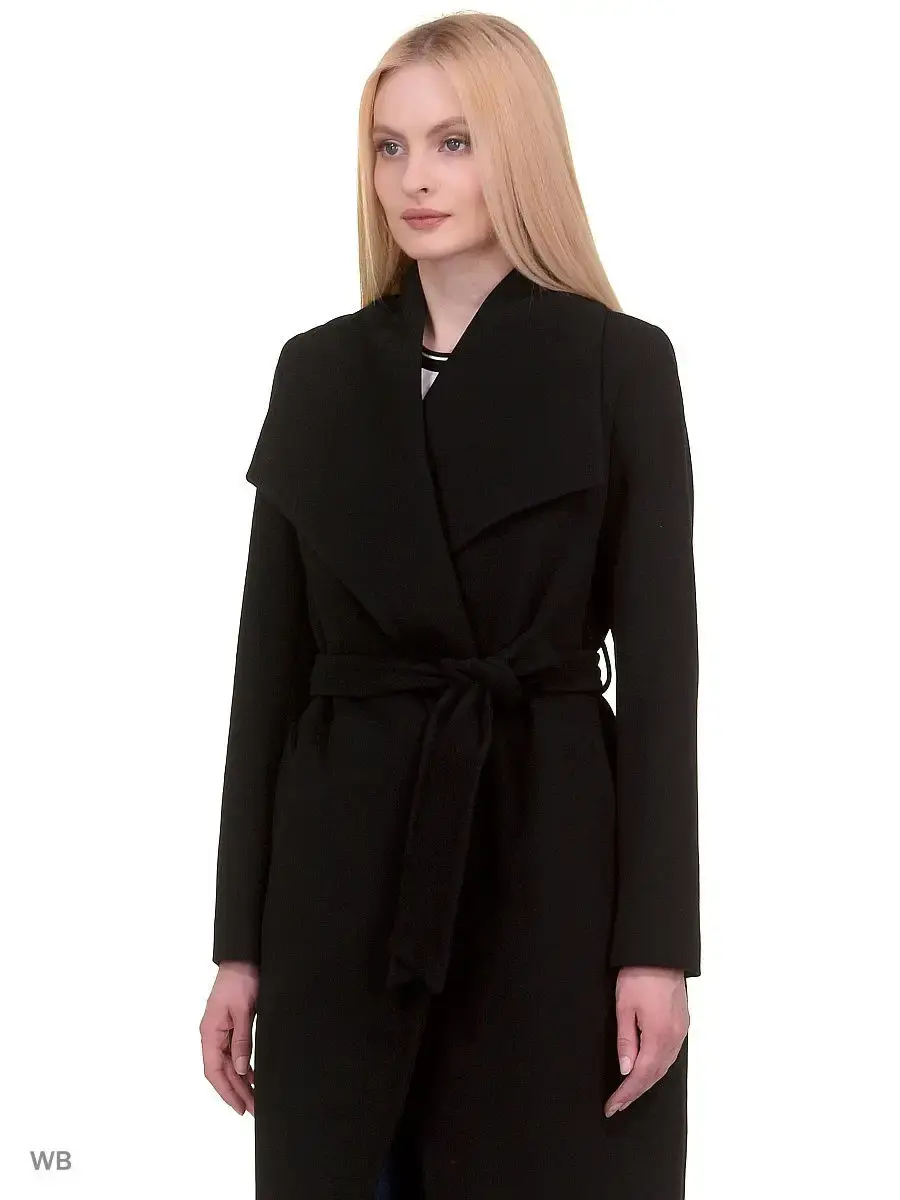 Пальто без пуговиц выше колена из пальтовой ткани. Втачной рукав, широкий воротник, карманы-листочки, пояс из основной ткани, борта полочек скошены к низу изделия. Декорировано тамбурной строчкой.