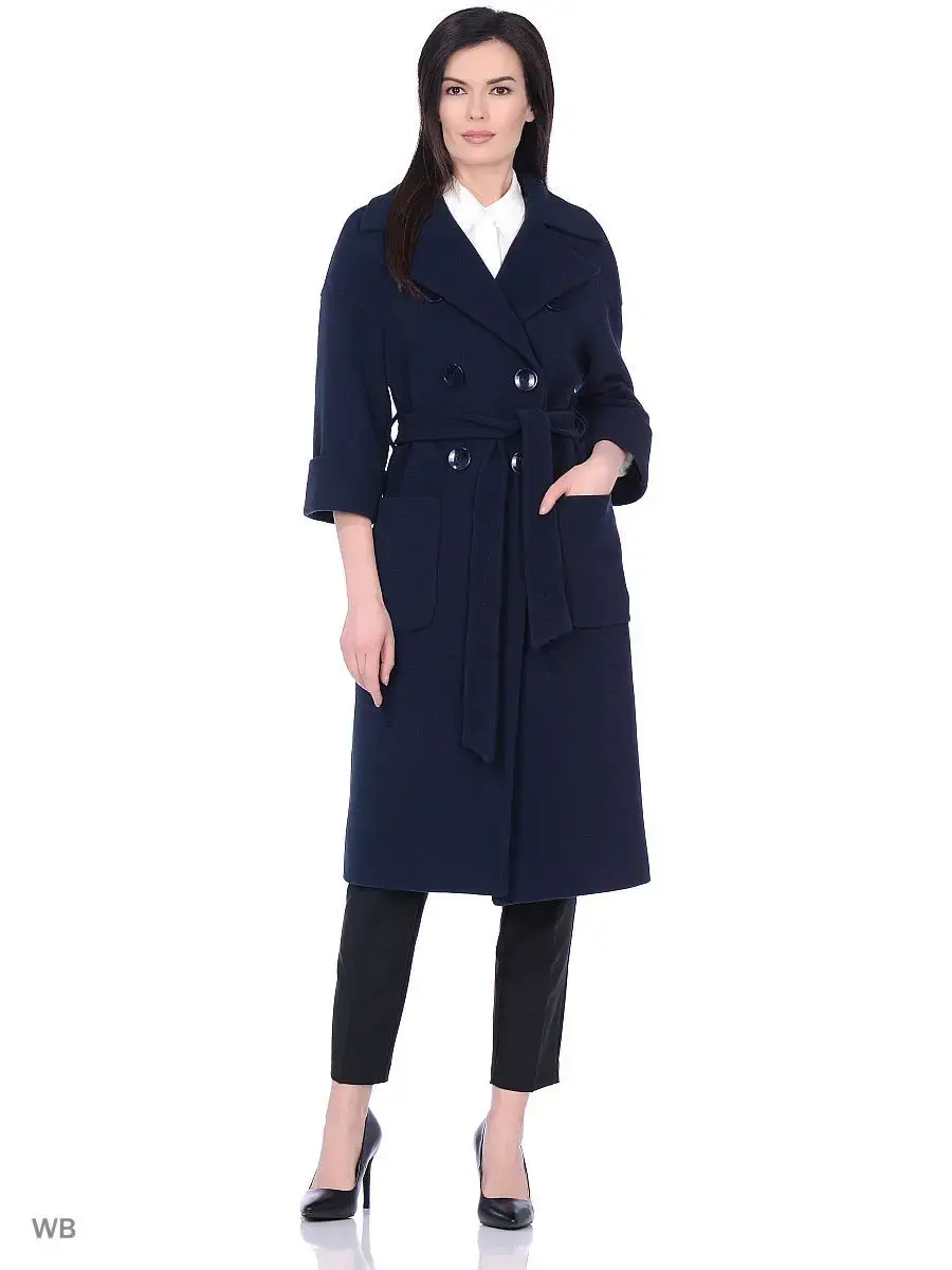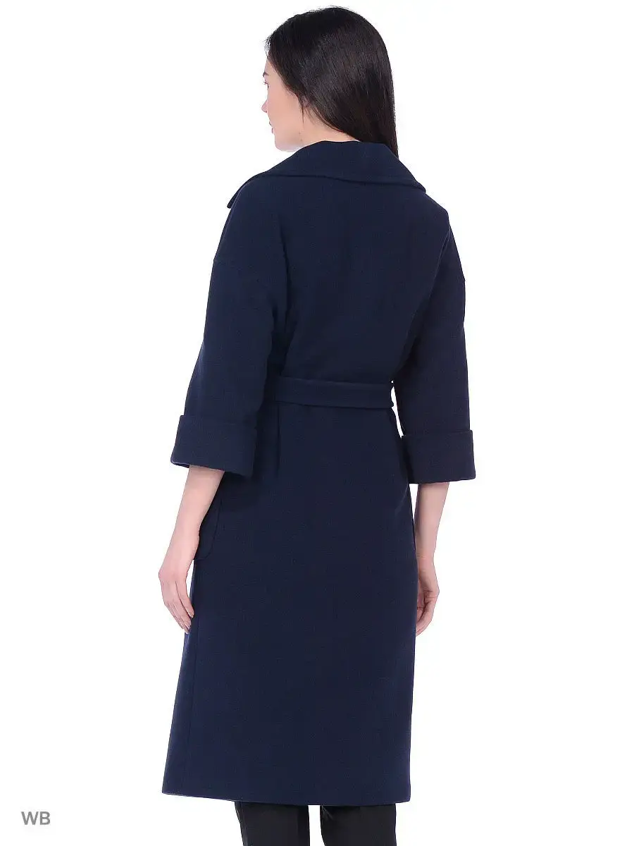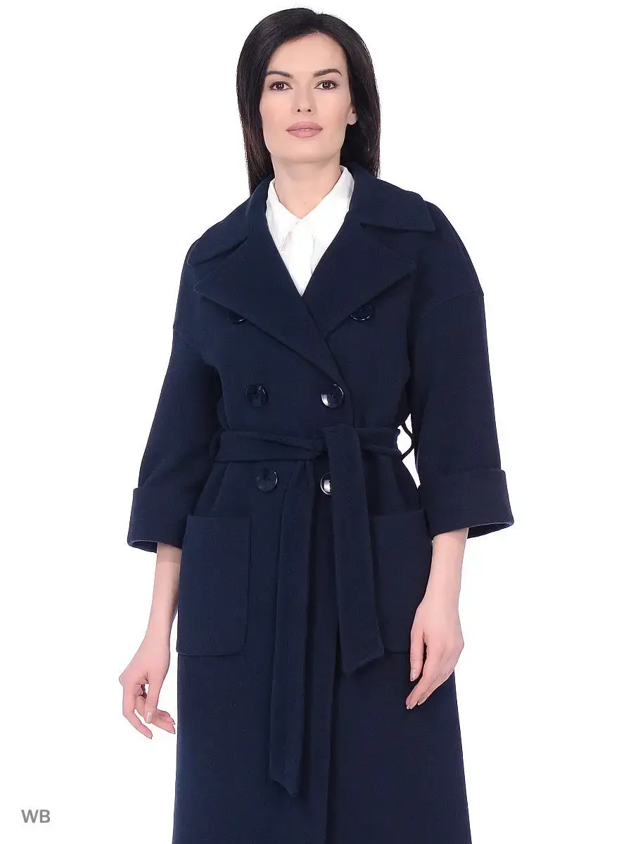 Двубортное пальто-кокон длиной чуть ниже колена. Втачный спущенный рукав длиной 3/4 с отворотом, широкий английский воротник, накладные карманы, пояс из основной ткани. Борт полочки скошен к низу изделия. Застежка на крупные пуговицы. Изделие декорировано тамбурной строчкой.