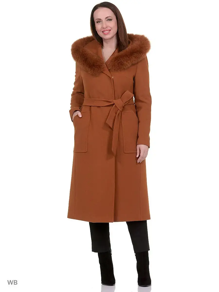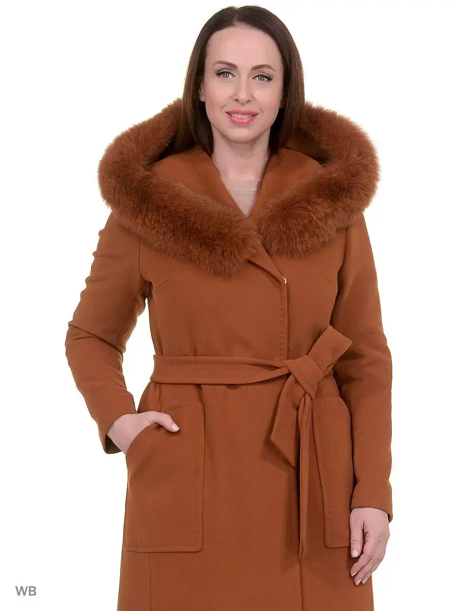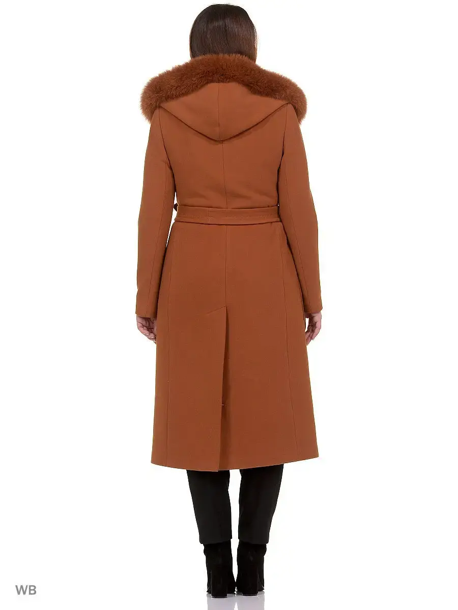Двубортное пальто прилегающего силуэта длиной чуть ниже колена. Втачной рукав, большой капюшон, накладные карманы, пояс из основной ткани. Застежка на скрытые кнопки. По длине капюшона отделка из натурального меха песца (мех съёмный).