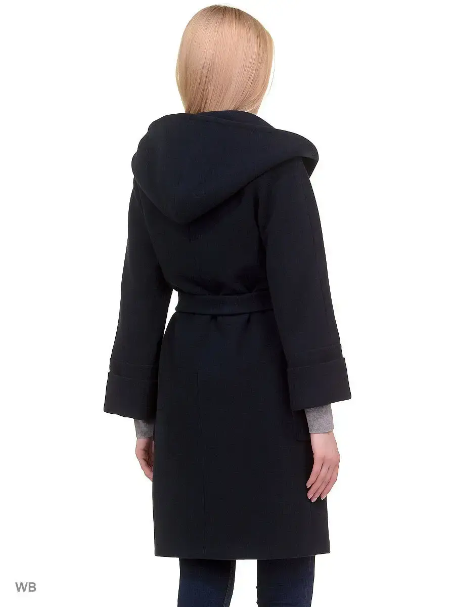 Пальто-халат прямого силуэта длиной чуть выше колена. Цельнокроенный рукав длиной 7/8 с отрезной деталью по низу с отворотом, большой капюшон, накладные карманы, пояс из основной ткани. Декорировано тамбурной строчкой.