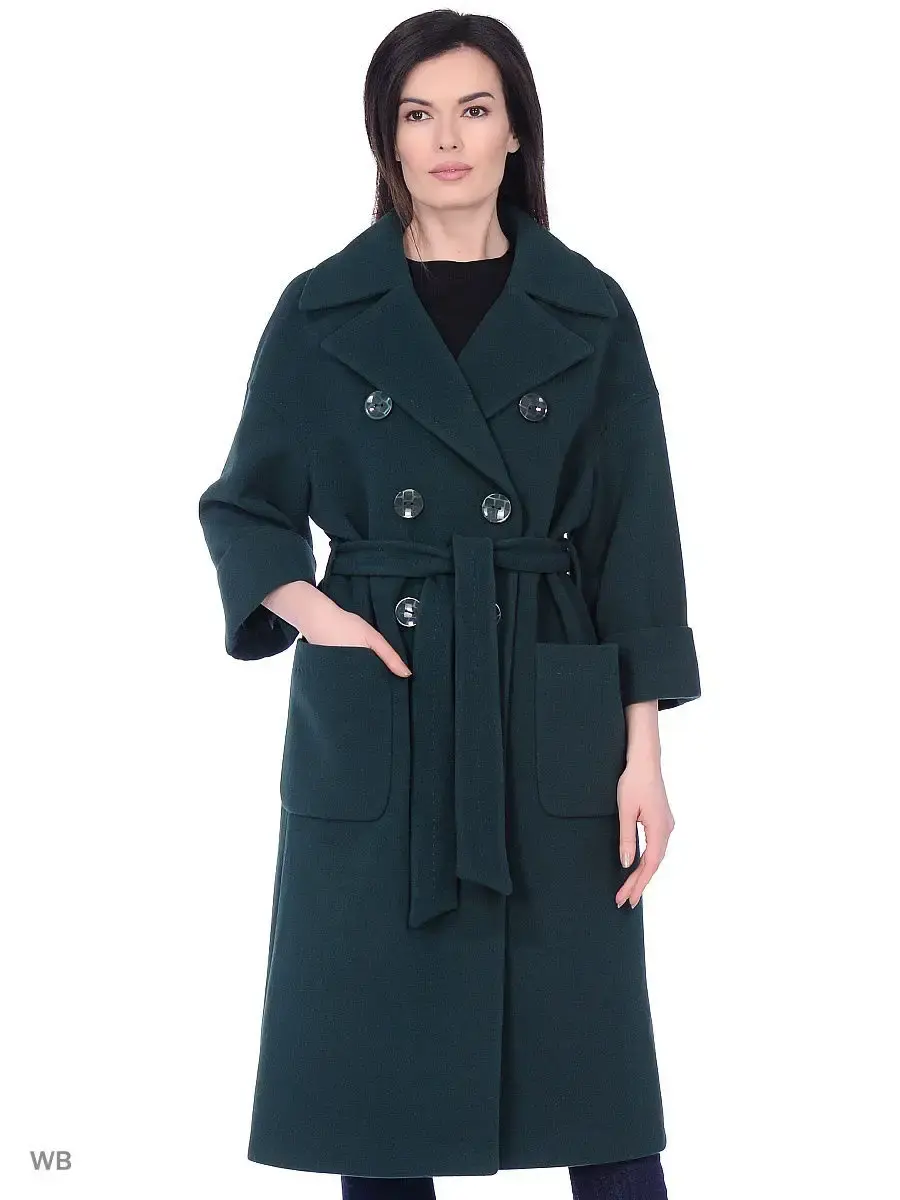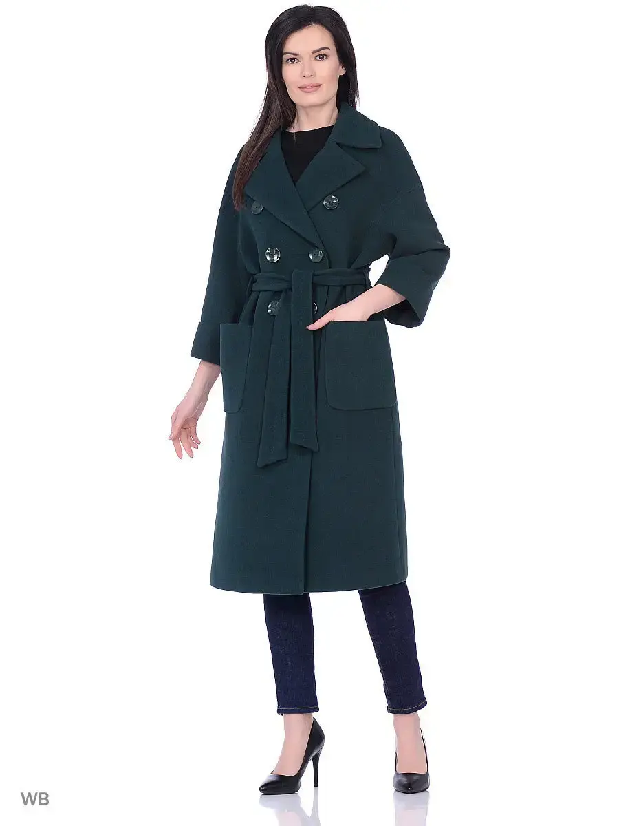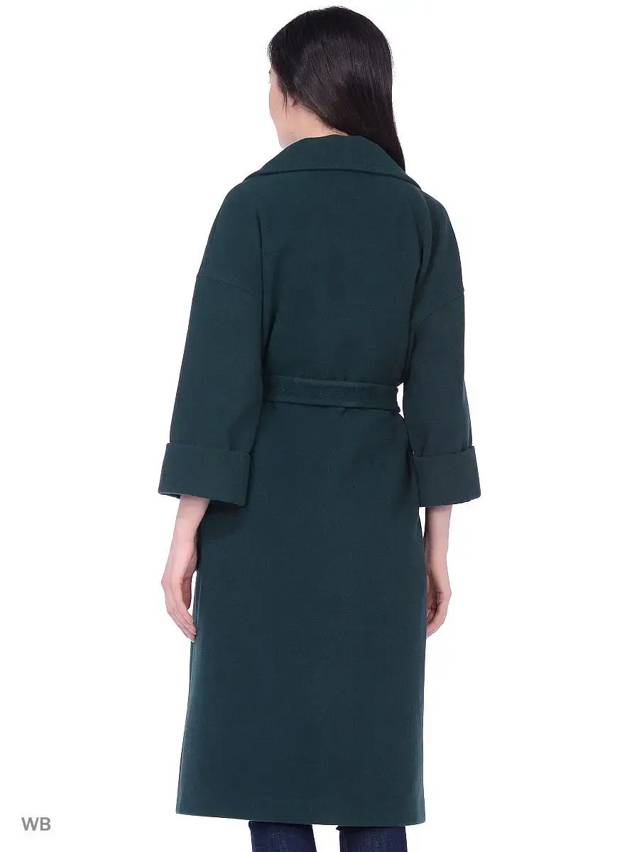 Двубортное пальто-кокон длиной чуть ниже колена. Втачный спущенный рукав длиной 3/4 с отворотом, широкий английский воротник, накладные карманы, пояс из основной ткани. Борт полочки скошен к низу изделия. Застежка на крупные пуговицы. Изделие декорировано тамбурной строчкой.