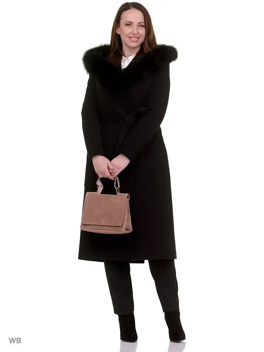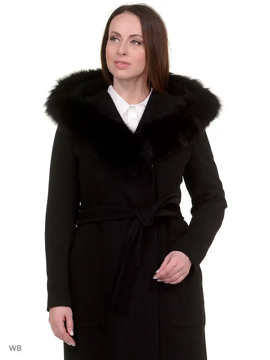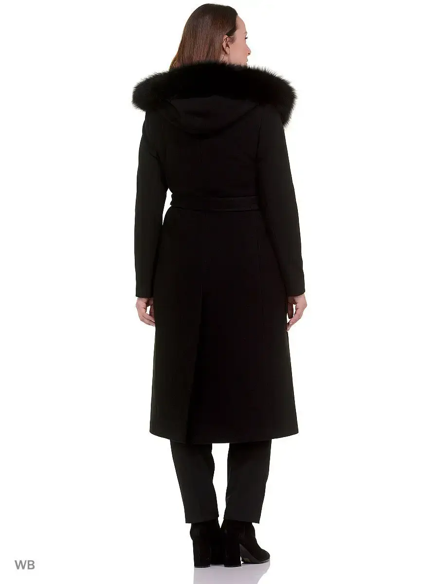 Двубортное пальто прилегающего силуэта длиной чуть ниже колена. Втачной рукав, большой капюшон, накладные карманы, пояс из основной ткани. Застежка на скрытые кнопки. По длине капюшона отделка из натурального меха песца (мех съёмный).