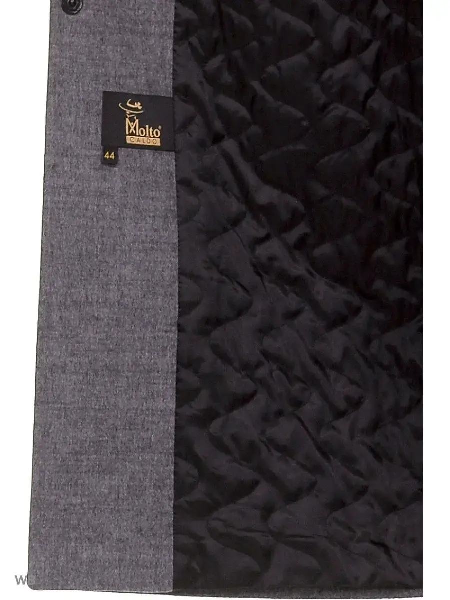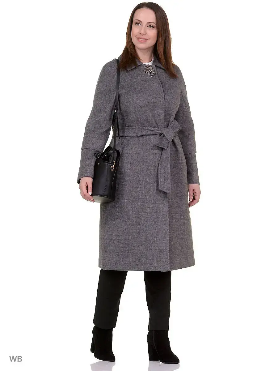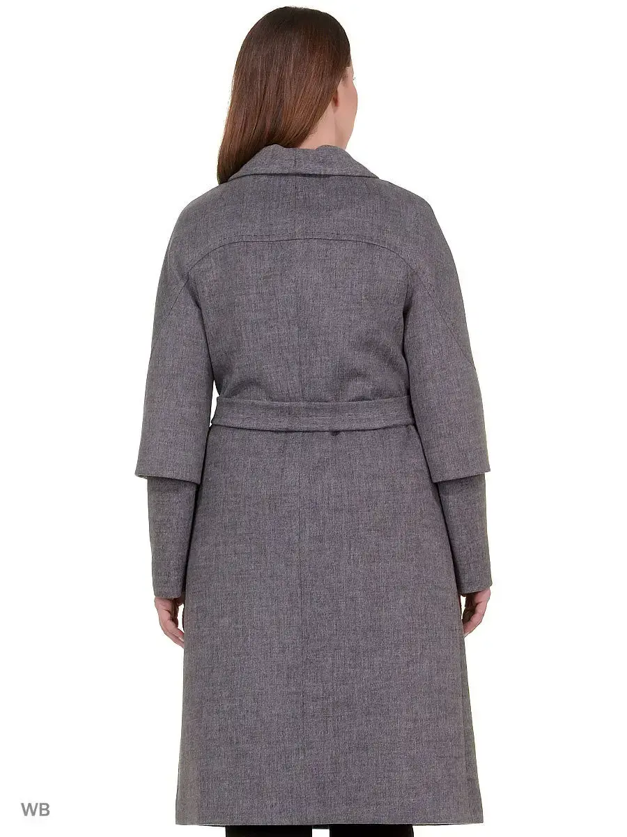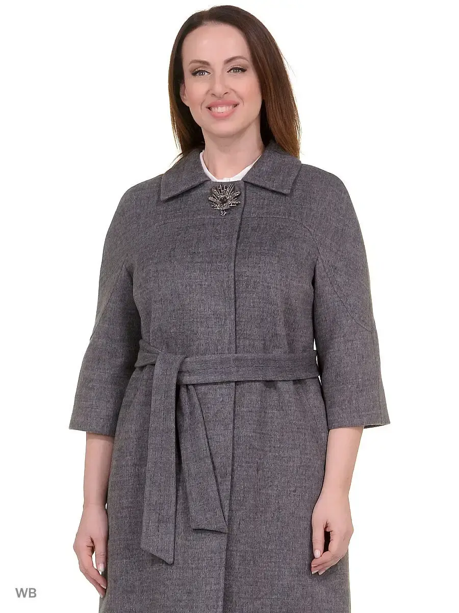 Однобортное пальто А-силуэта длиной до середины икры. Рукав-реглан длиной 3/4 дополнен съемным внутренним рукавом, отложной съемный воротник, карманы-листочки. Застежка на скрытые кнопки. Декорировано горизонтальным волнистым отрезом, проходящим через рукава и полочки. Украшено брошью.